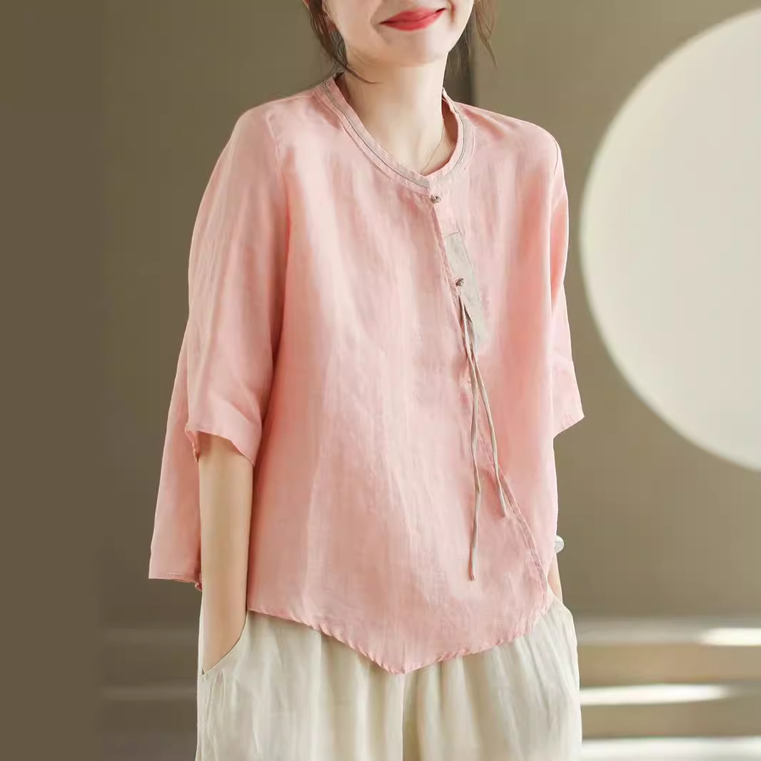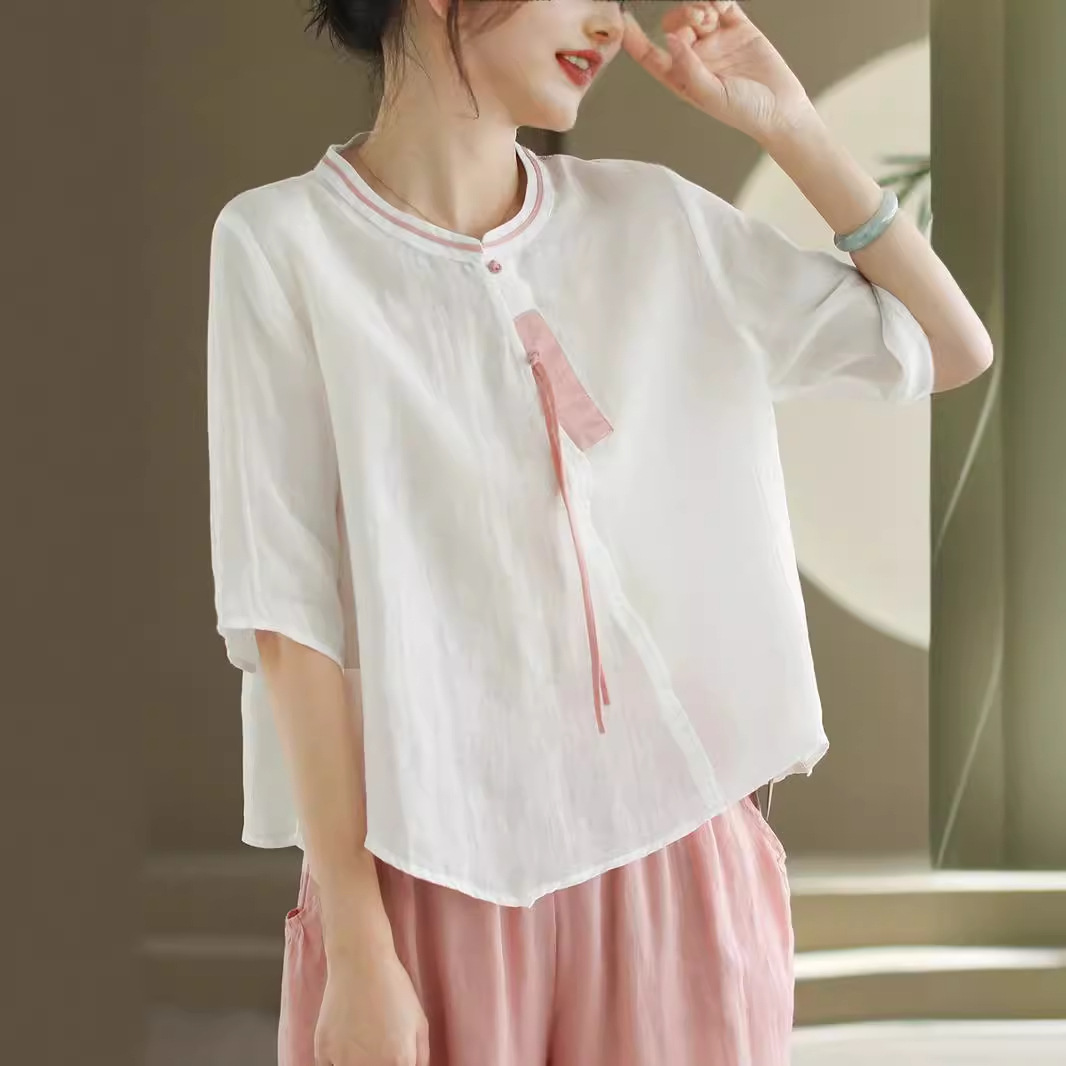2024 빈티지 새로운 중국 스타일 파인 라미 미드 슬리브 셔츠 여성용 하프 오픈 라운드 넥 컬러 블록 탑