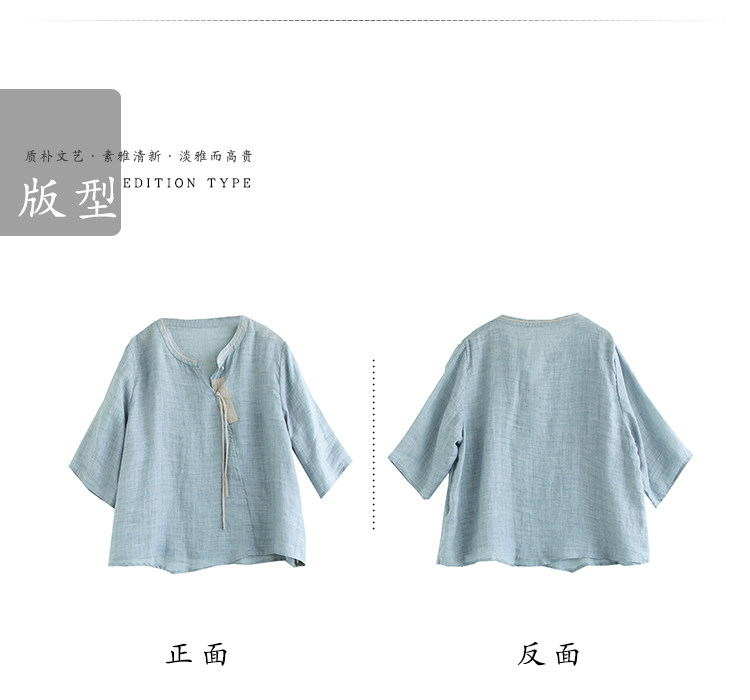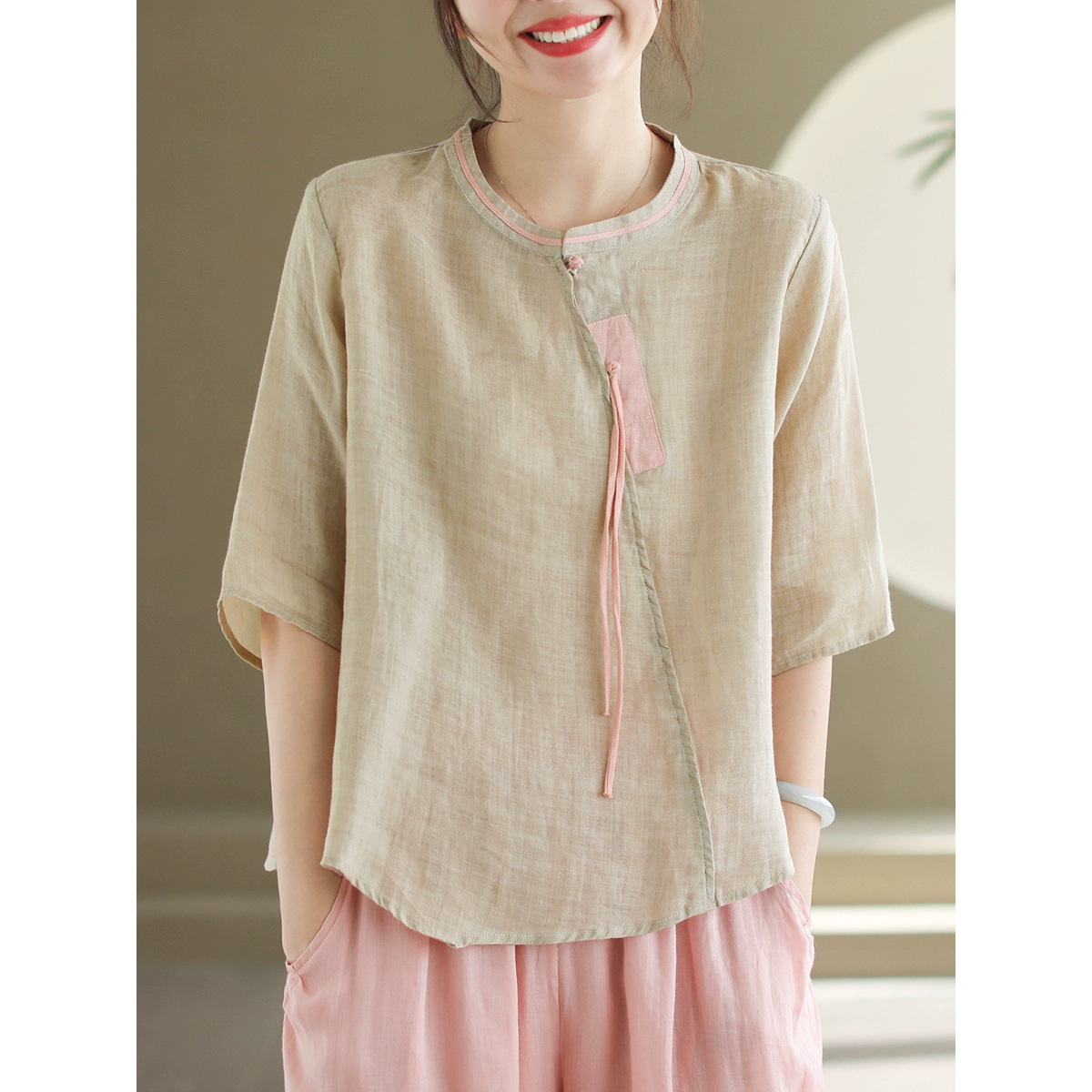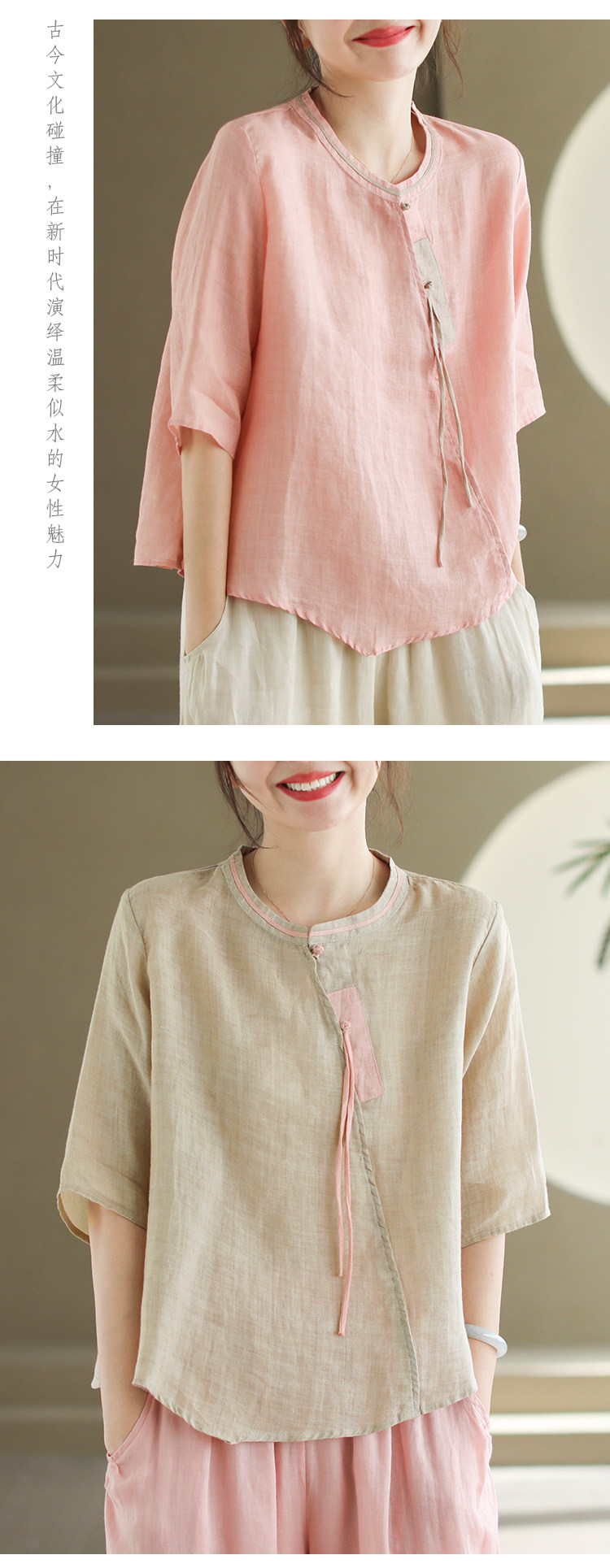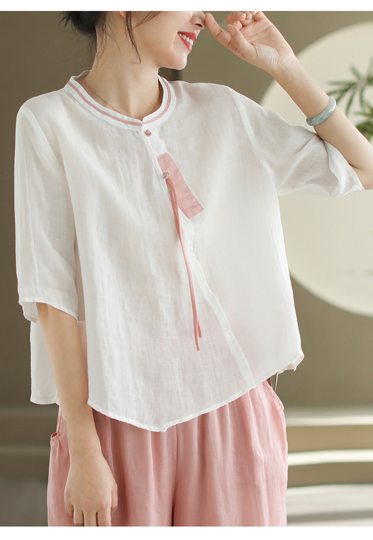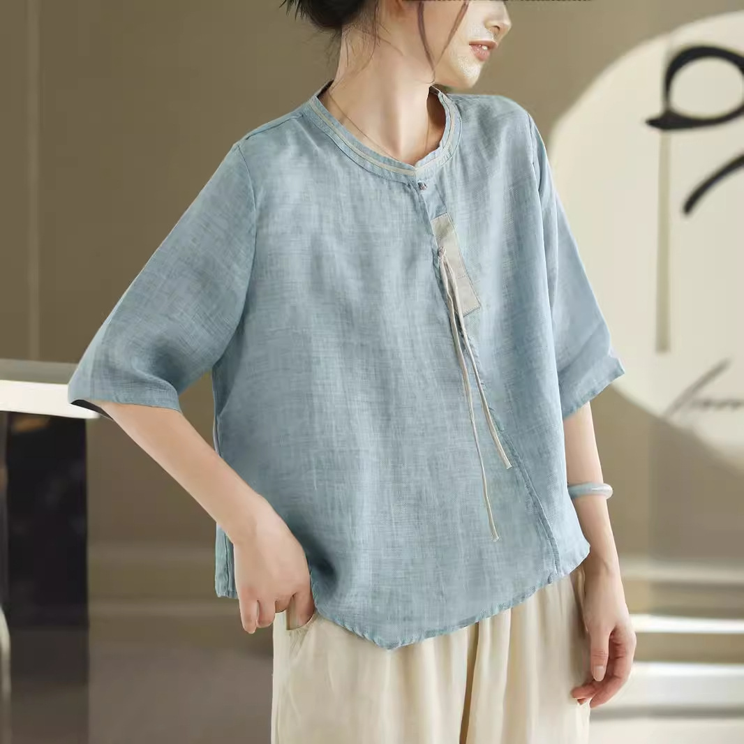 2024 빈티지 새로운 중국 스타일 파인 라미 미드 슬리브 셔츠 여성용 하프 오픈 라운드 넥 컬러 블록 탑스토어 가기