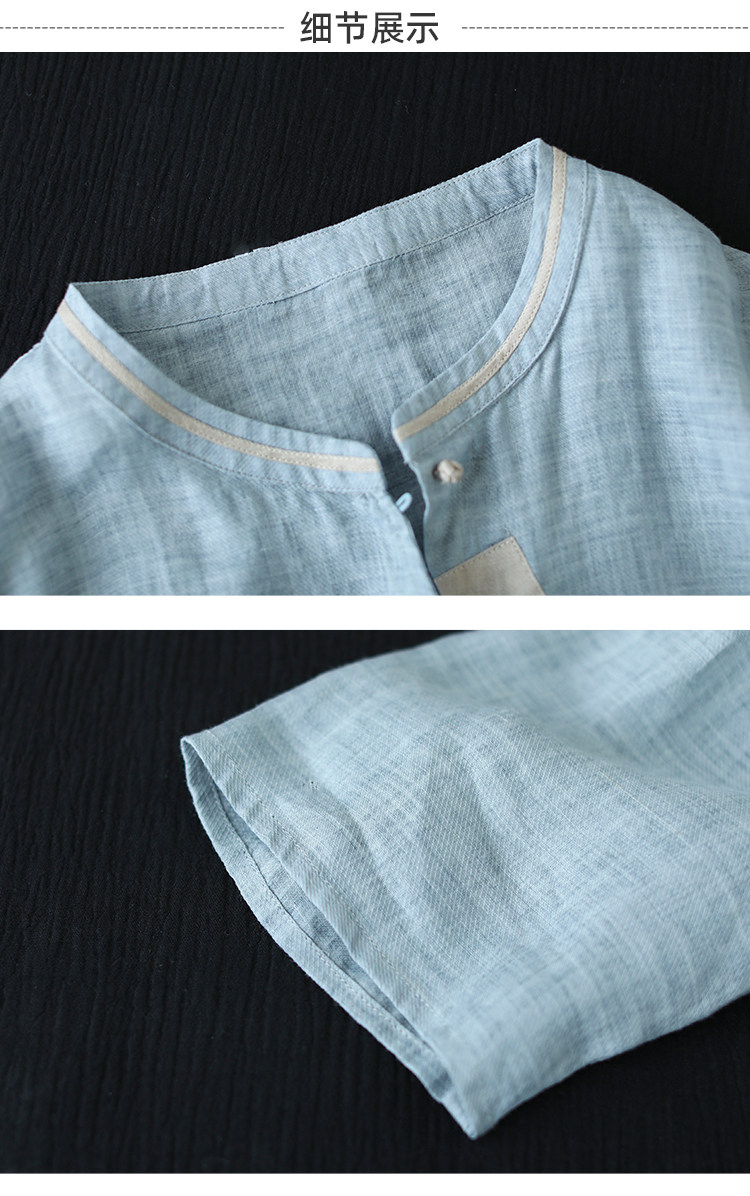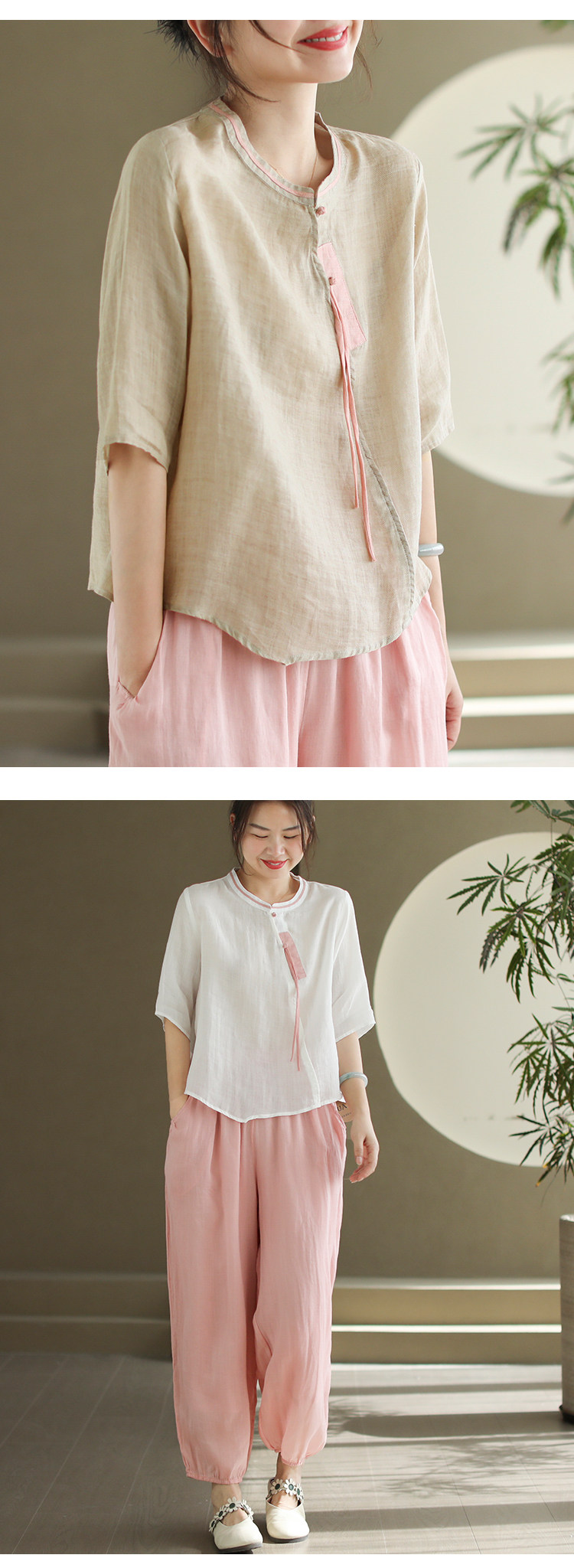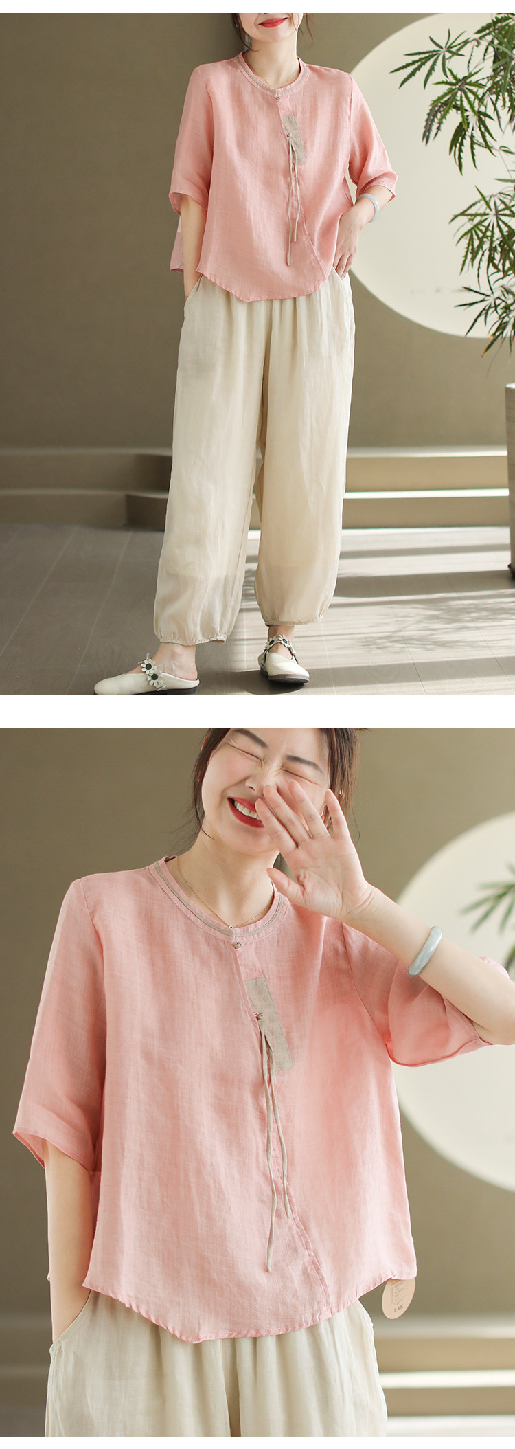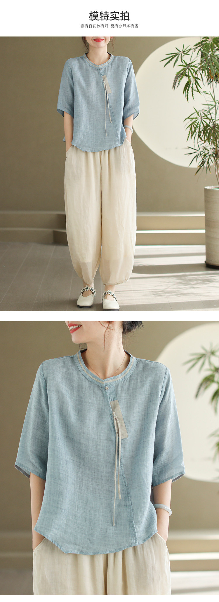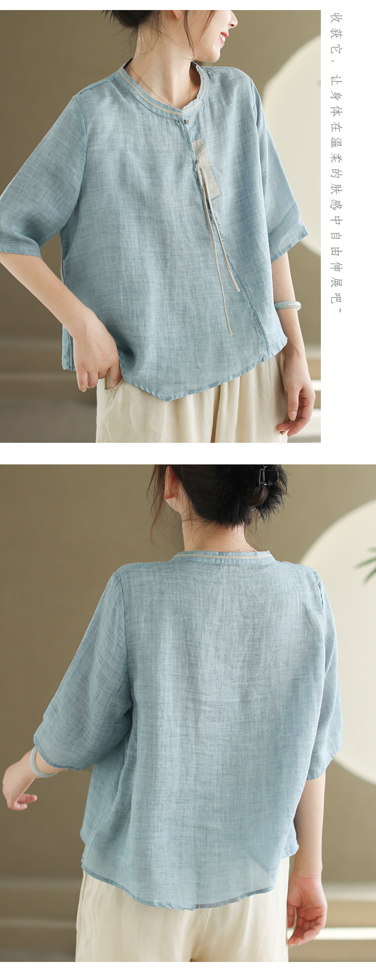 2024 빈티지 새로운 중국 스타일 파인 라미 미드 슬리브 셔츠 여성용 하프 오픈 라운드 넥 컬러 블록 탑스토어 가기