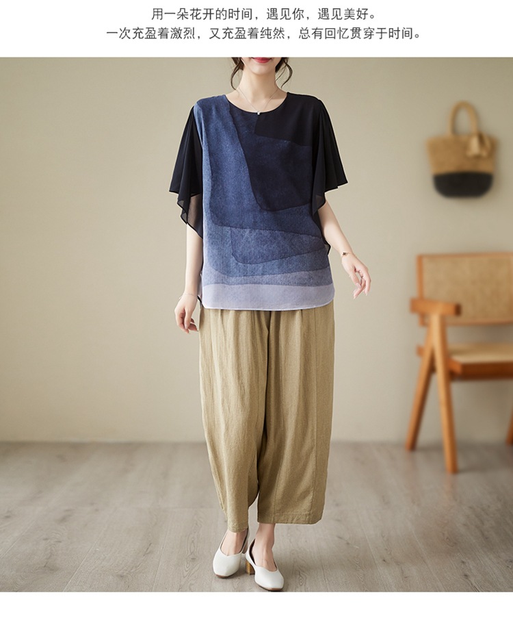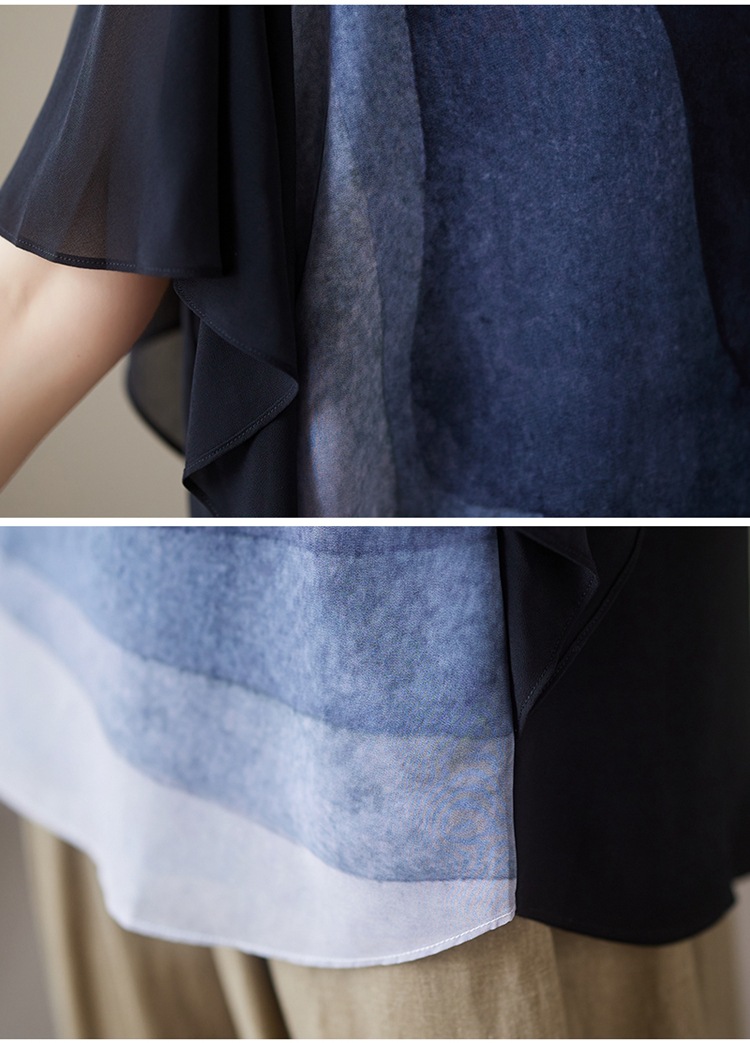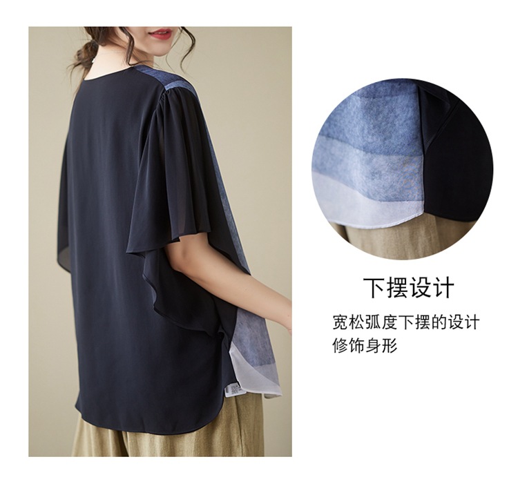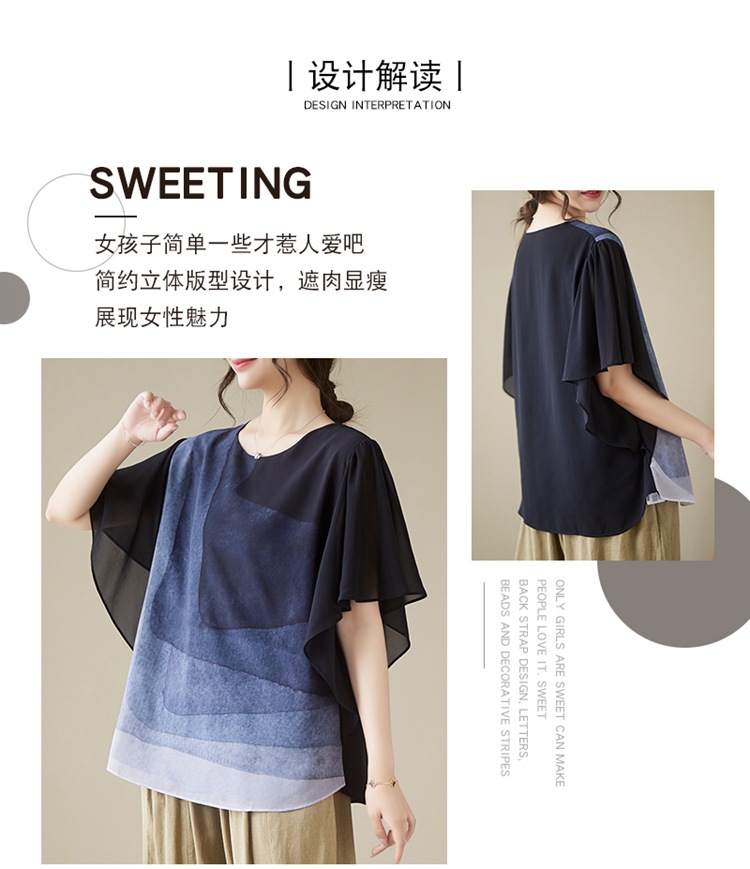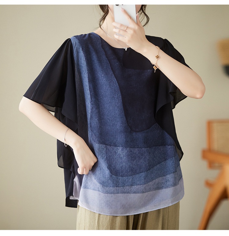 여름 일본과 한국의 새로운 예술 여성 둥근 목 불규칙한 느슨한 시폰 셔츠 여성의 배꼽 덮음 슬리밍 탑