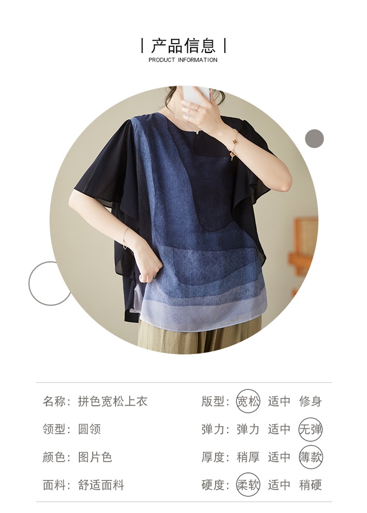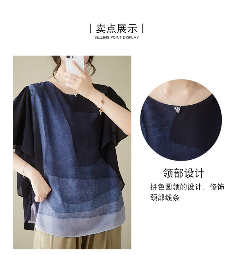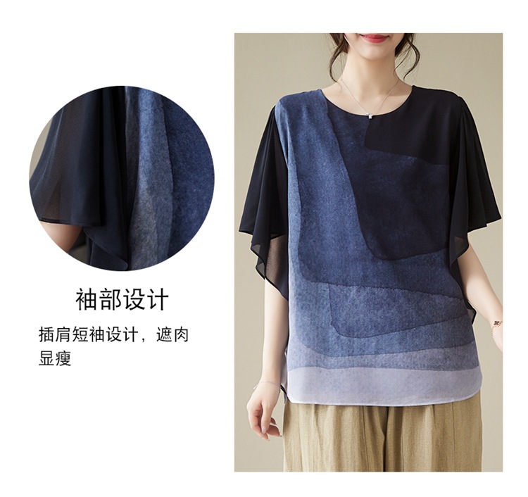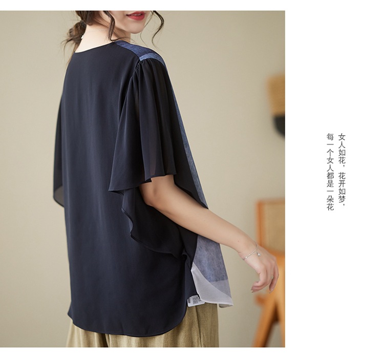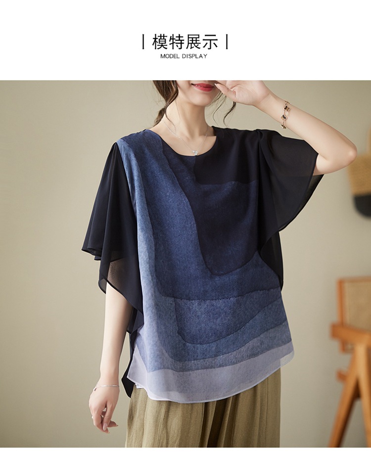 여름 일본과 한국의 새로운 예술 여성 둥근 목 불규칙한 느슨한 시폰 셔츠 여성의 배꼽 덮음 슬리밍 탑