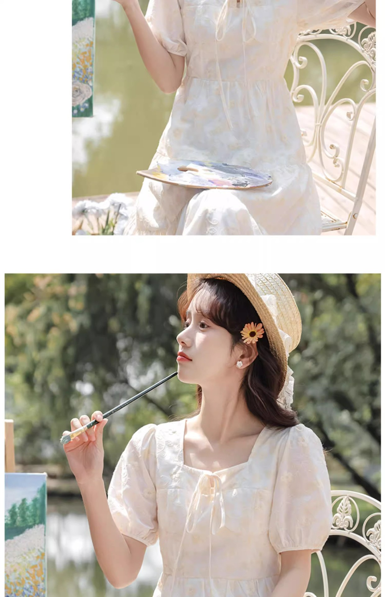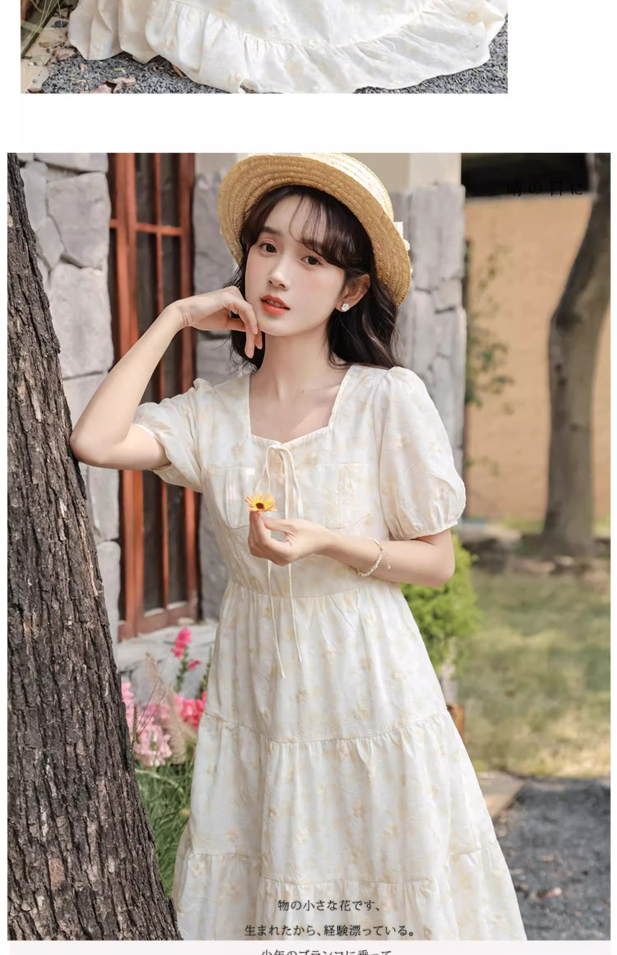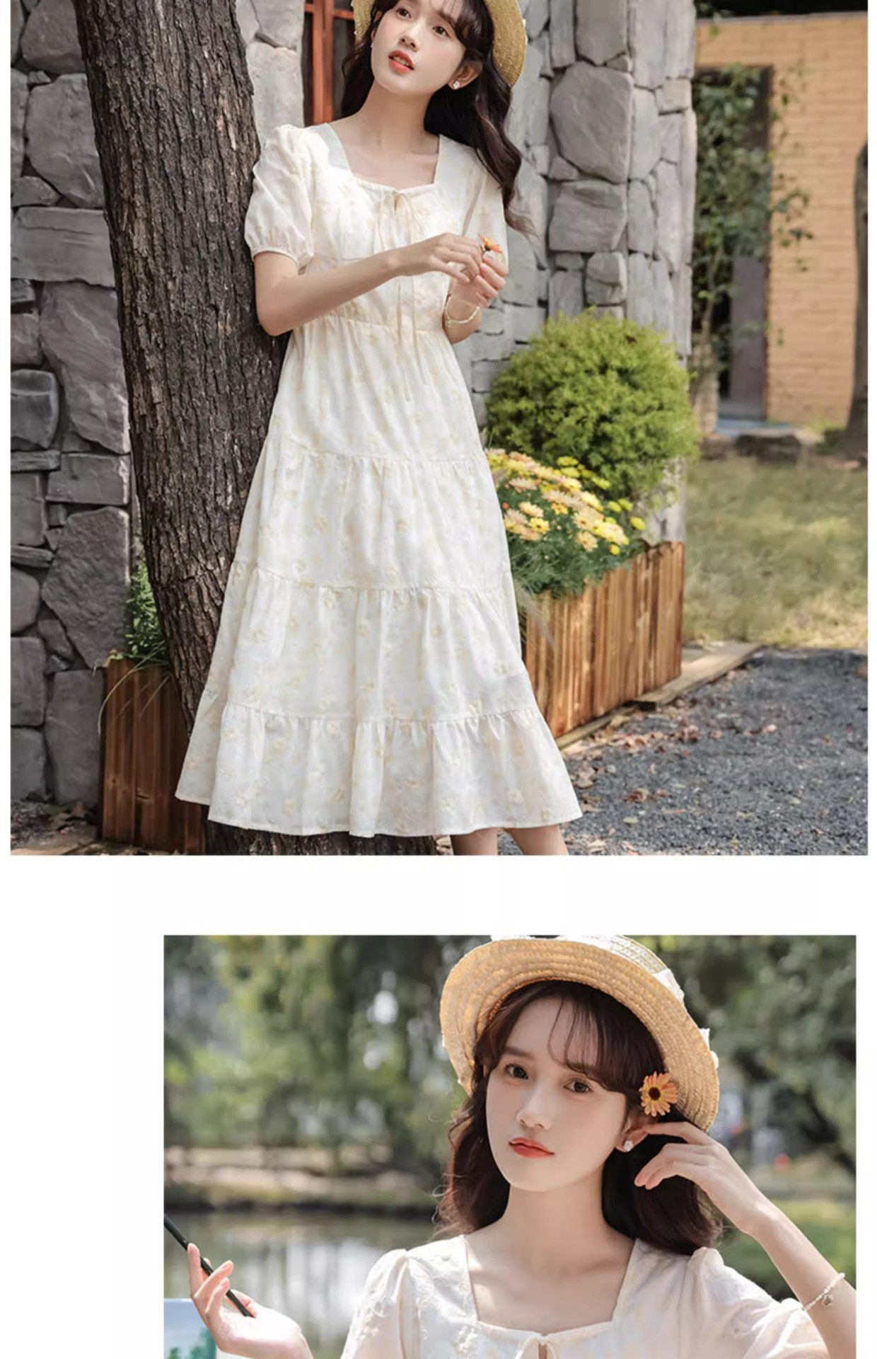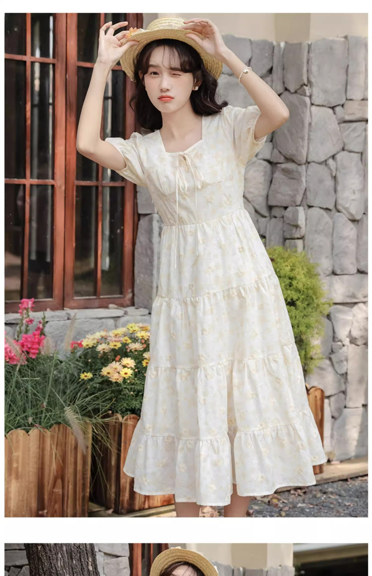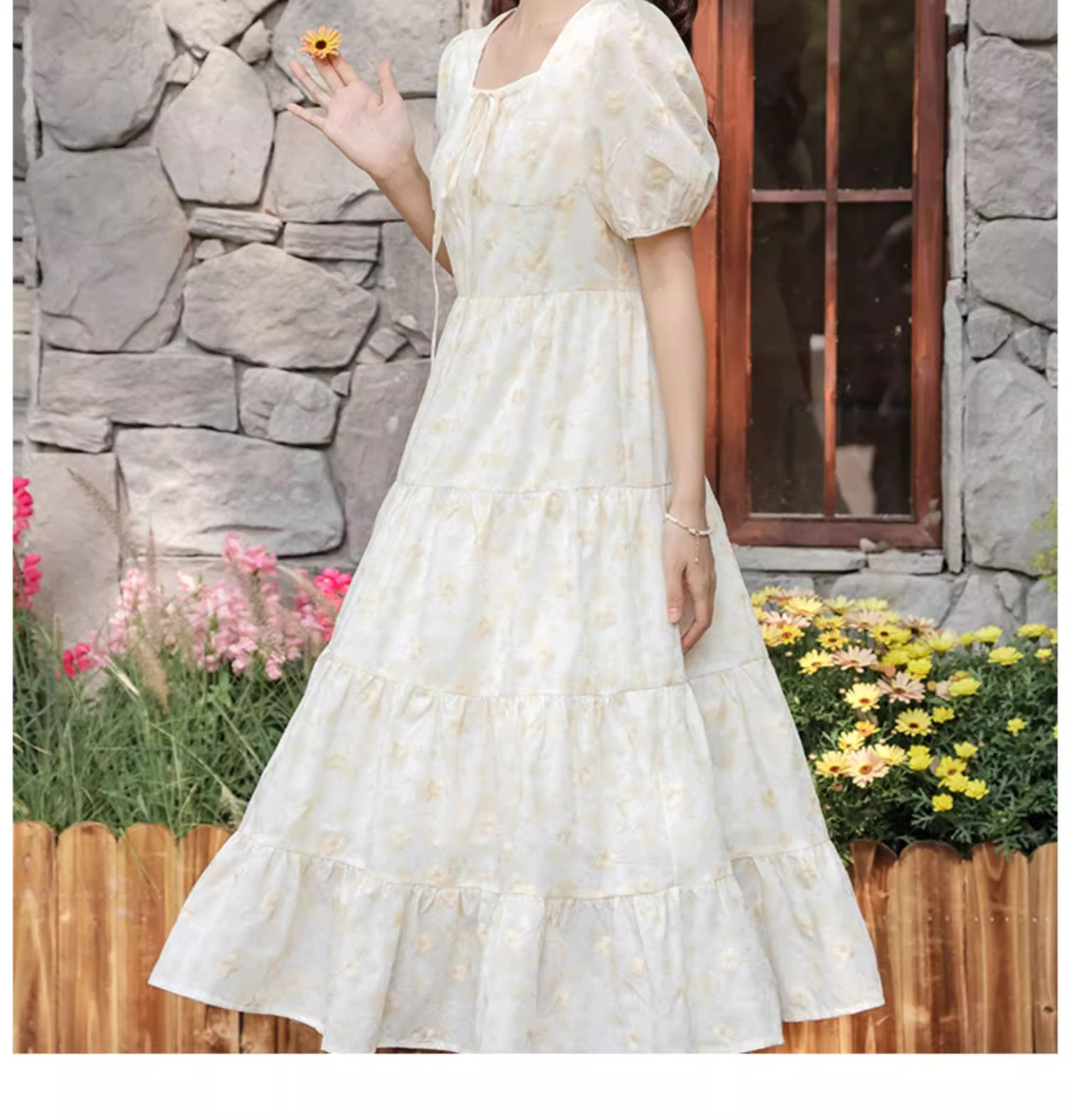 여름 2024 새로운 스타일 차 브레이크 프랑스 스타일 레트로 타이트 허리 꽃 원피스 여성용 퍼프 슬리브 스퀘어 칼라 A 라인 스커트