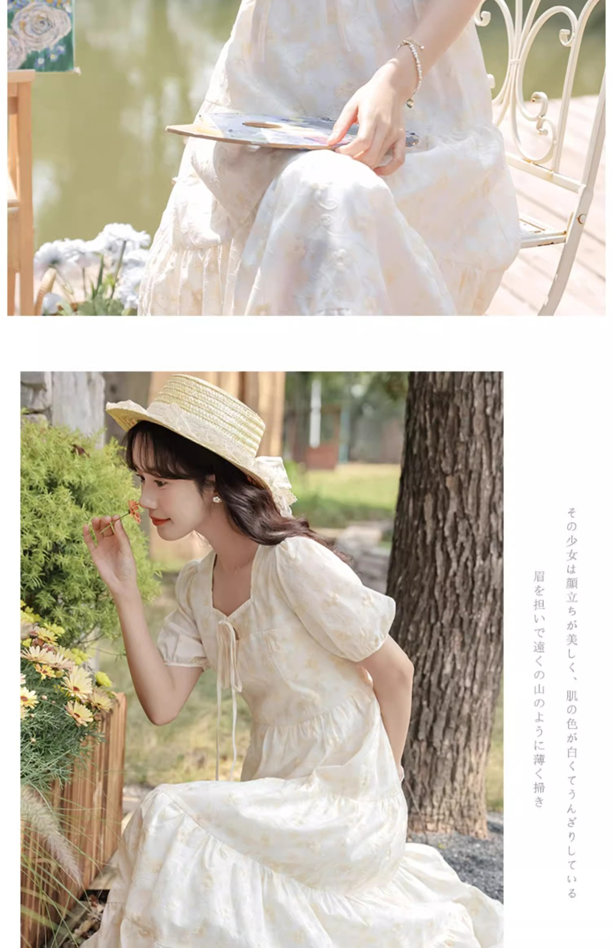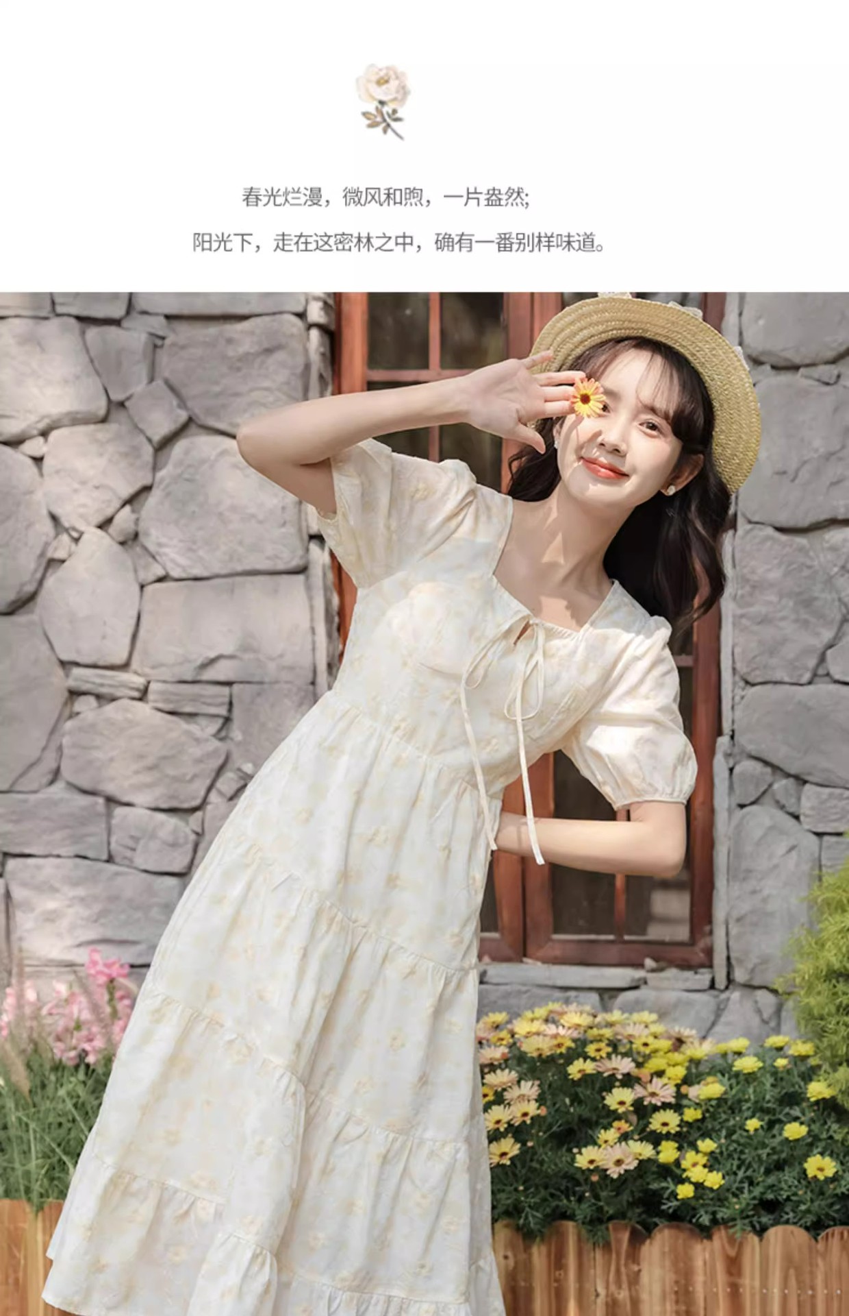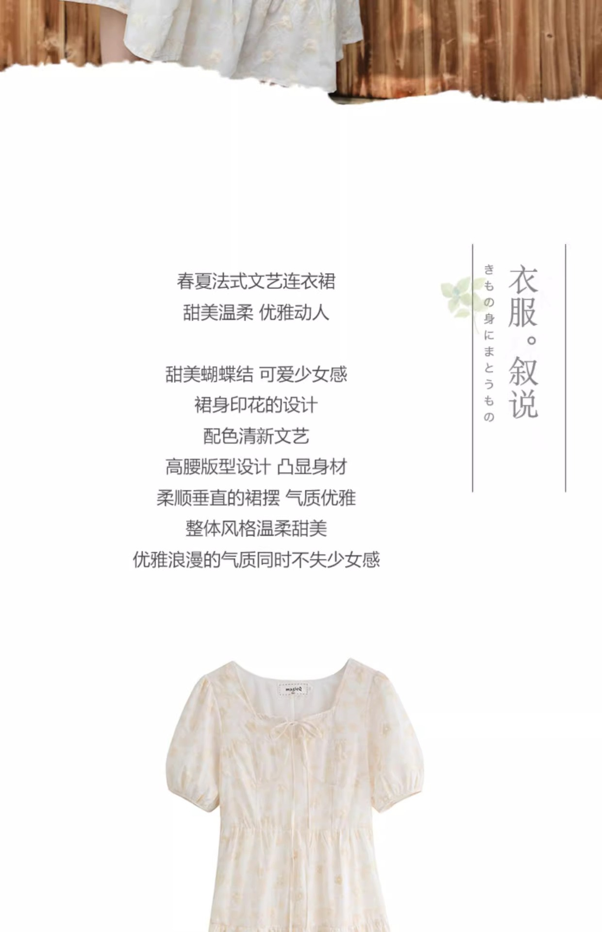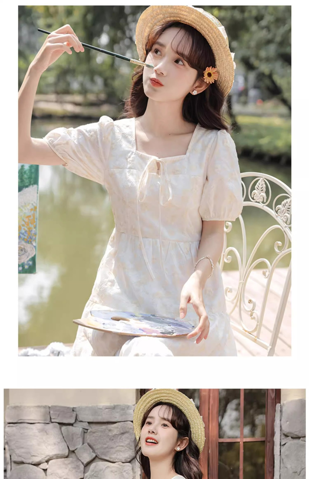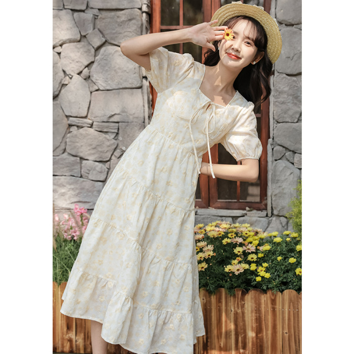 여름 2024 새로운 스타일 차 브레이크 프랑스 스타일 레트로 타이트 허리 꽃 원피스 여성용 퍼프 슬리브 스퀘어 칼라 A 라인 스커트