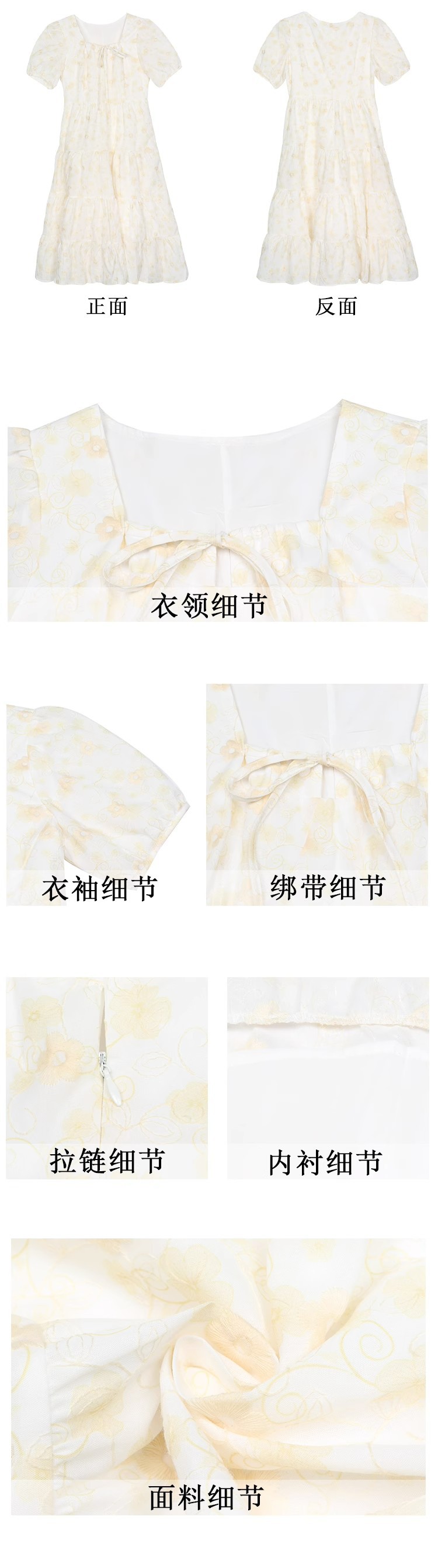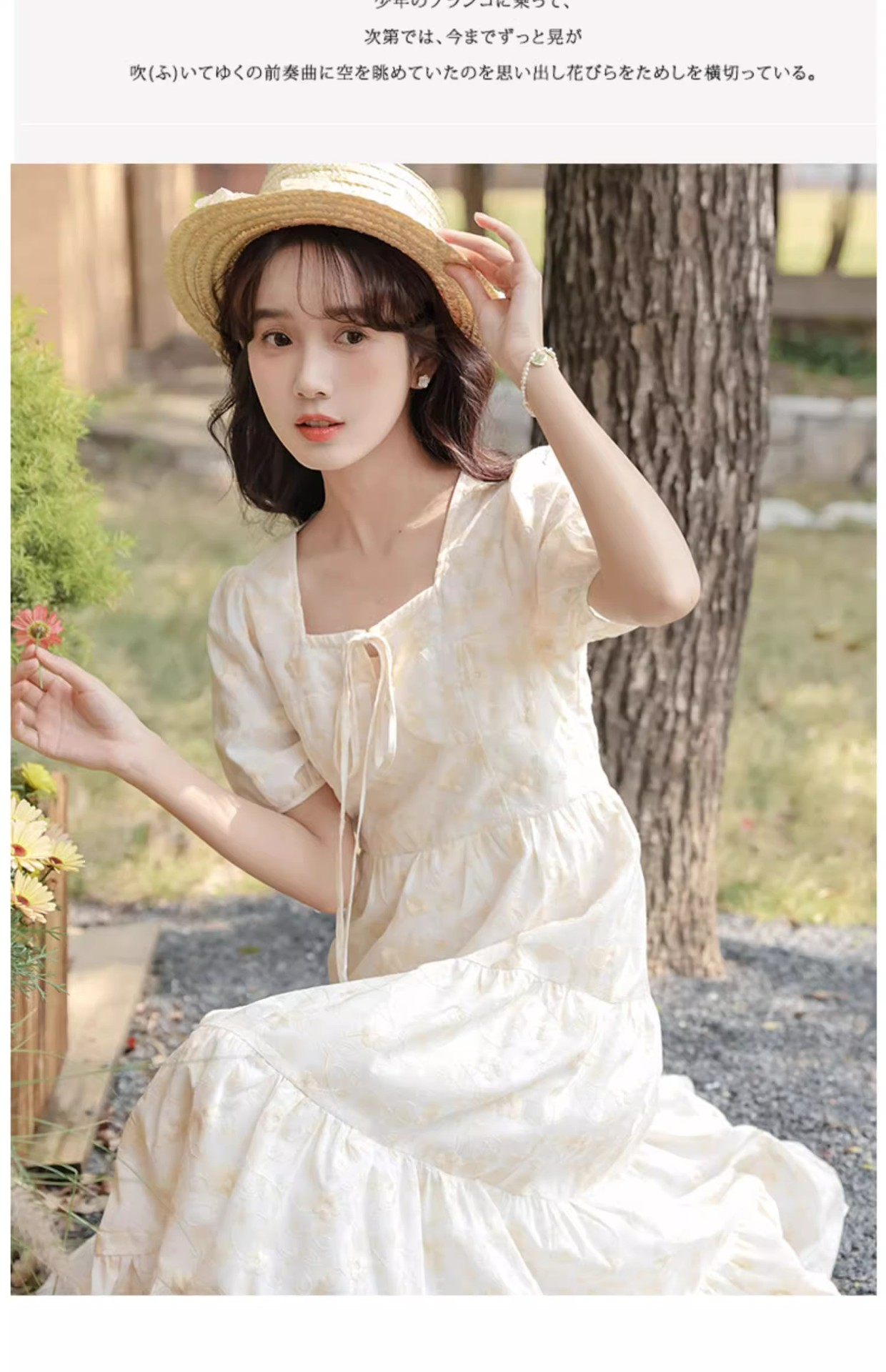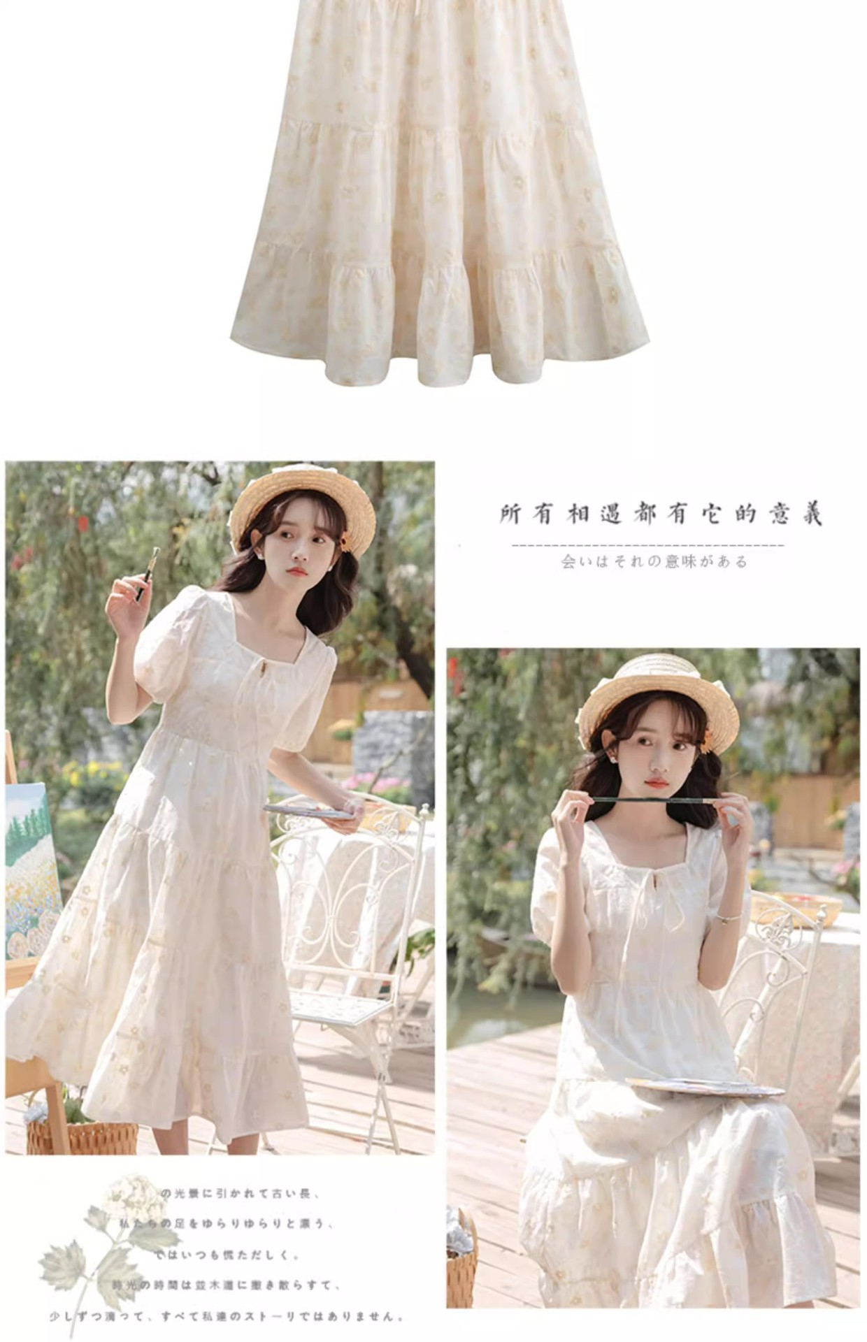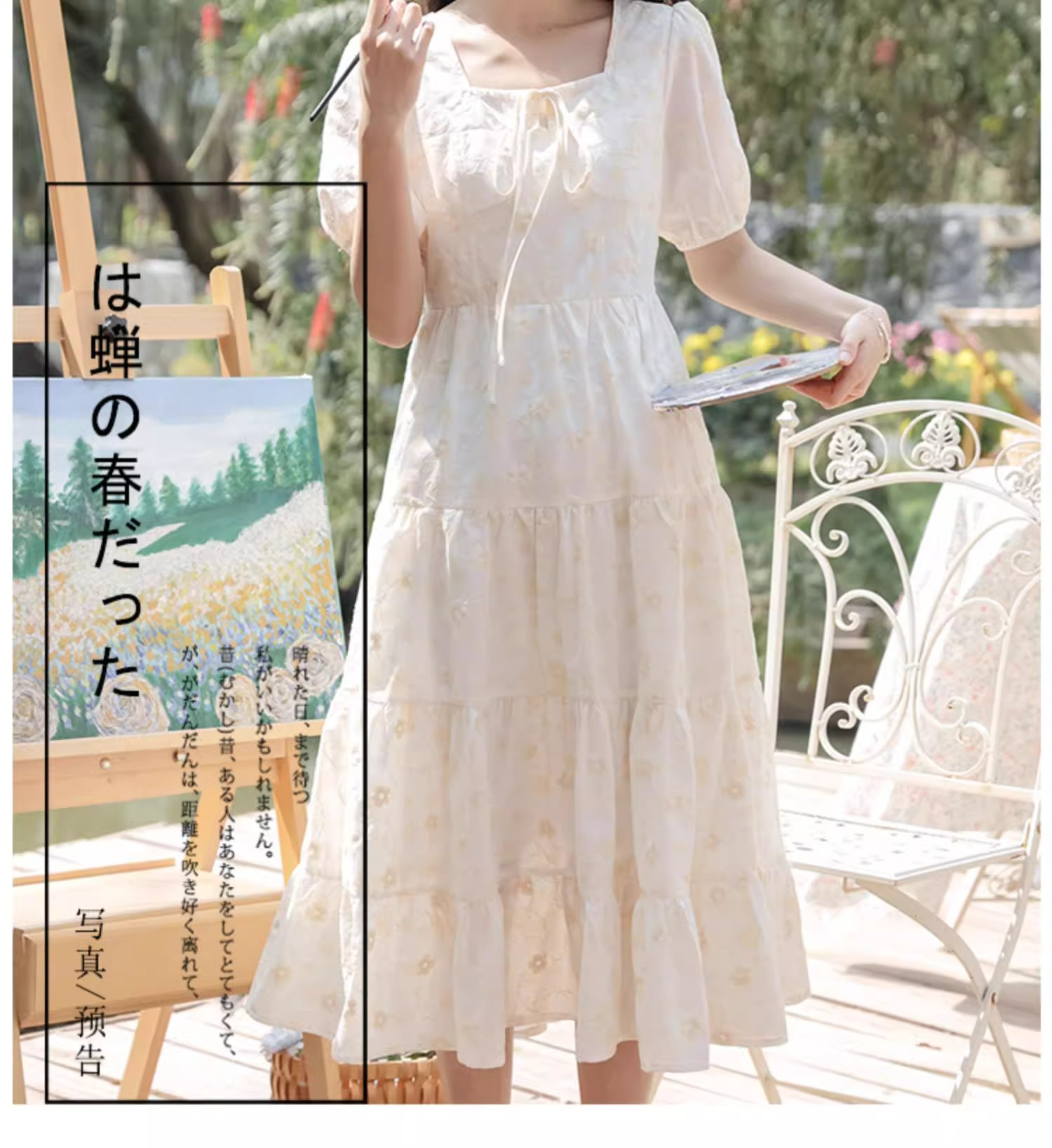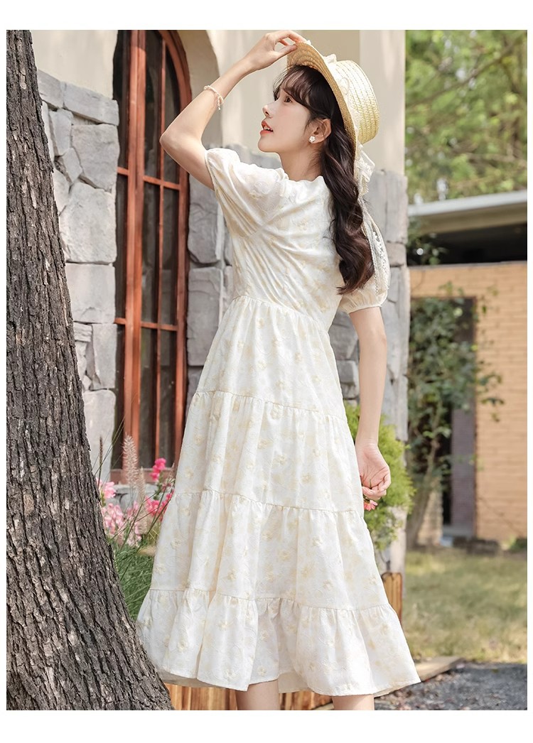 여름 2024 새로운 스타일 차 브레이크 프랑스 스타일 레트로 타이트 허리 꽃 원피스 여성용 퍼프 슬리브 스퀘어 칼라 A 라인 스커트