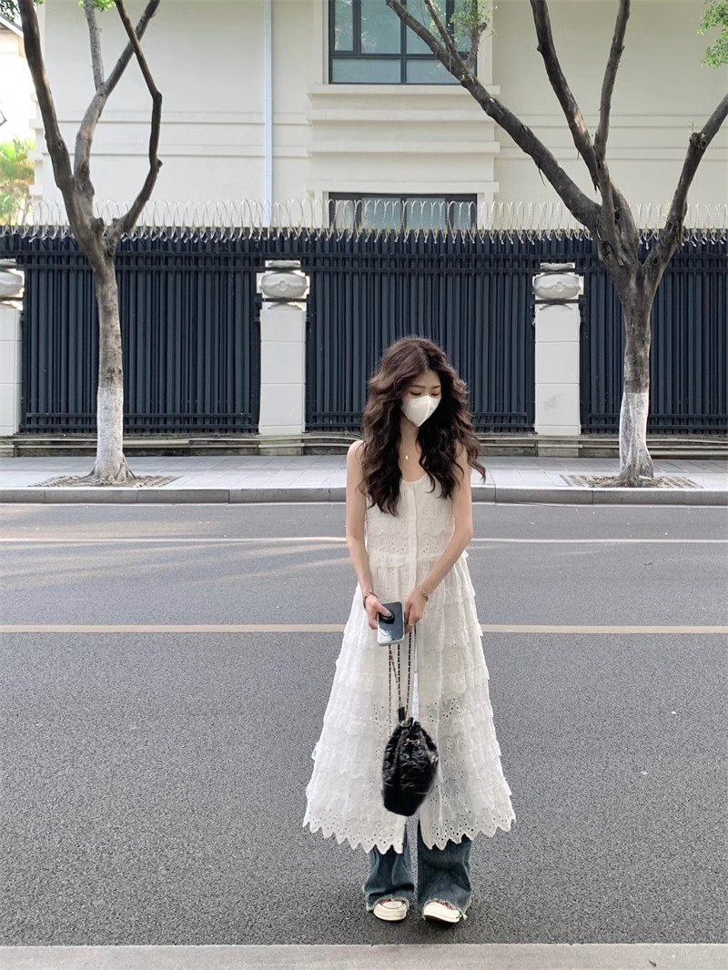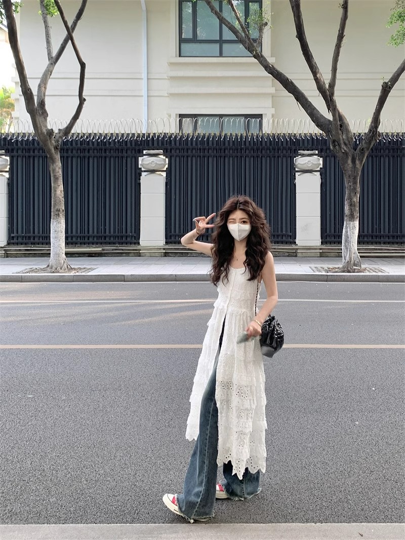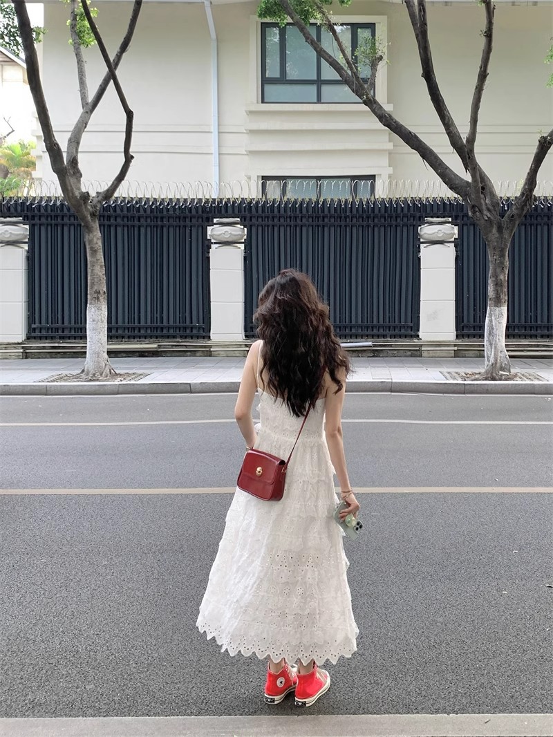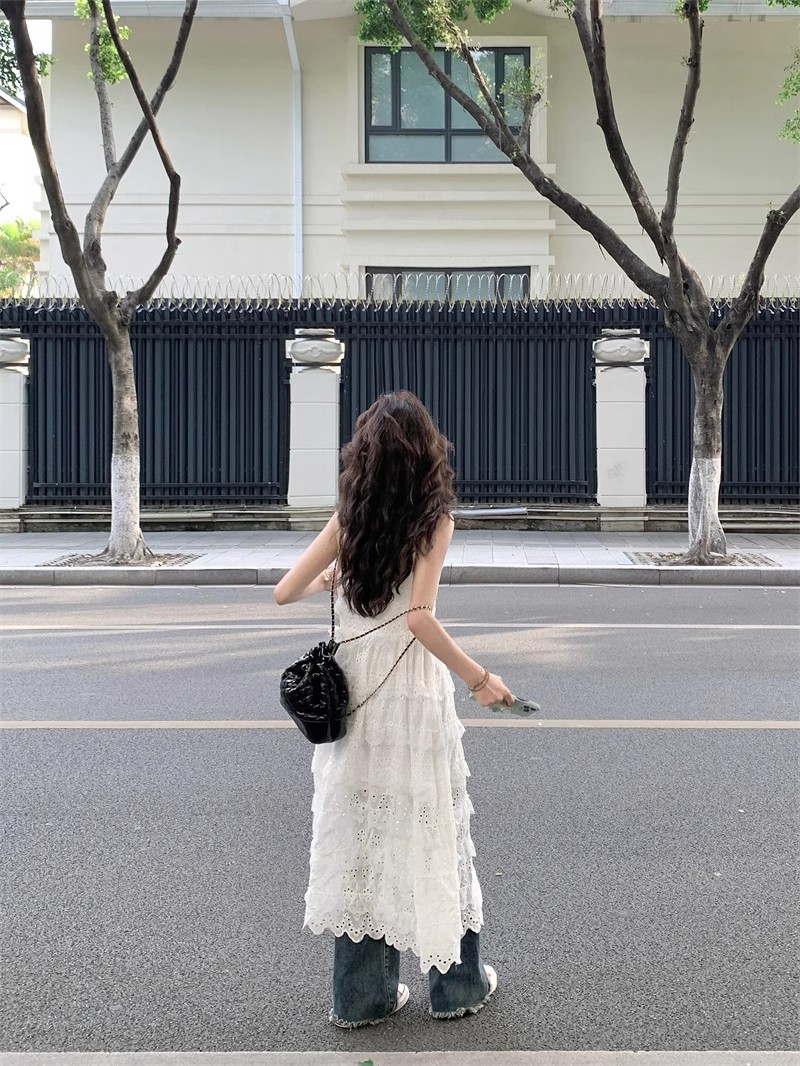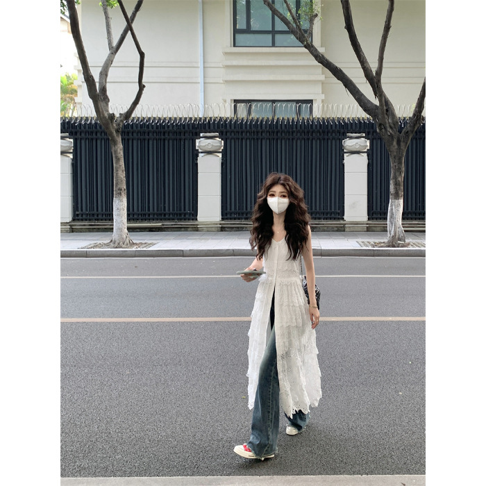 중공 레이스 슬링 원피스 여성 여름 2024 새로운 디자인 감각 허리 슬리밍 중간 길이 스커트 착용