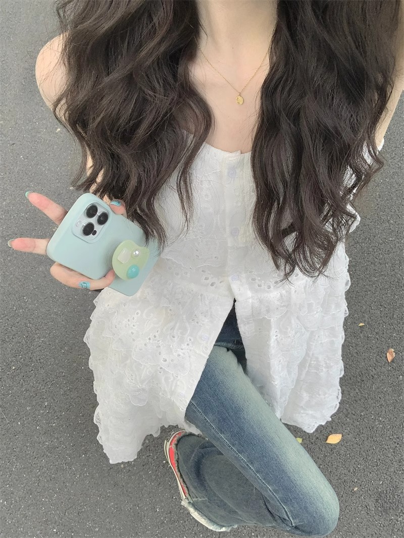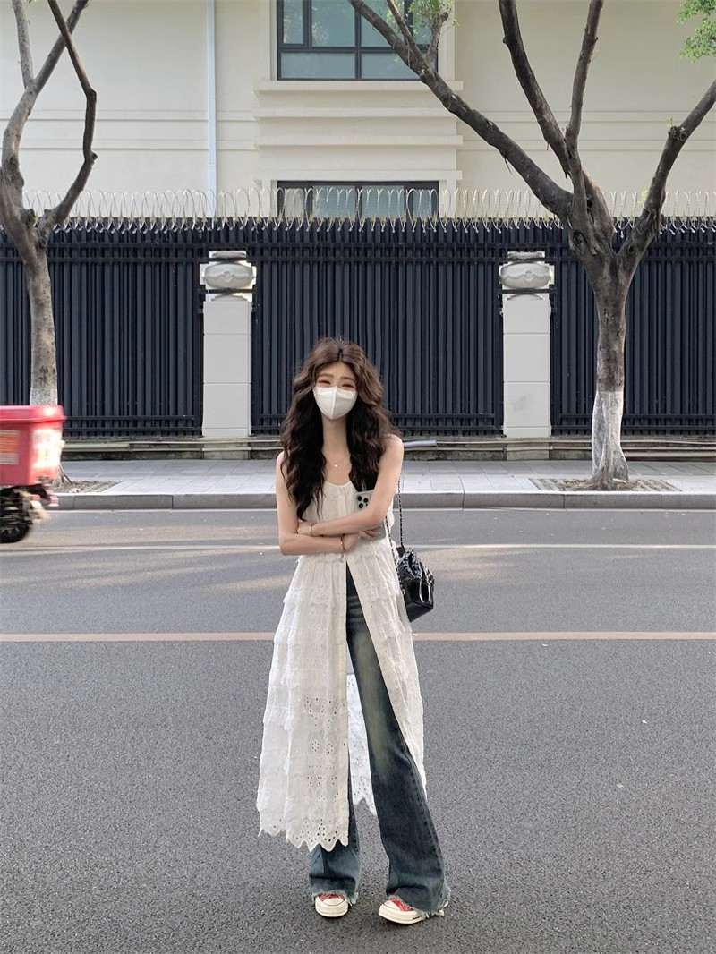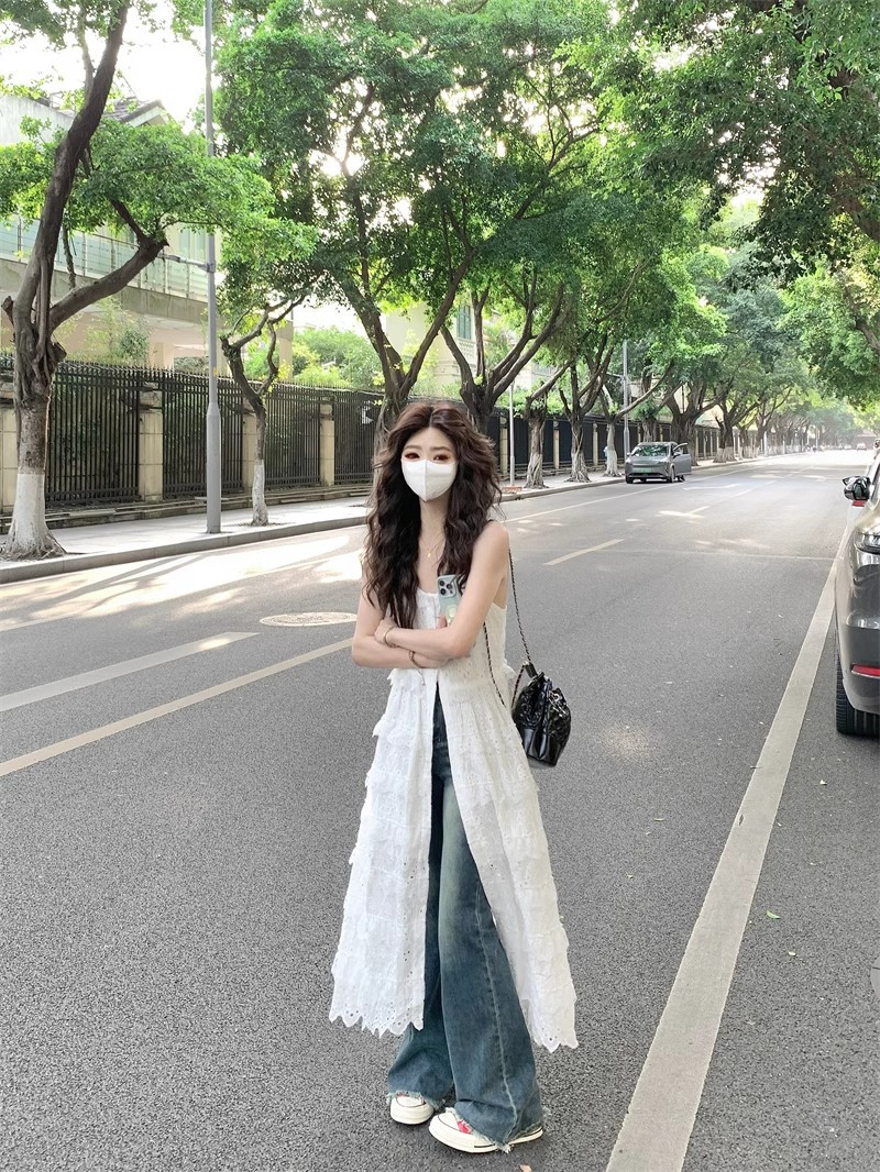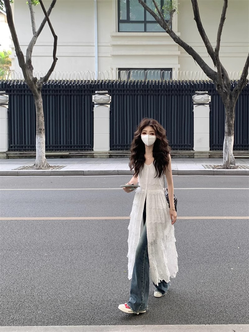 중공 레이스 슬링 원피스 여성 여름 2024 새로운 디자인 감각 허리 슬리밍 중간 길이 스커트 착용