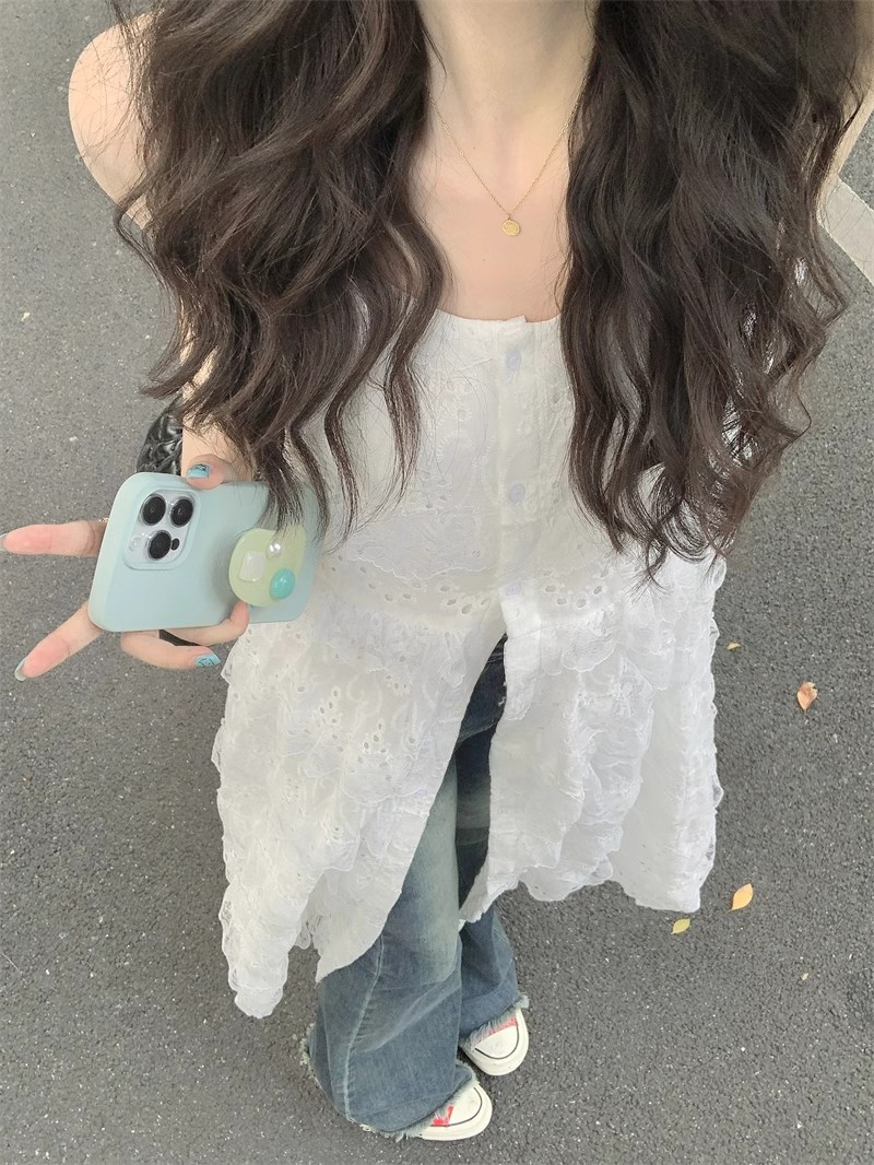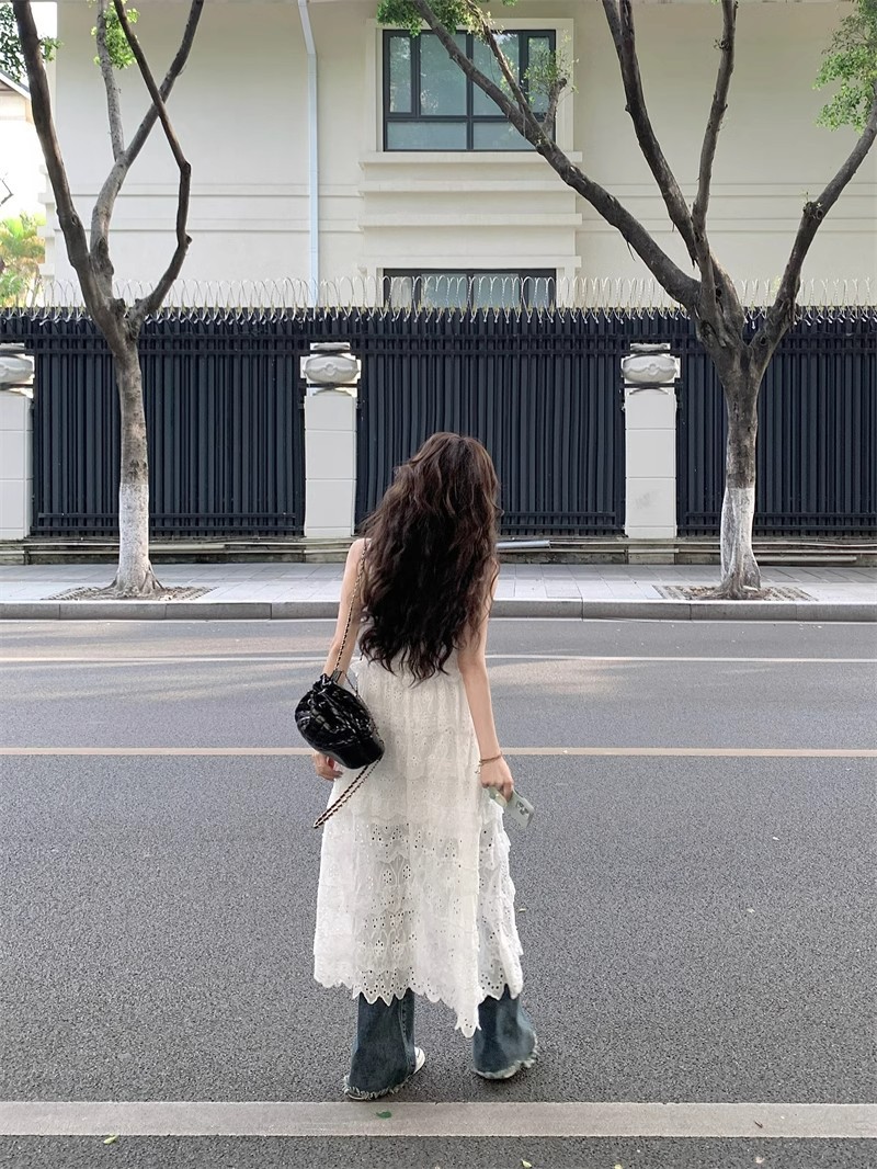 중공 레이스 슬링 원피스 여성 여름 2024 새로운 디자인 감각 허리 슬리밍 중간 길이 스커트 착용스토어 가기