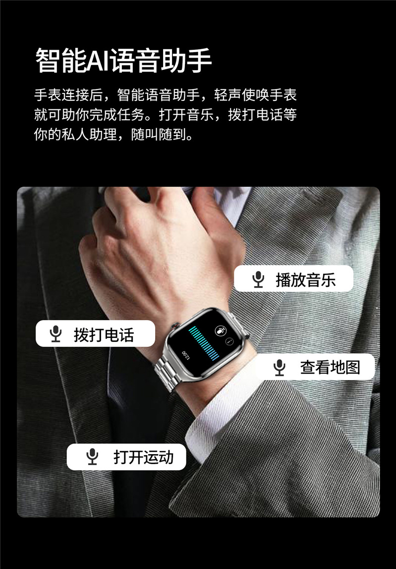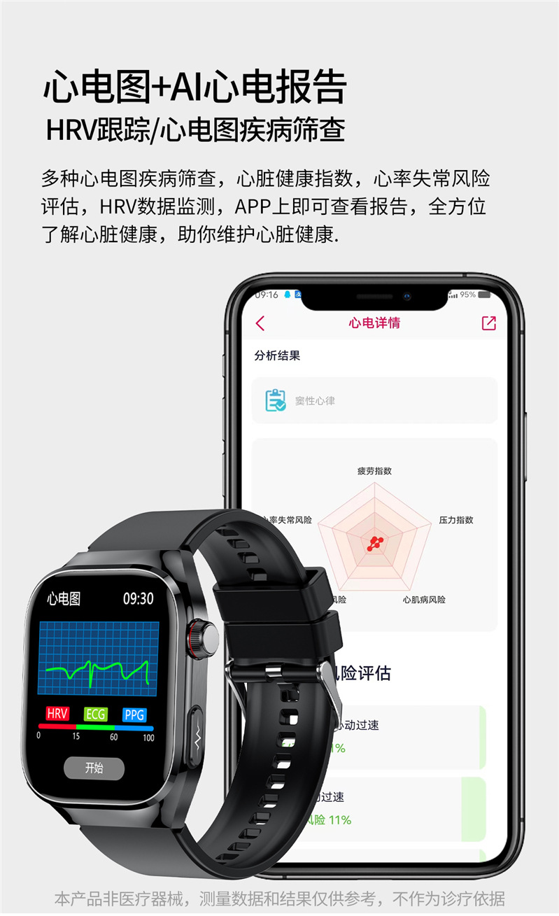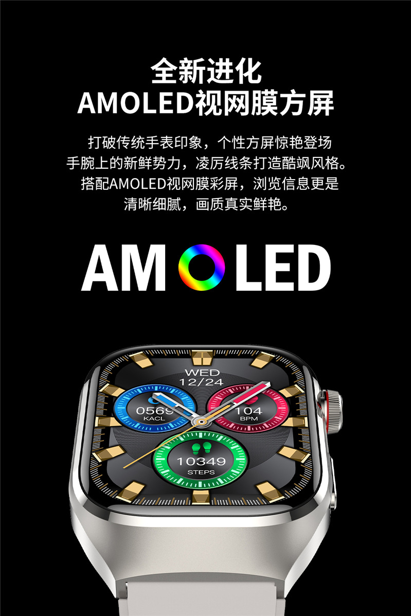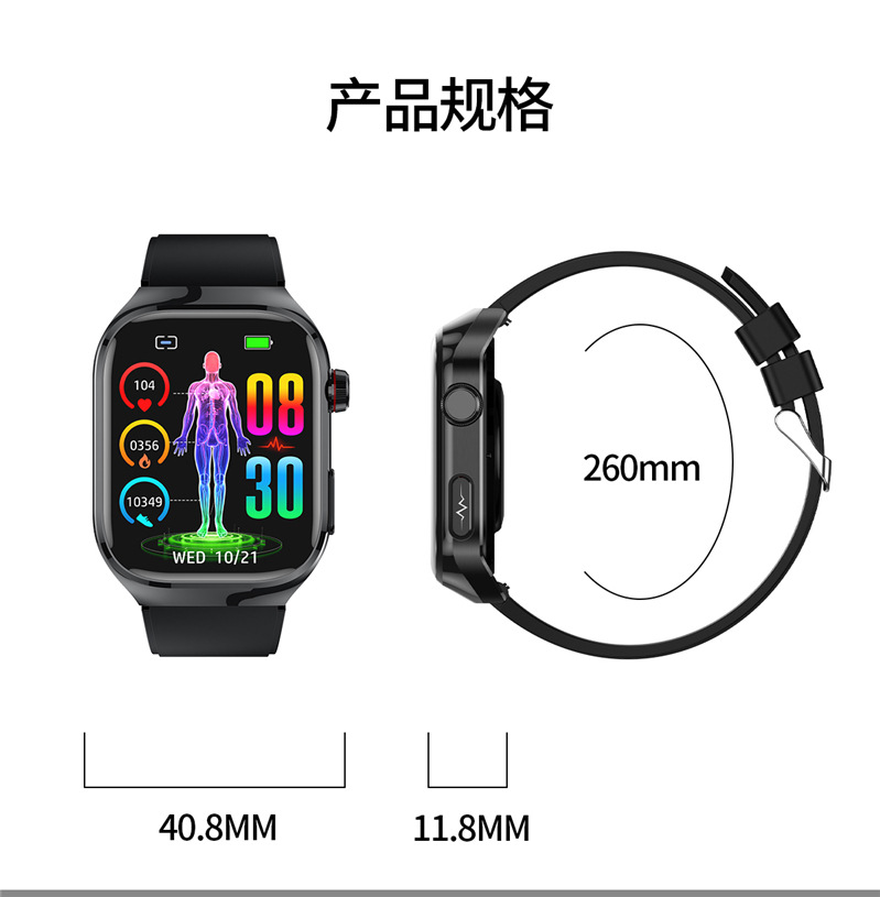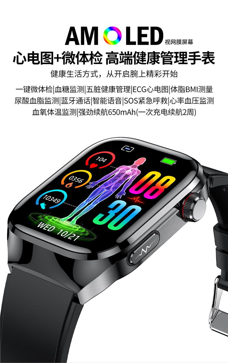 Features | Micro physical examination function (one click physical examination), five organ detection 1. Blood glucose monitoring/uric acid monitoring/blood lipid monitoring 2. ECG electrocardiogram 3. Body fat BMI measurement 4. Bluetooth call, intelligent voice assistant 5. Remote care for family and friends, multiple sports modes 6. 24-hour continuous dynamic heart rate monitoring (with live monitoring function), temperature monitoring, pressure testing, independent and accurate blood oxygen, blood pressure monitoring, sleep monitoring and other health monitoring functions 7. 2.04-inch high-resolution 368 * 448 AMOLED full touch screen 8. APP multi dial market and custom dial 9. Women's health, weather forecast, sedentary reminders, messages, phone calls, and other information reminders 10.650mAh high-density polymer lithium battery, with a single charge and a battery life of 10-15 days |