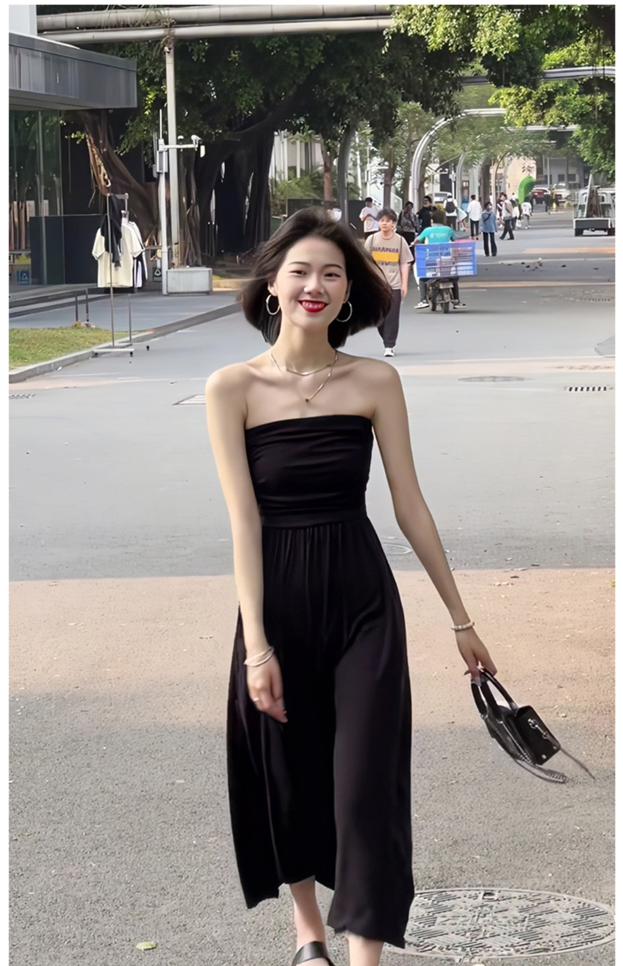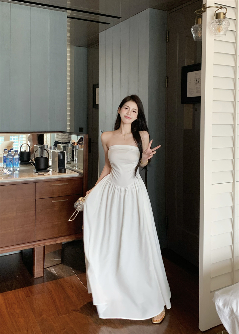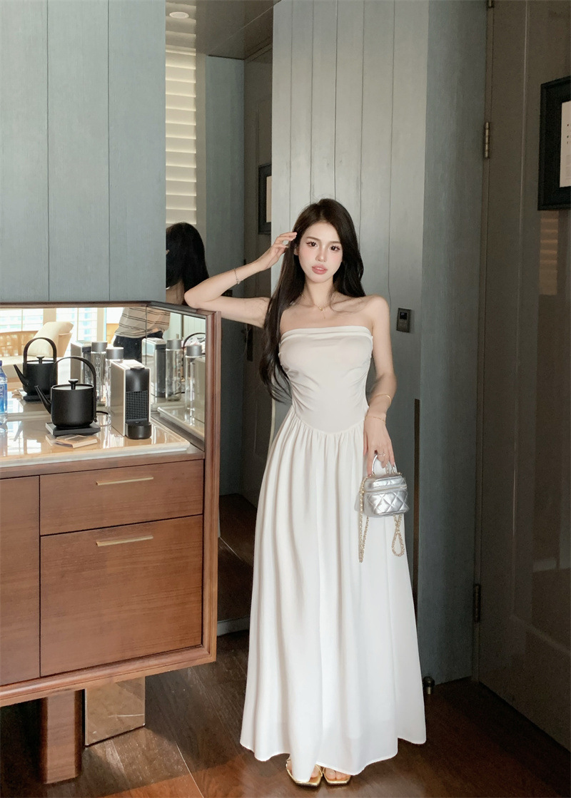 여름 새 스타일 우아한 순수 어깨 민소매 튜브 탑 원피스 여성 한국식 타이트 허리 슬리밍 롱 스커트