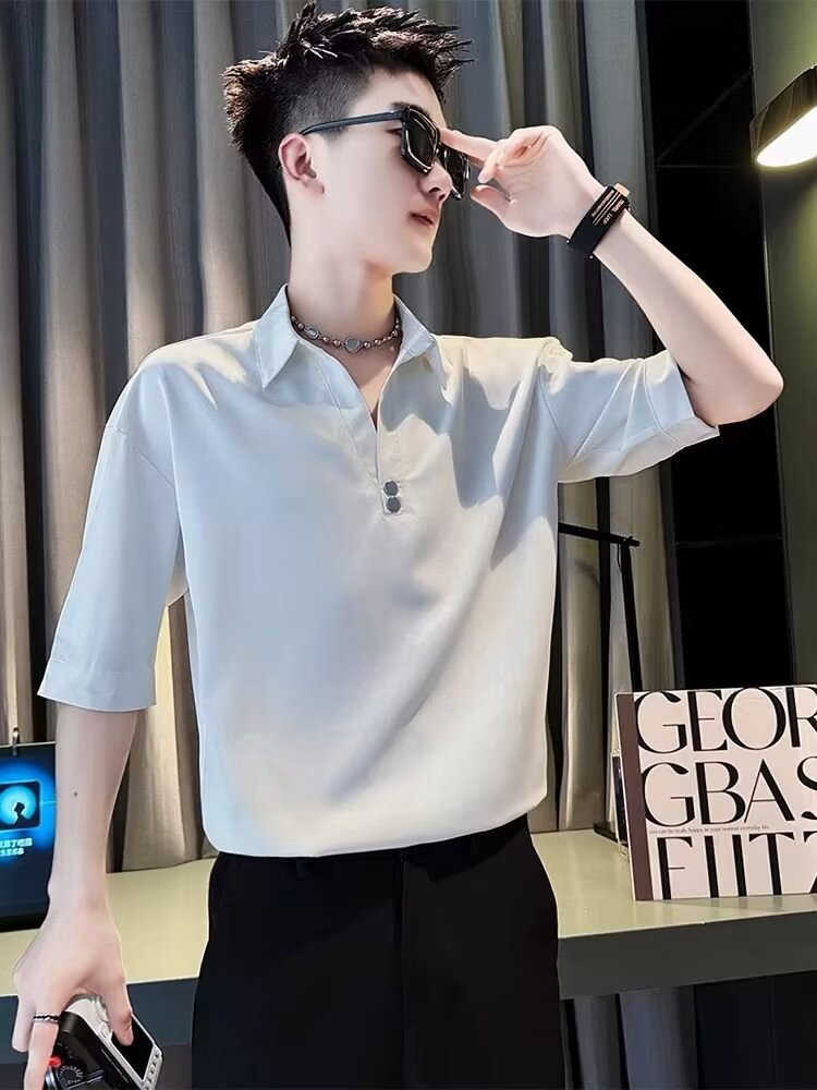여름 남자 아이스 실크 V 넥 반팔 셔츠 슈페리어 하이 엔드 남자 세븐 슬리브 셔츠 남자 트렌디 브랜드 탑스토어 가기