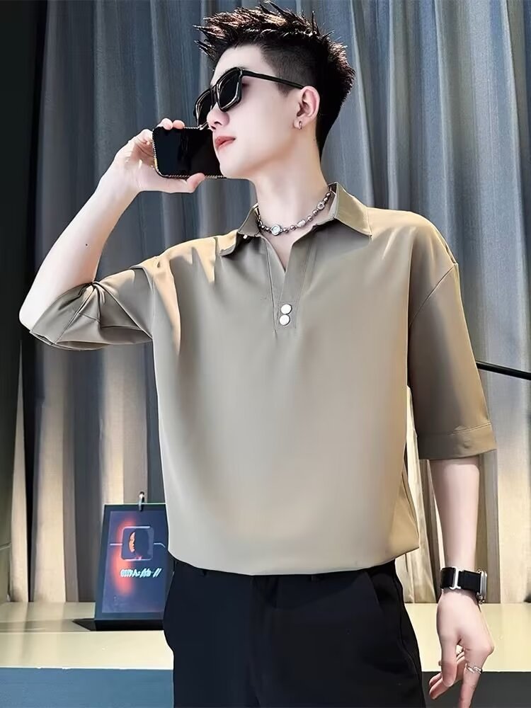 여름 남자 아이스 실크 V 넥 반팔 셔츠 슈페리어 하이 엔드 남자 세븐 슬리브 셔츠 남자 트렌디 브랜드 탑