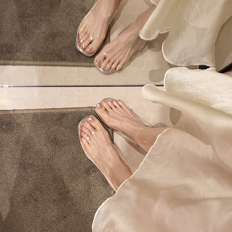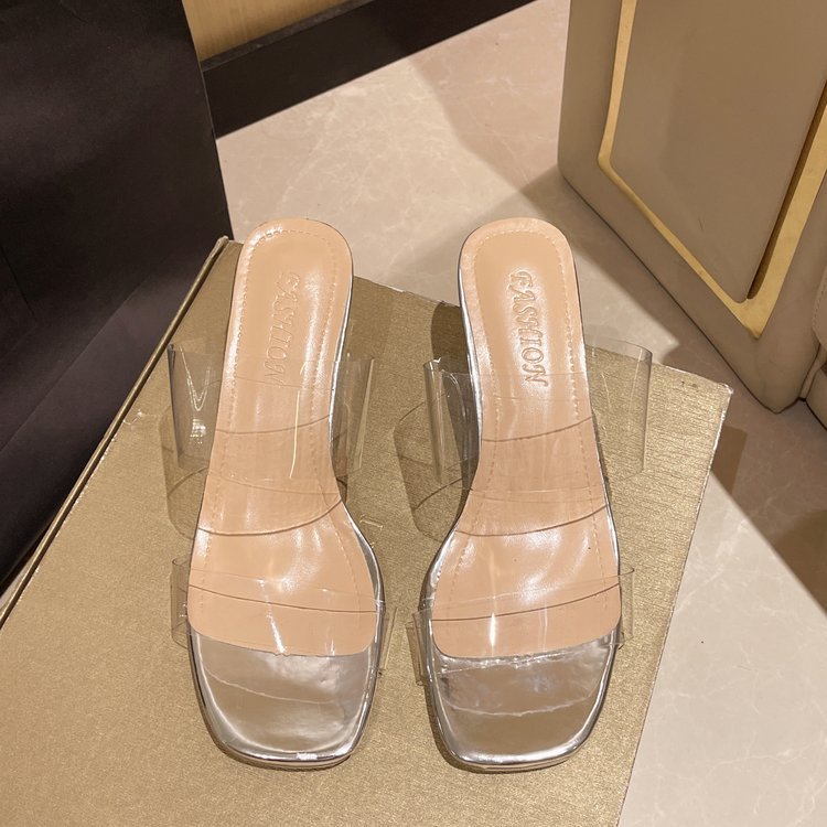 2024 여름 새로운 크리스탈 두꺼운 힐 슬리퍼 여성용 투명 한 단어 사각형 머리 하이힐 샌들 도매스토어 가기