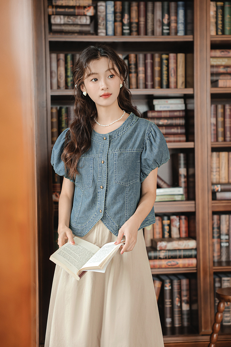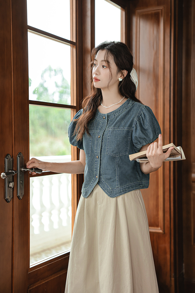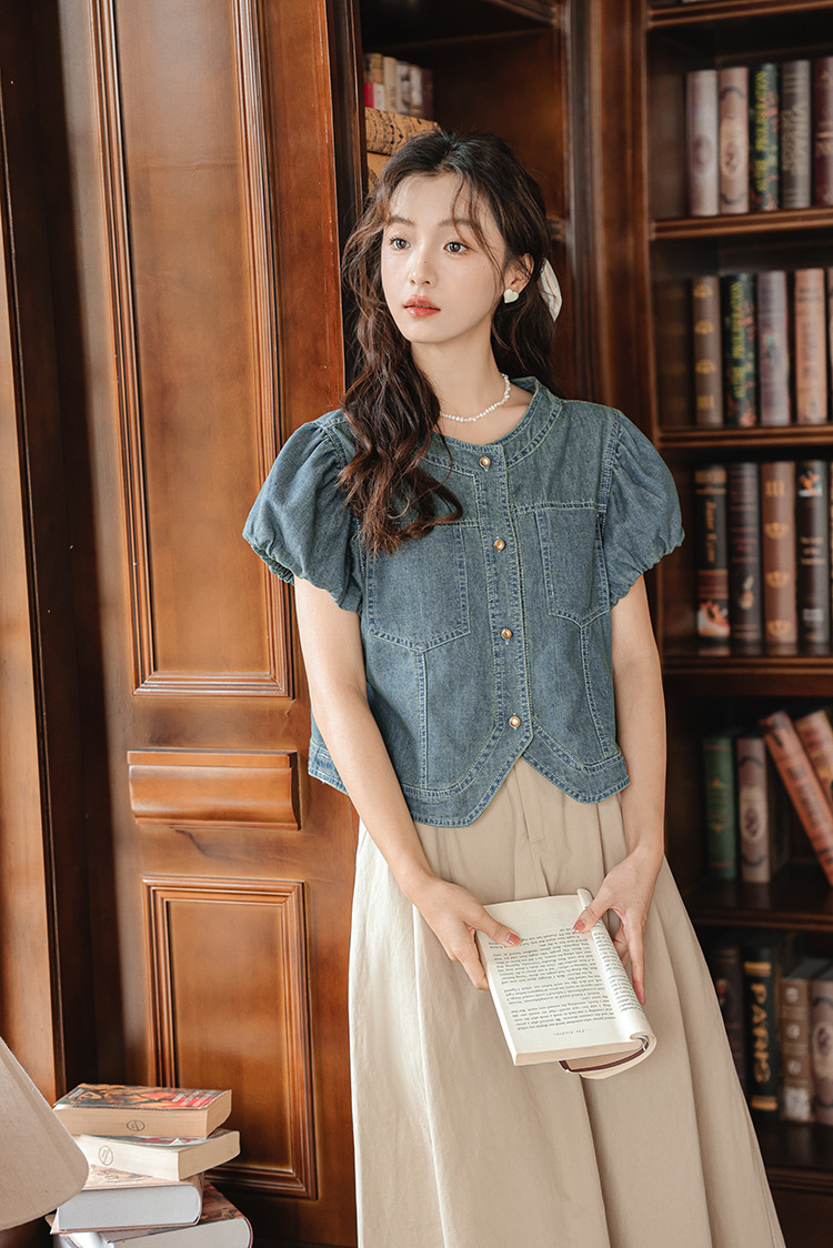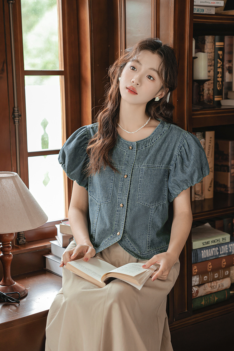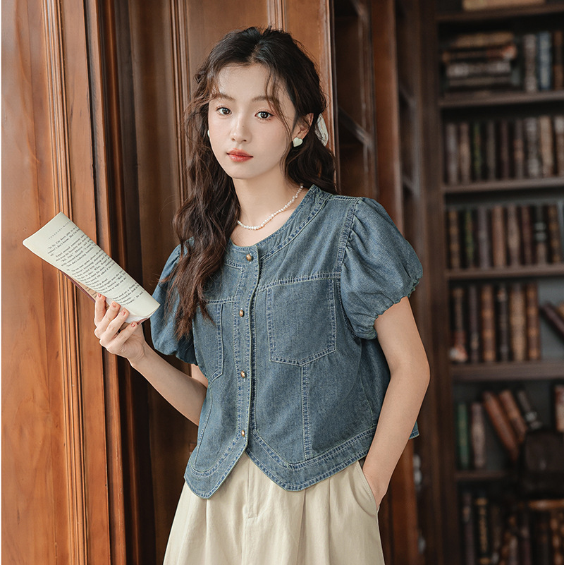 프랑스 스타일 데님 셔츠 여성의 짧은 소매 2024 여름 새로운 도착 패션 꽃 소매 빈티지 틈새 짧은 라운드 넥 셔츠