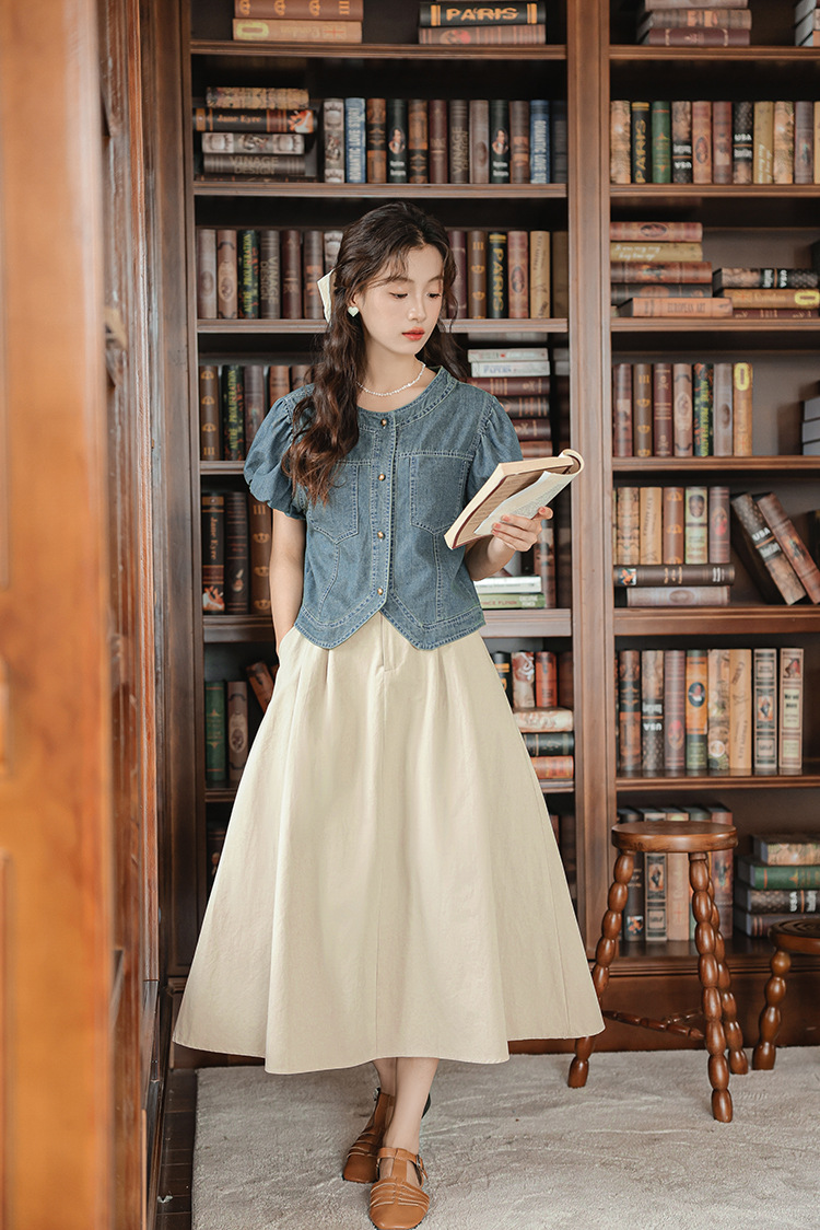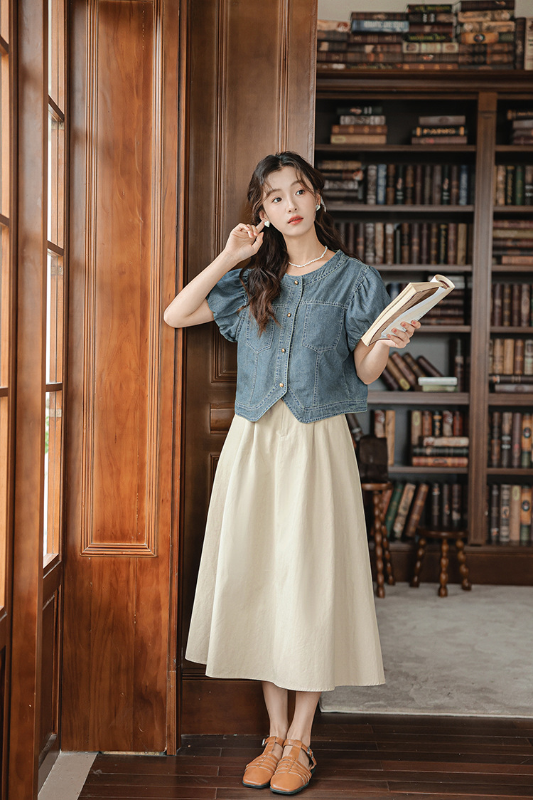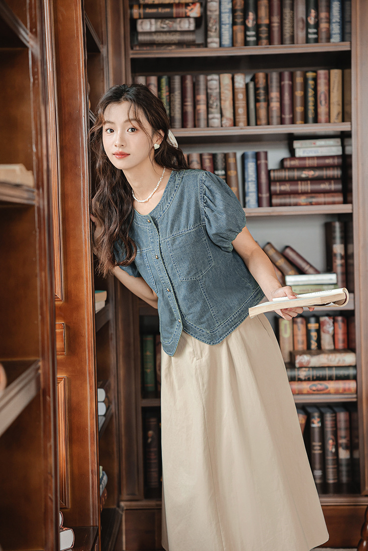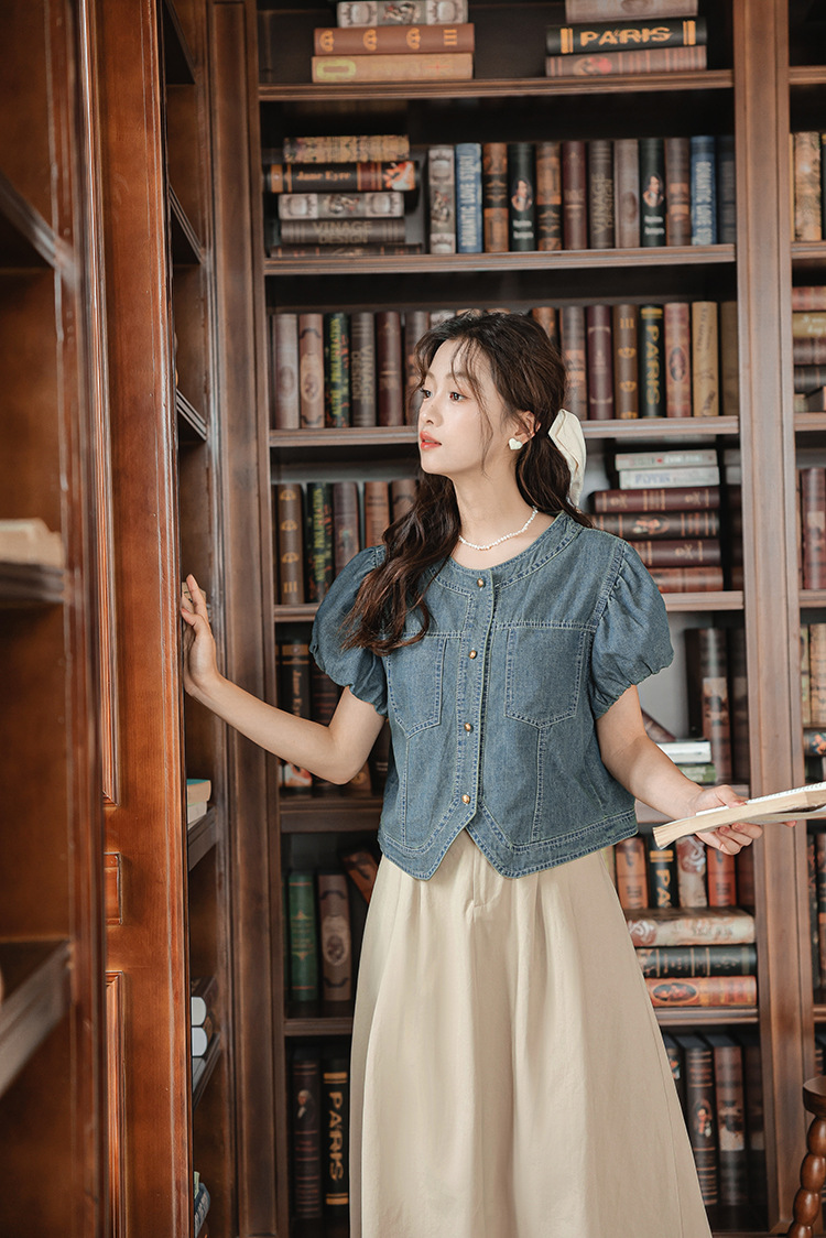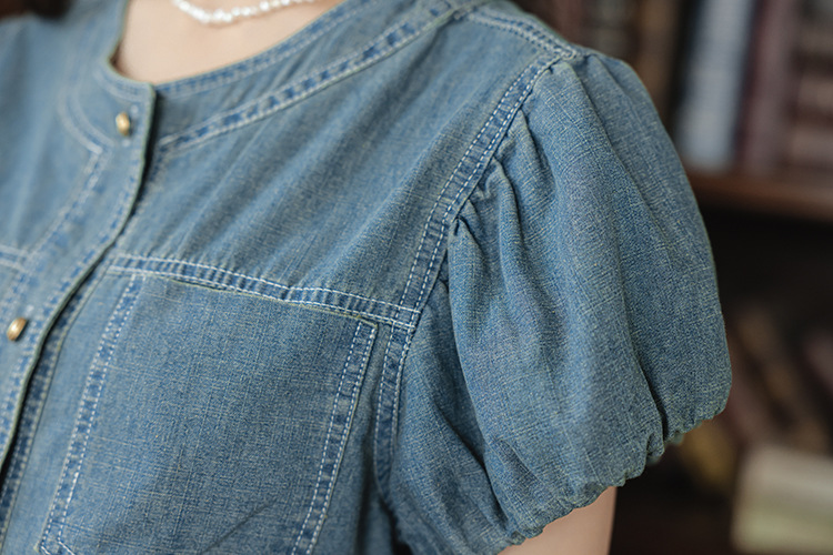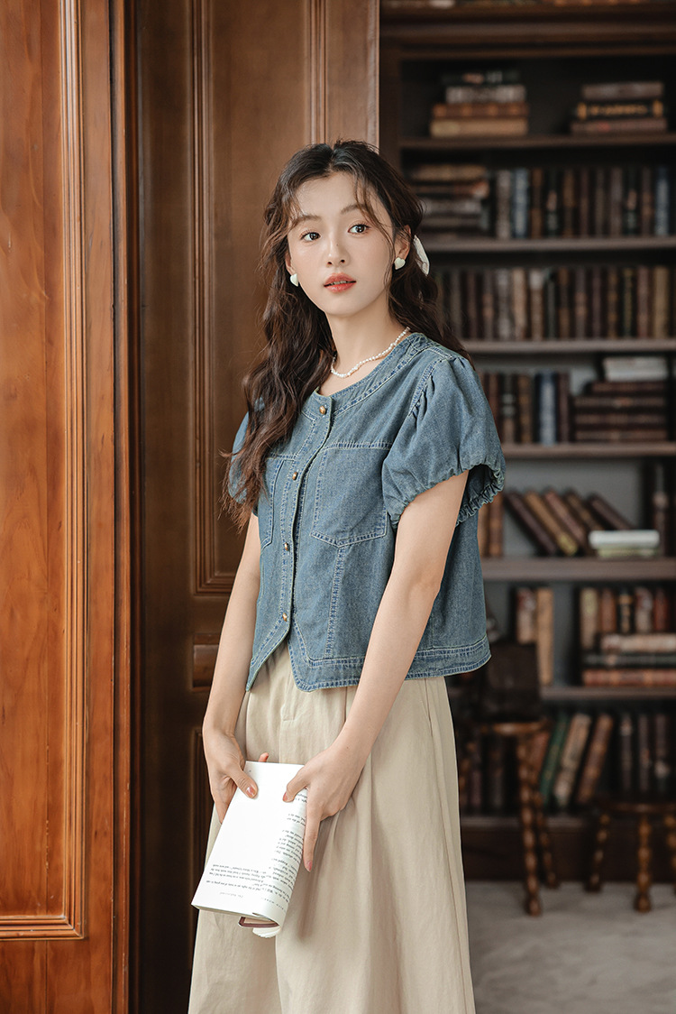 프랑스 스타일 데님 셔츠 여성의 짧은 소매 2024 여름 새로운 도착 패션 꽃 소매 빈티지 틈새 짧은 라운드 넥 셔츠스토어 가기