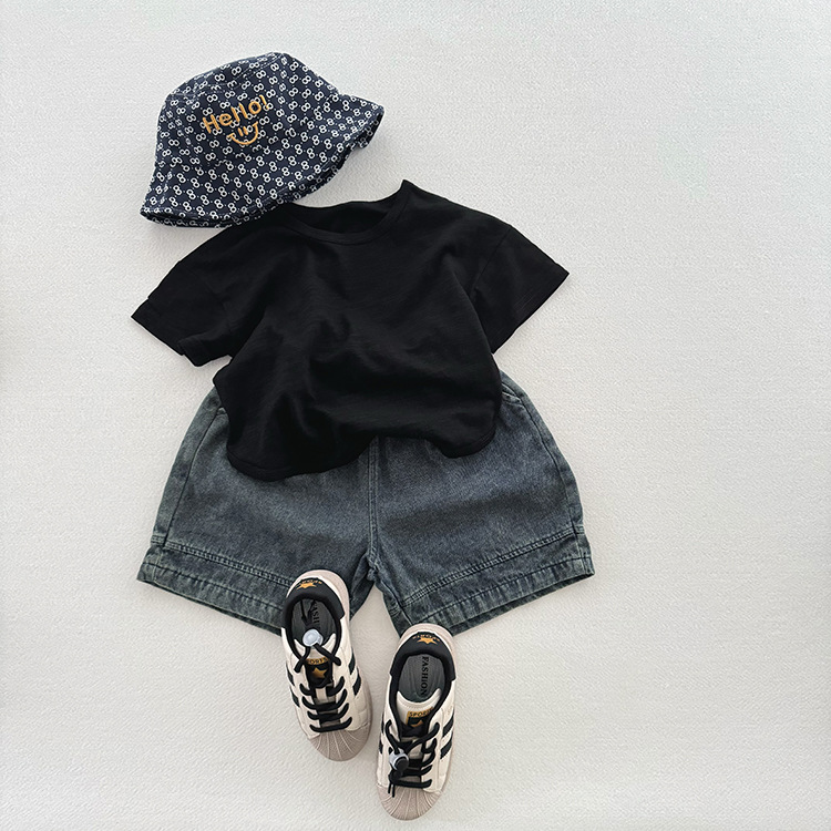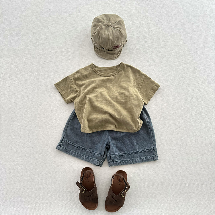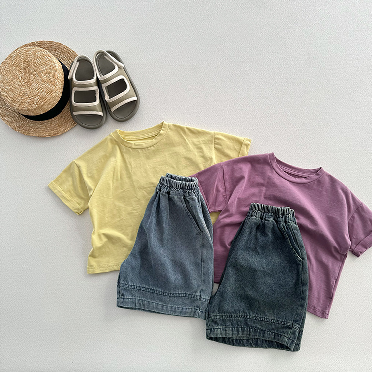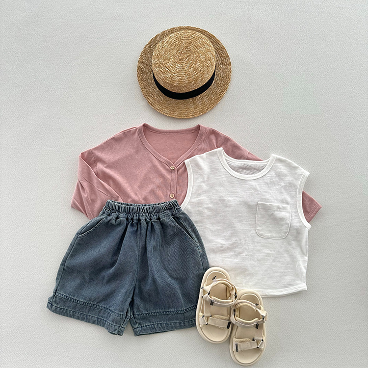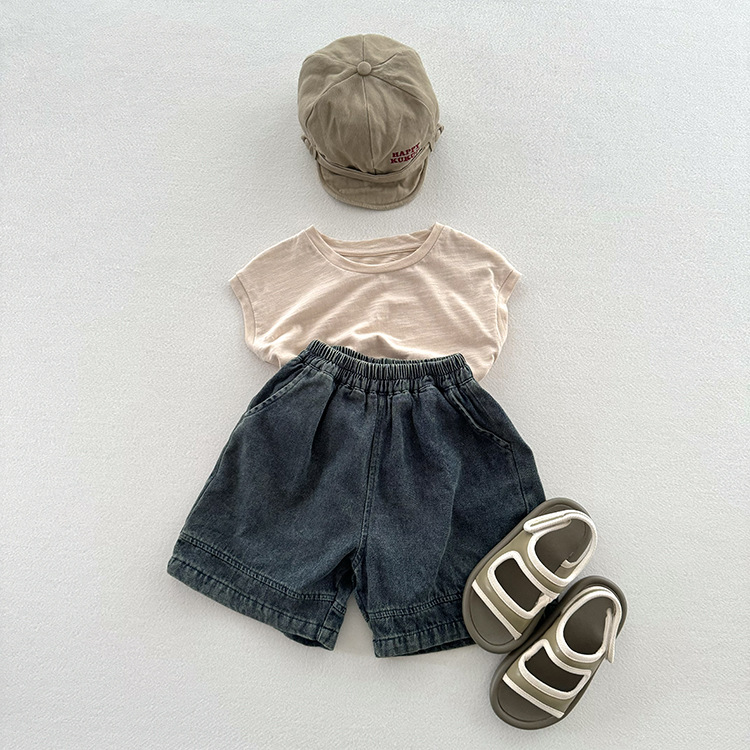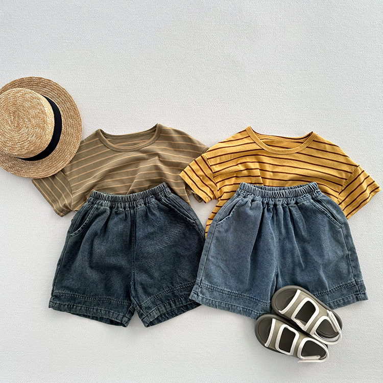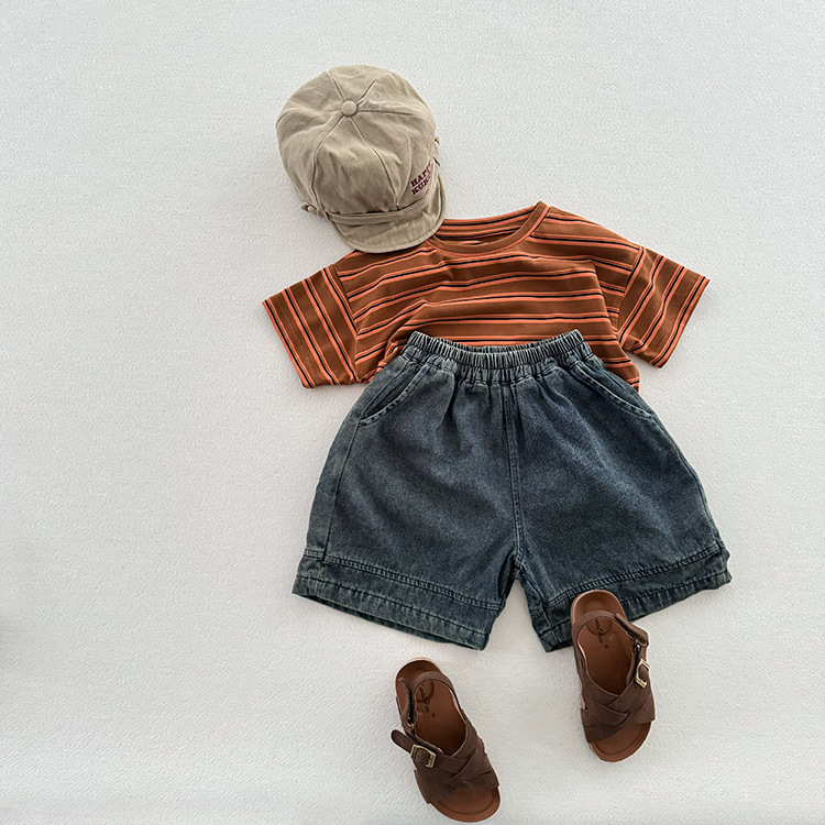 남학생과 여학생을위한 여름 어린이 맞춤형 레트로 캐주얼 5 점 중간 길이 바지 일본 및 한국 스타일 서양식 바느질 얇은 청바지스토어 가기