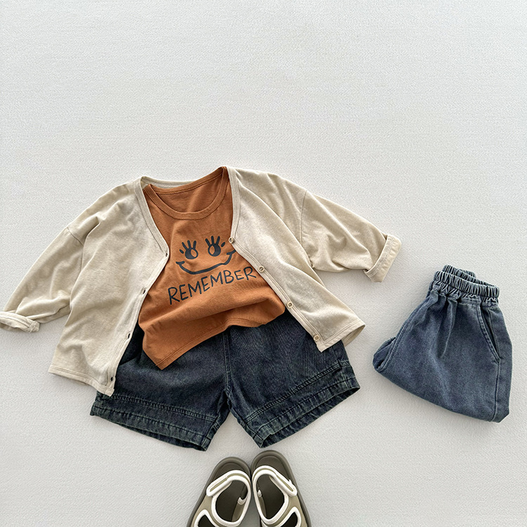 남학생과 여학생을위한 여름 어린이 맞춤형 레트로 캐주얼 5 점 중간 길이 바지 일본 및 한국 스타일 서양식 바느질 얇은 청바지