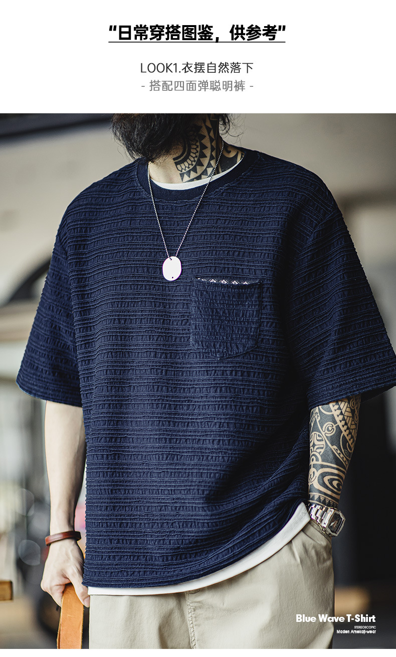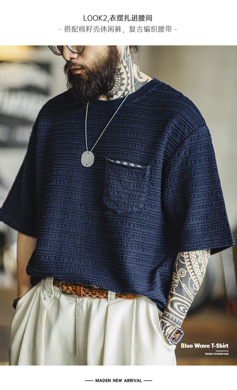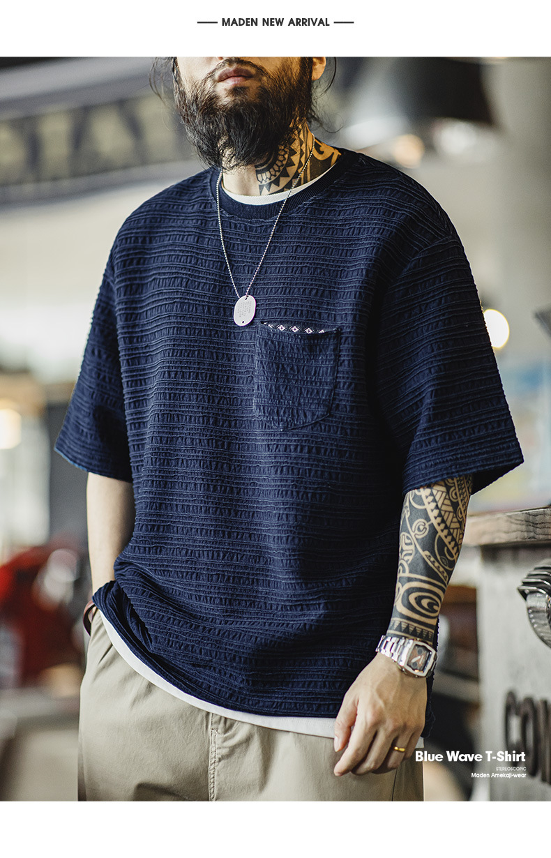 매든 툴링 아메리칸 스타일 레트로 니트 자카드 물결 티셔츠 질감 카키 남성용 느슨한 반팔 티셔츠 여름스토어 가기