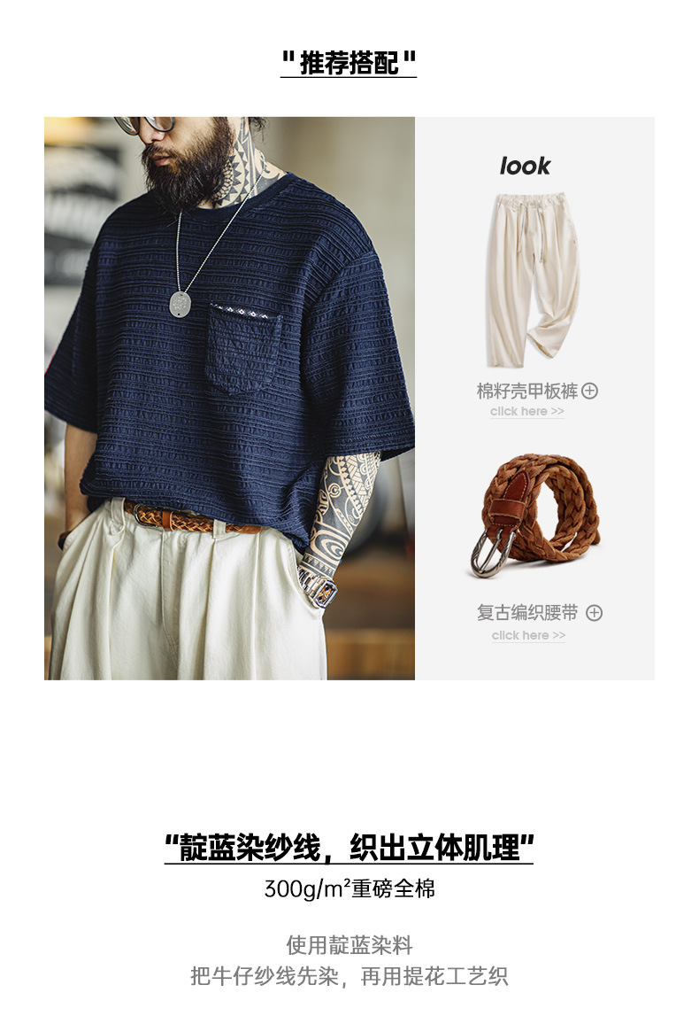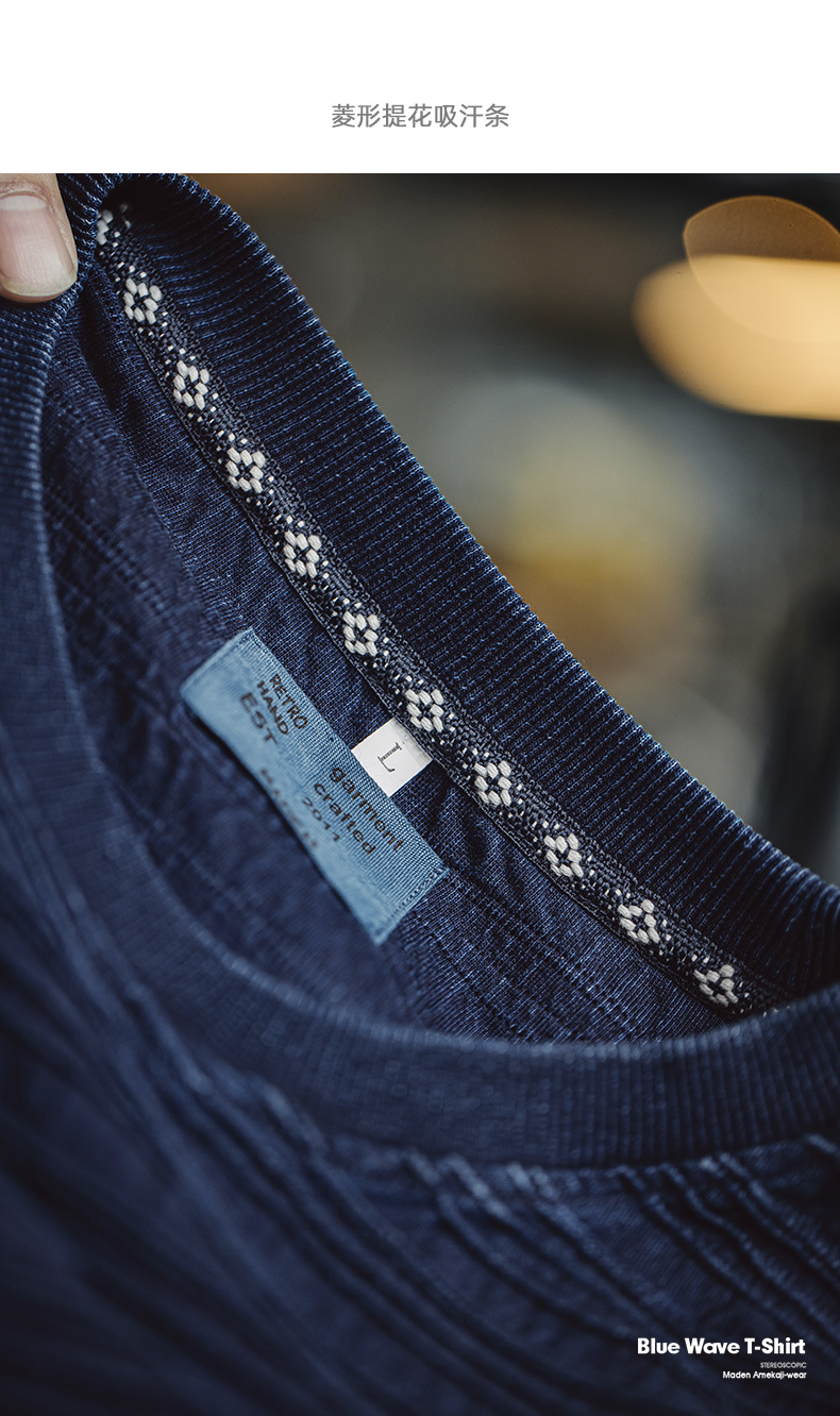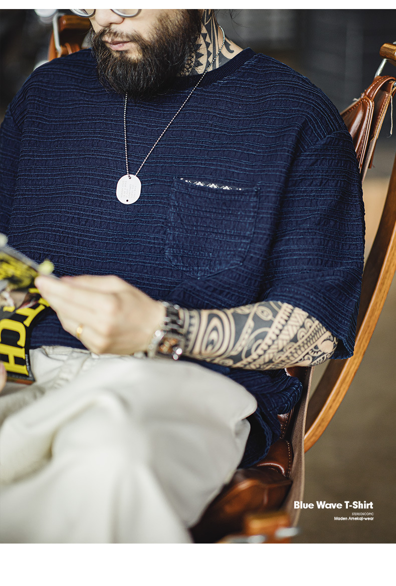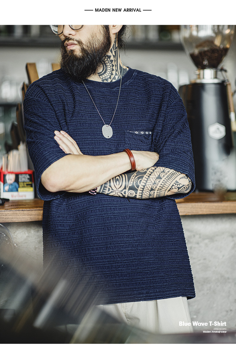매든 툴링 아메리칸 스타일 레트로 니트 자카드 물결 티셔츠 질감 카키 남성용 느슨한 반팔 티셔츠 여름스토어 가기
