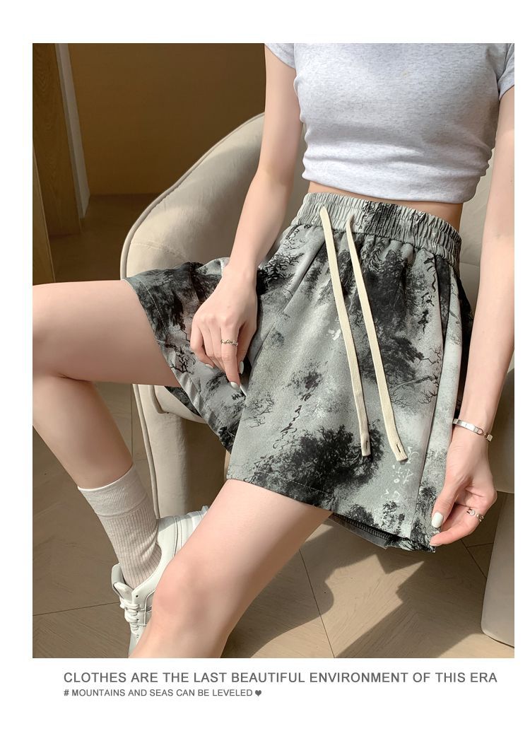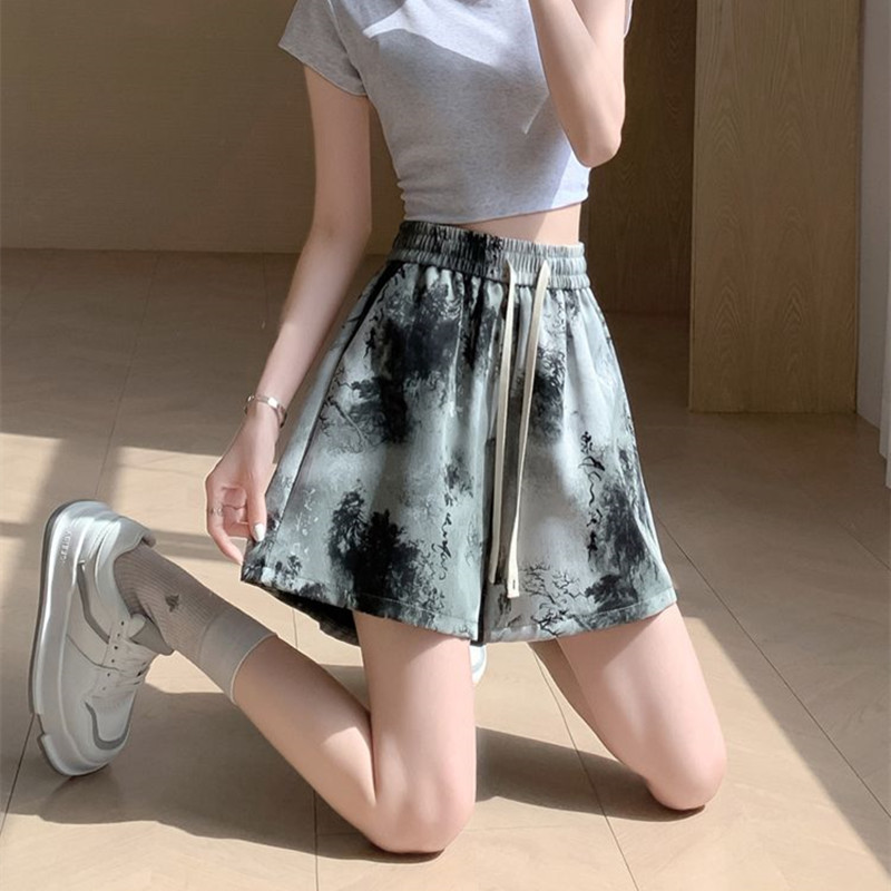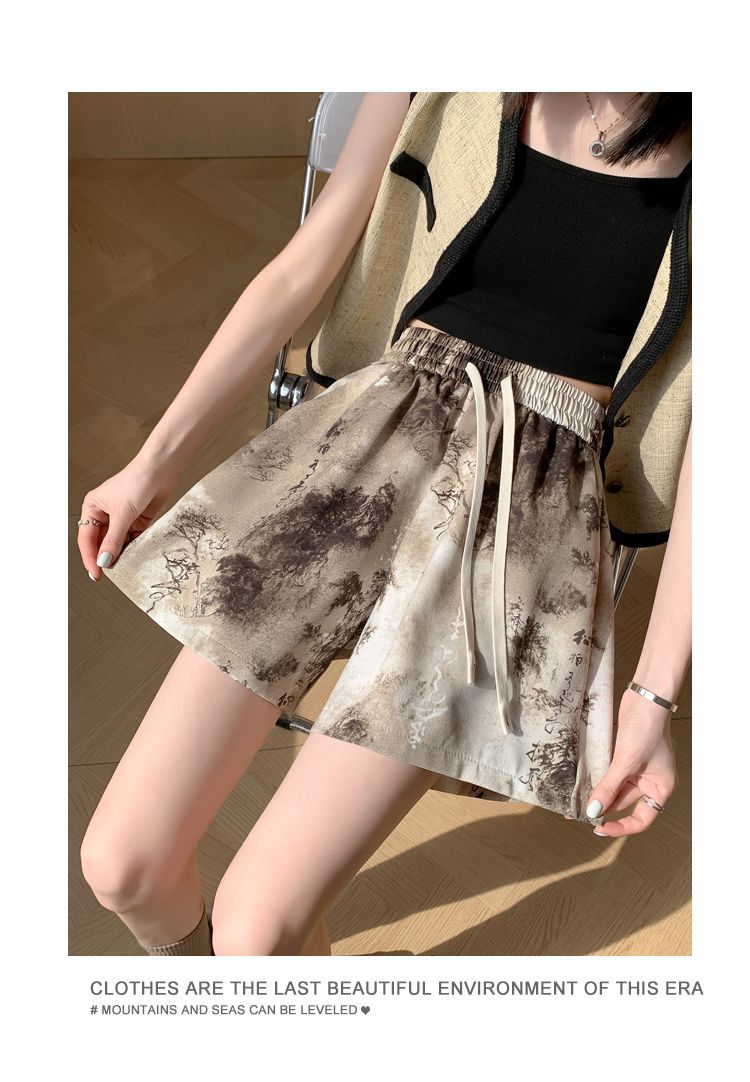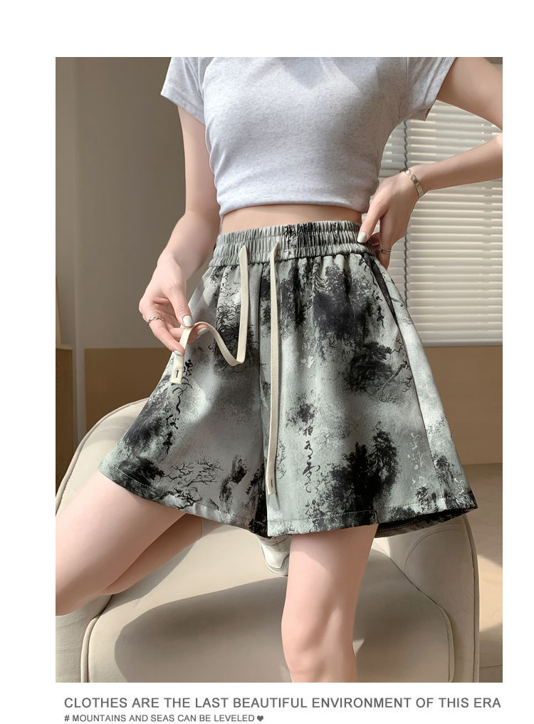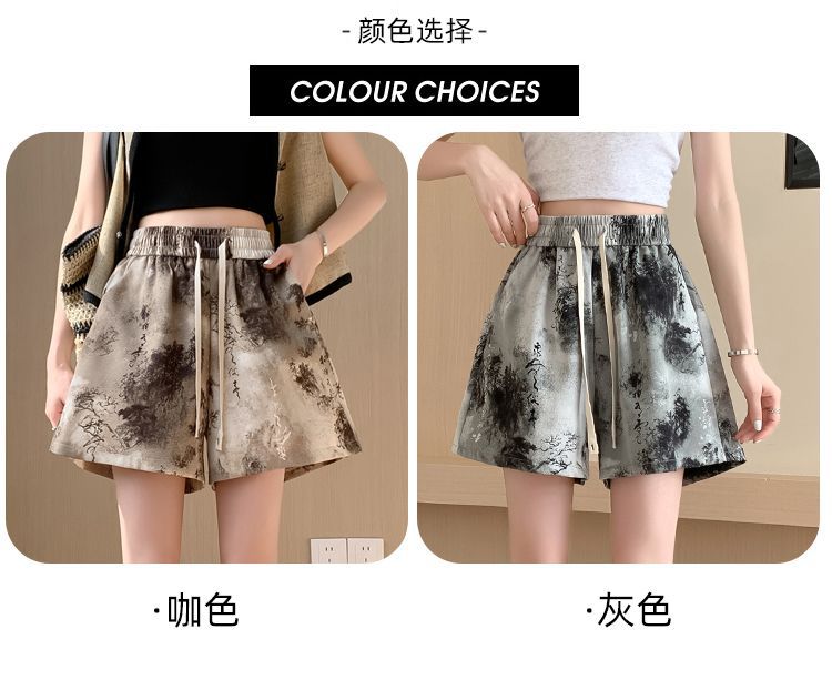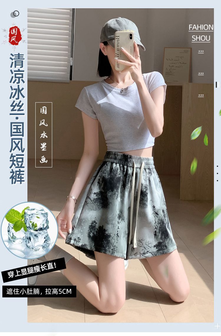 얼음 실크 빠른 건조 새로운 중국 스타일 잉크 인쇄 반바지 여성 넓은 다리 바지 여름 국립 스타일 반바지 느슨한 스트레이트 캐주얼 바지스토어 가기
