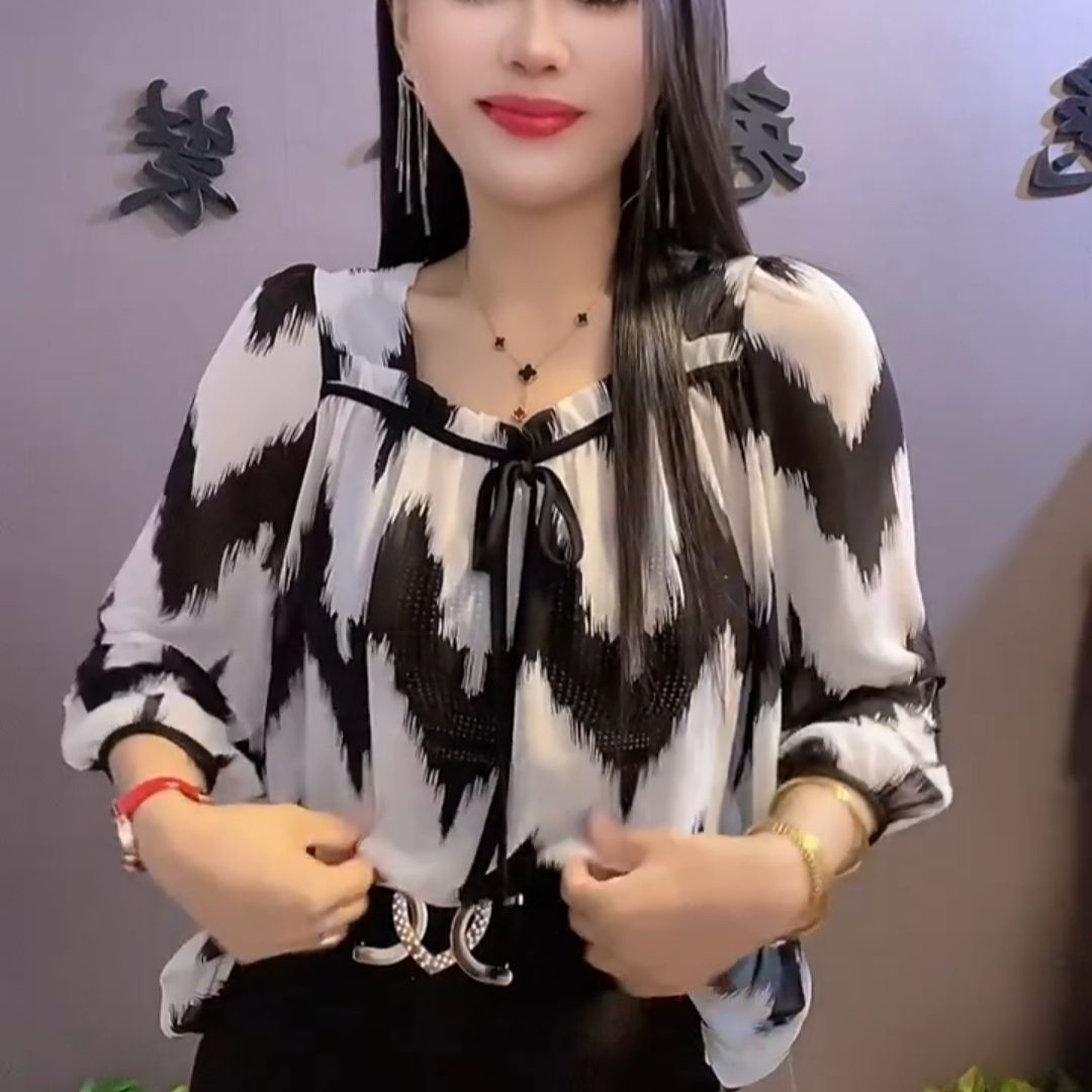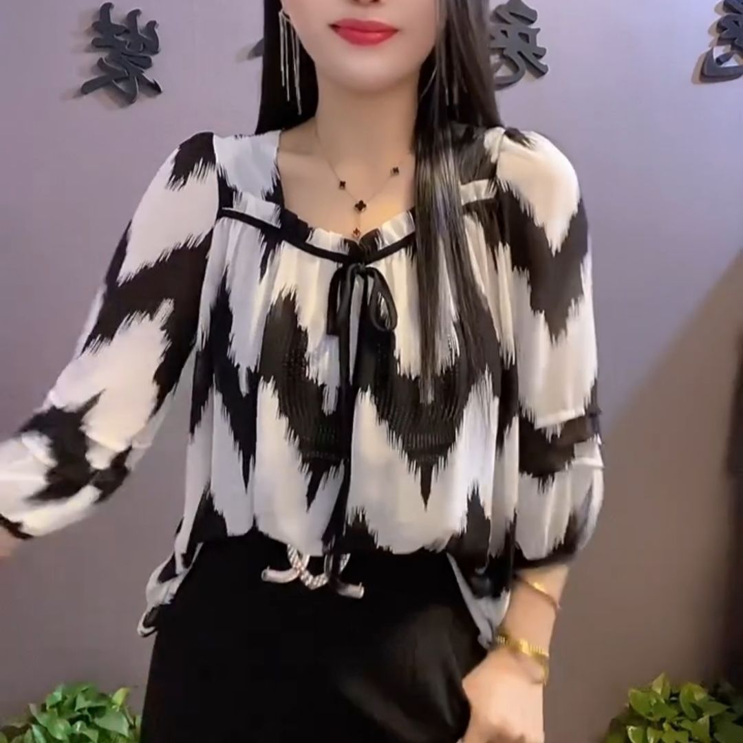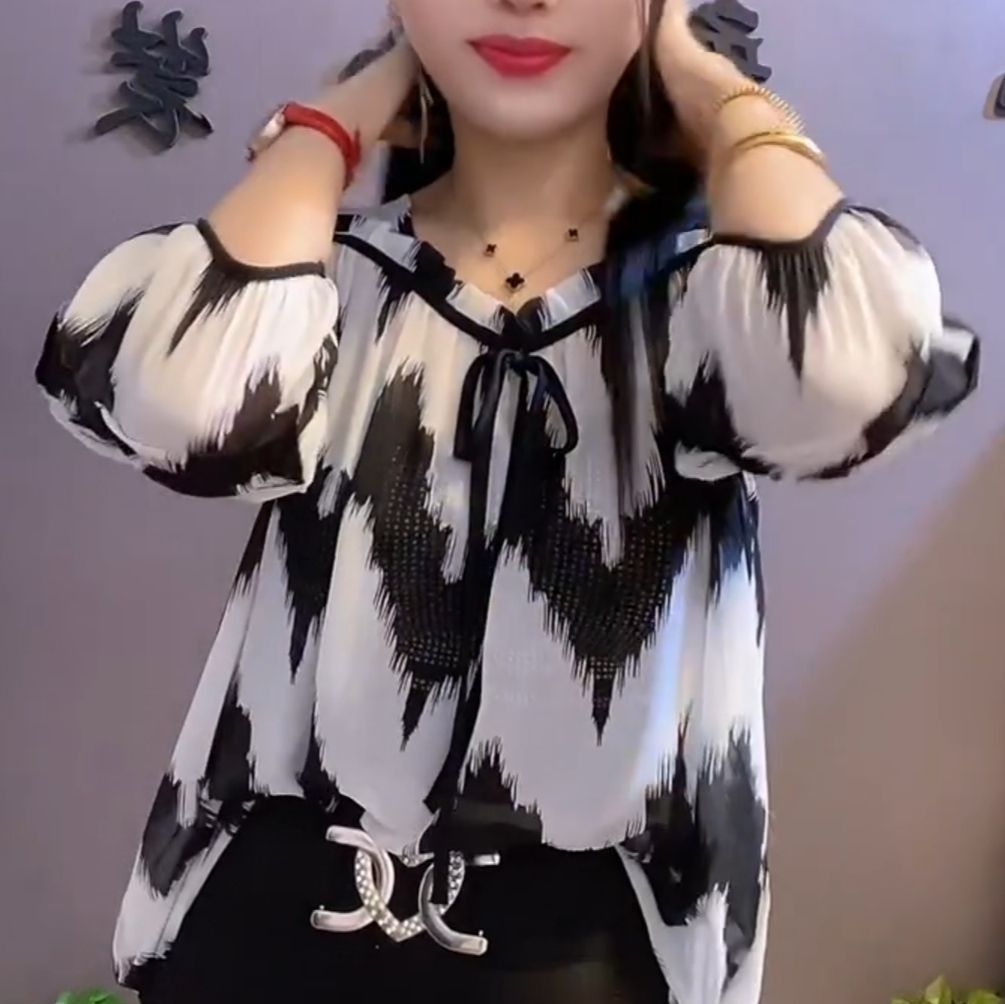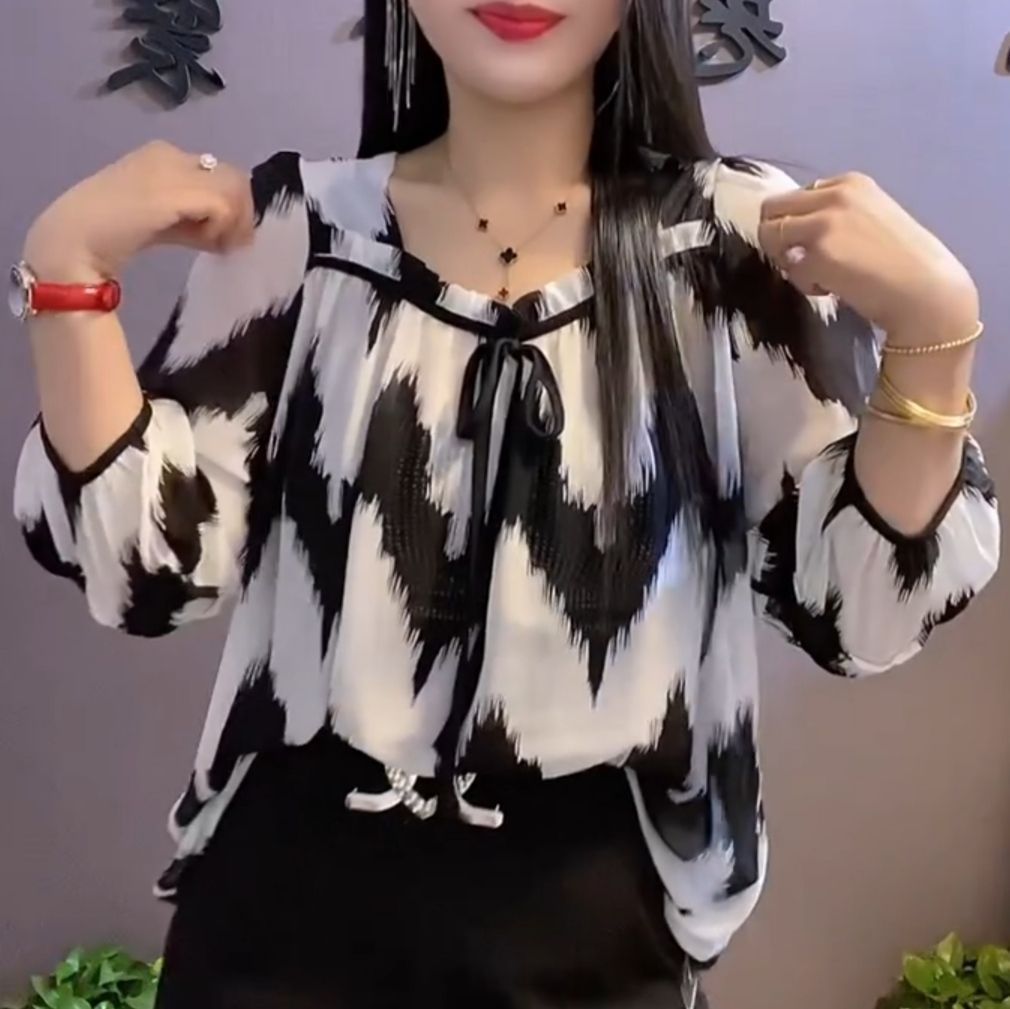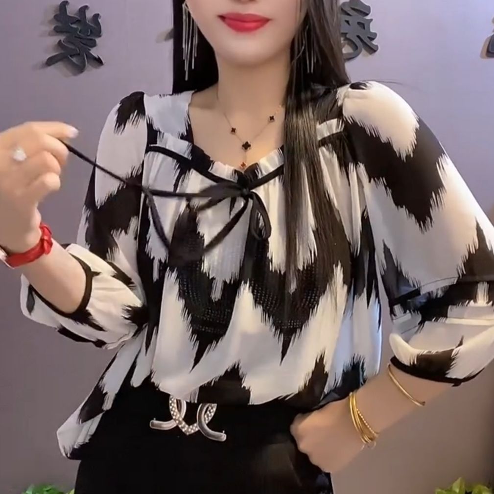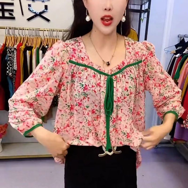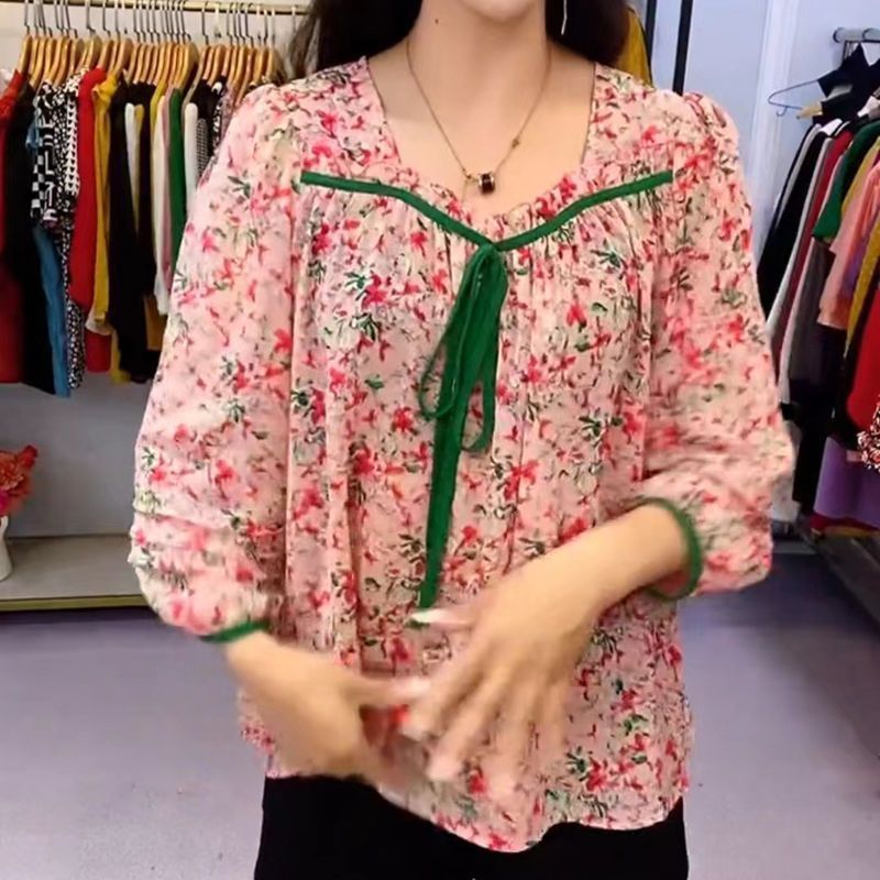 유럽 역 2024 봄과 여름 새로운 티셔츠 여자 유행 올 매치 여자 루즈 레이스 업 꽃 웨스턴 스타일 쉬폰 셔츠스토어 가기