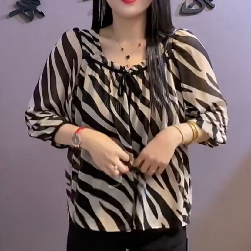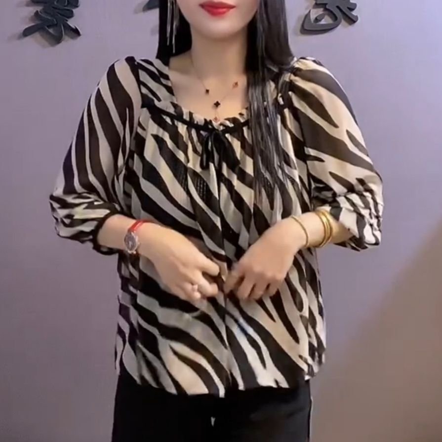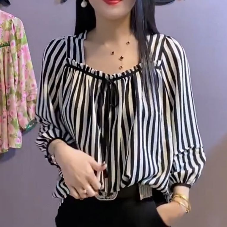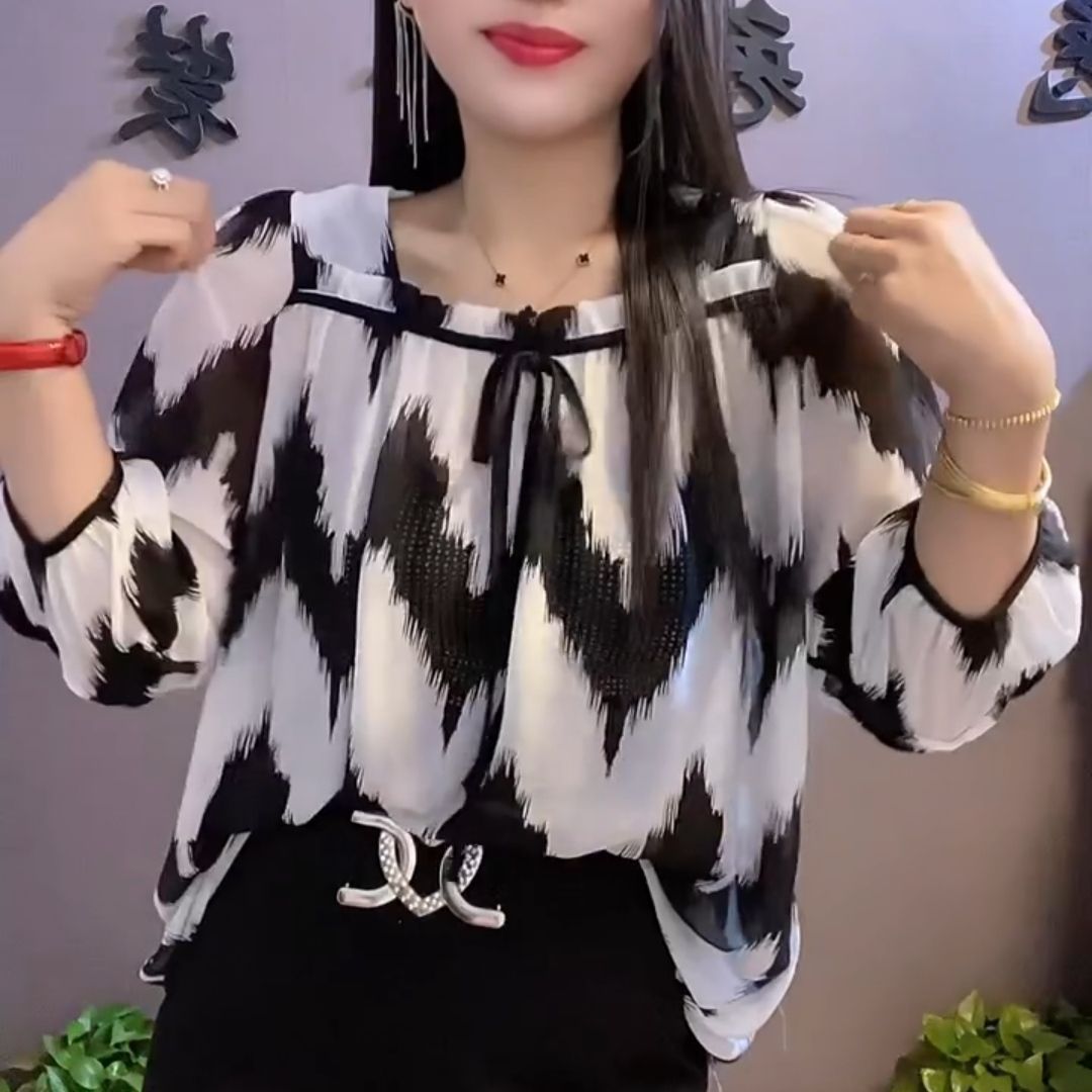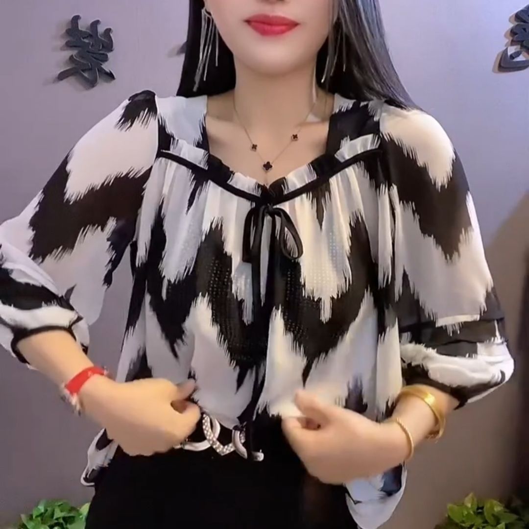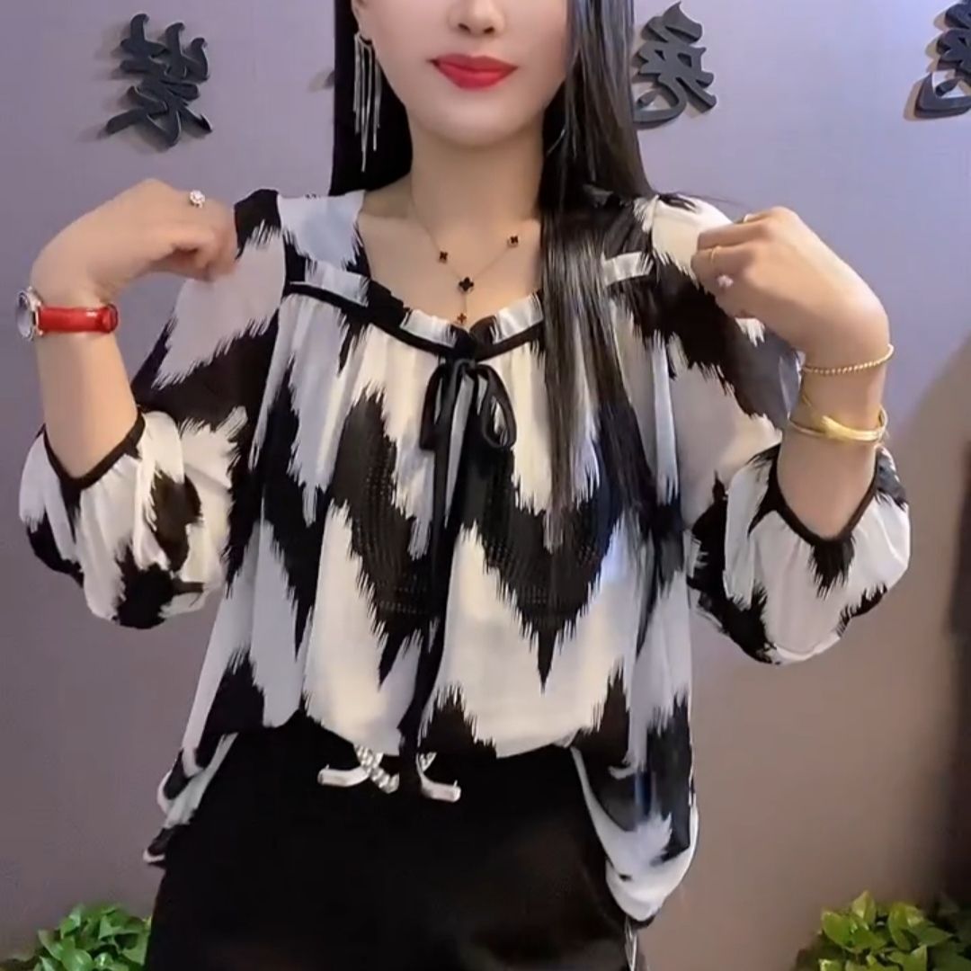 유럽 역 2024 봄과 여름 새로운 티셔츠 여자 유행 올 매치 여자 루즈 레이스 업 꽃 웨스턴 스타일 쉬폰 셔츠스토어 가기