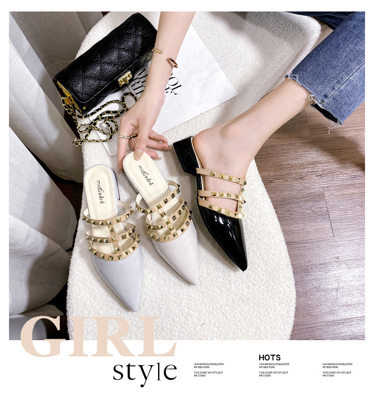 리벳 신발 프랑스 스타일 리벳 샌들 여성 여름 의상 플랫 여름 한국식 특허 가죽 뾰족한 발가락 반 슬리퍼
