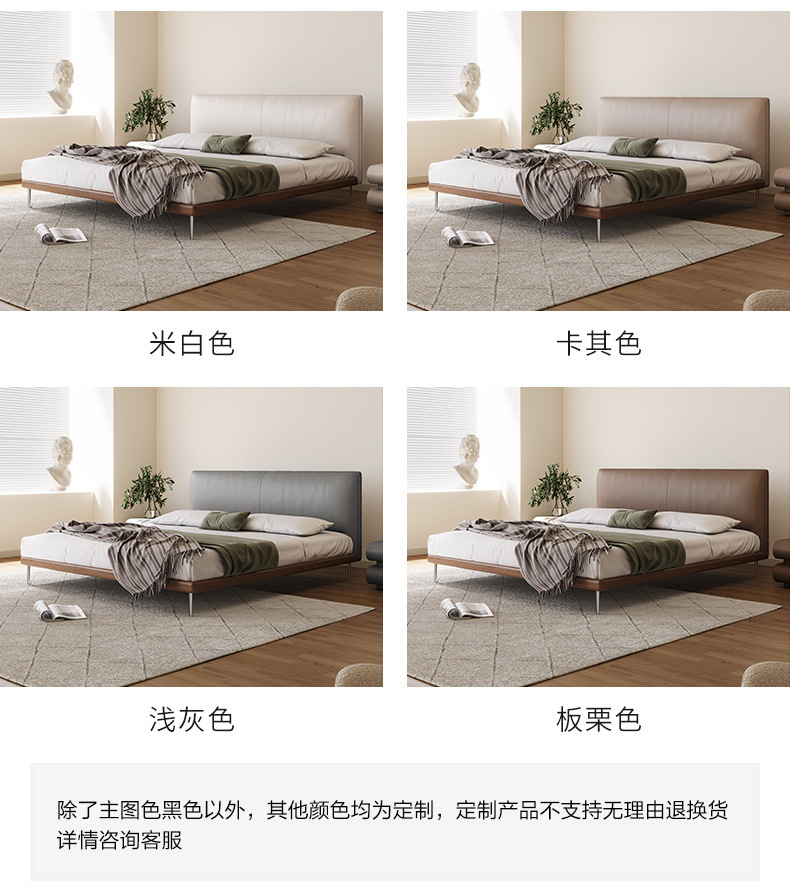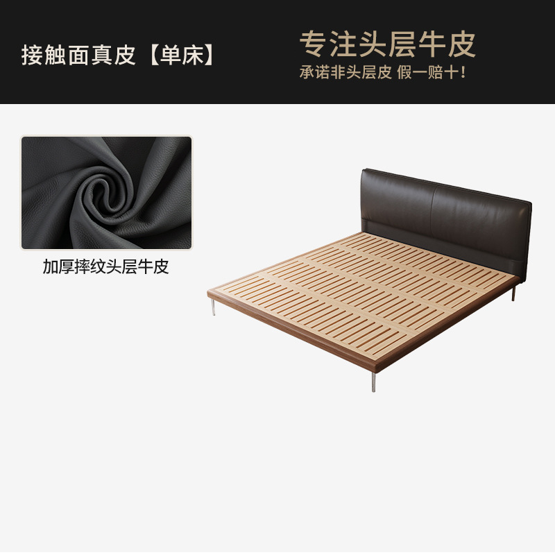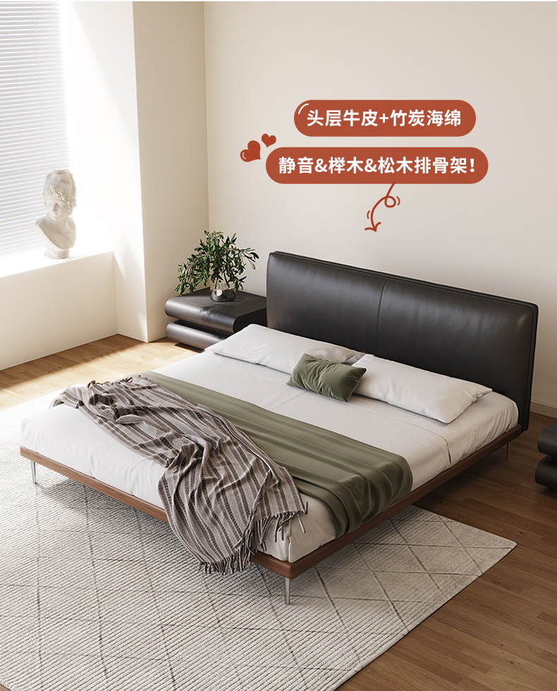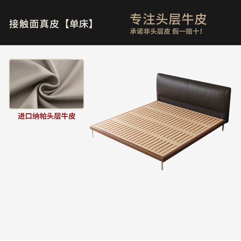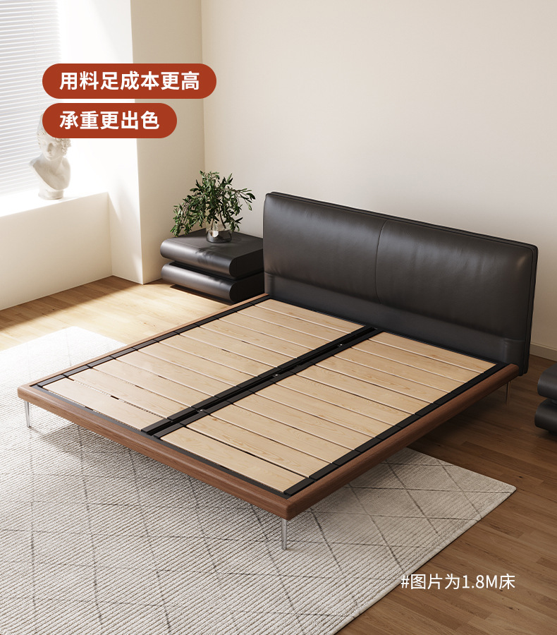 이탈리아 미니멀리스트 가죽 침대 블랙 얇은 침대 침대 레트로 스타일 솔리드 우드 소프트 백 침대 현대 간단한 얇은 콩 커드 블록 침대스토어 가기