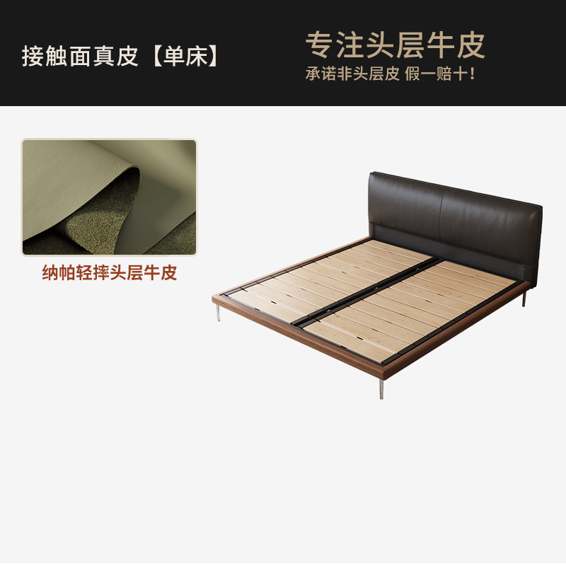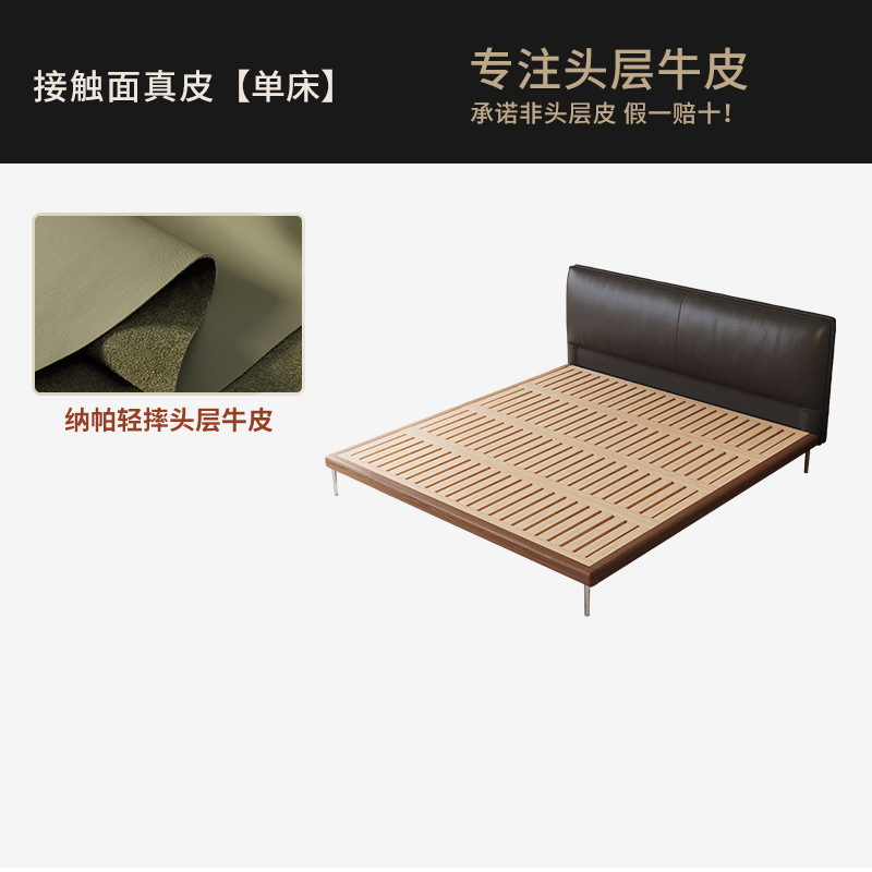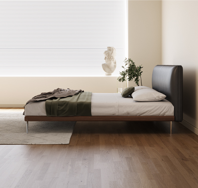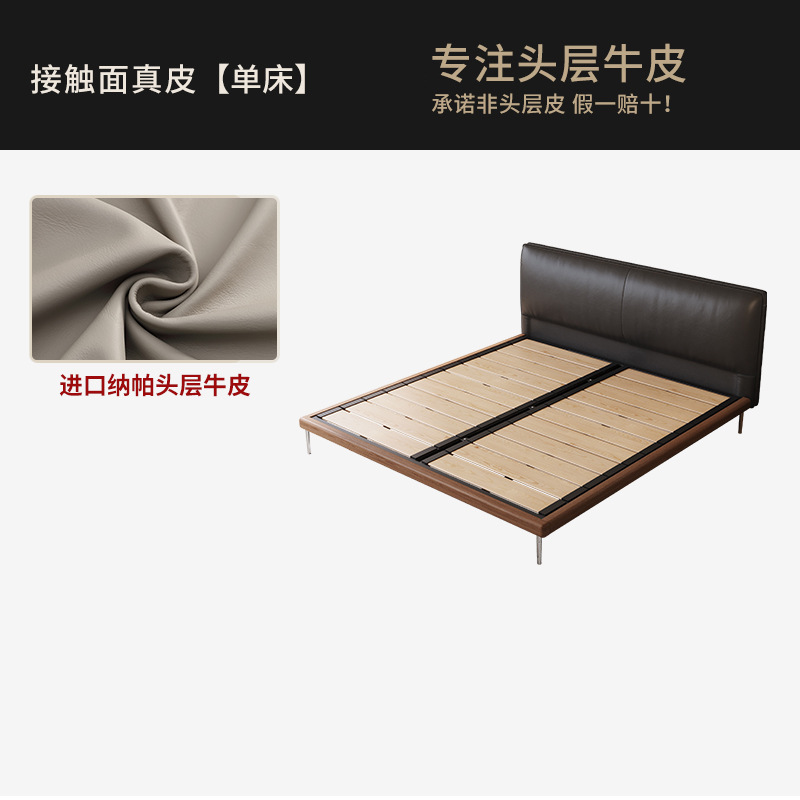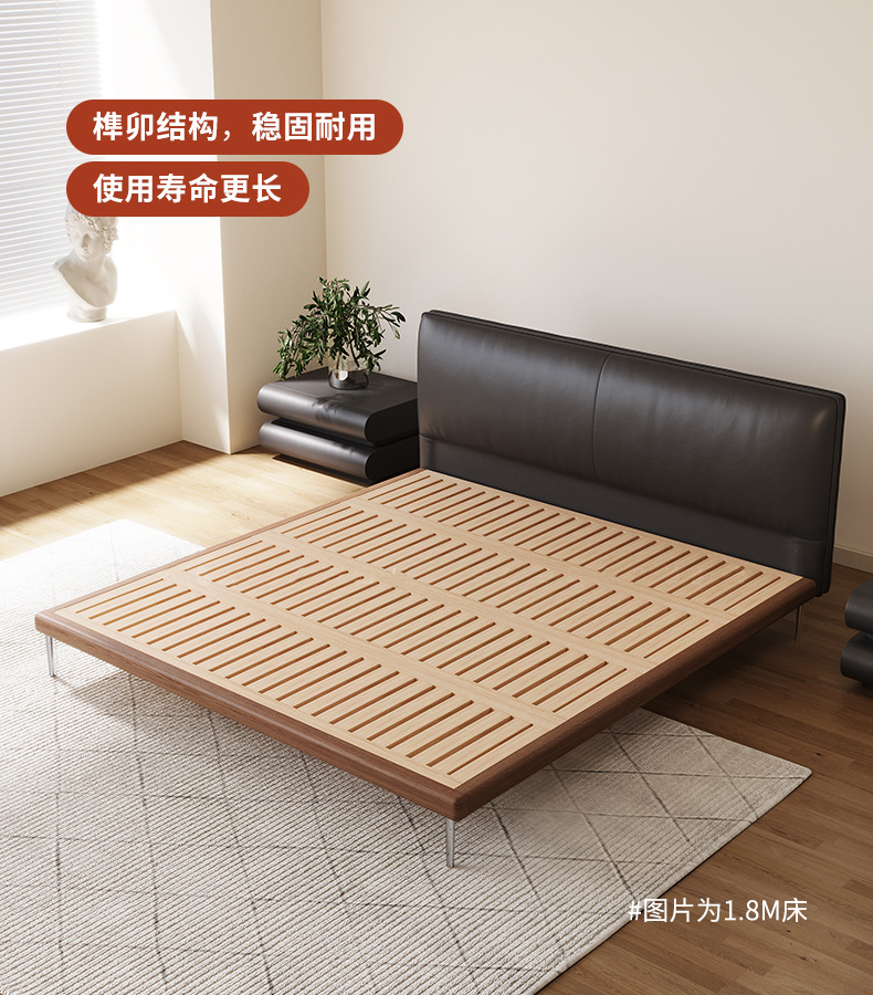 이탈리아 미니멀리스트 가죽 침대 블랙 얇은 침대 침대 레트로 스타일 솔리드 우드 소프트 백 침대 현대 간단한 얇은 콩 커드 블록 침대스토어 가기