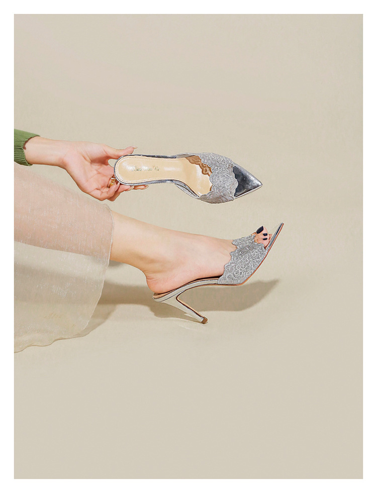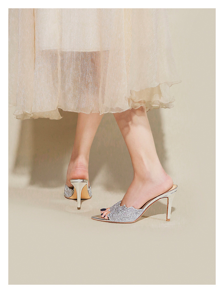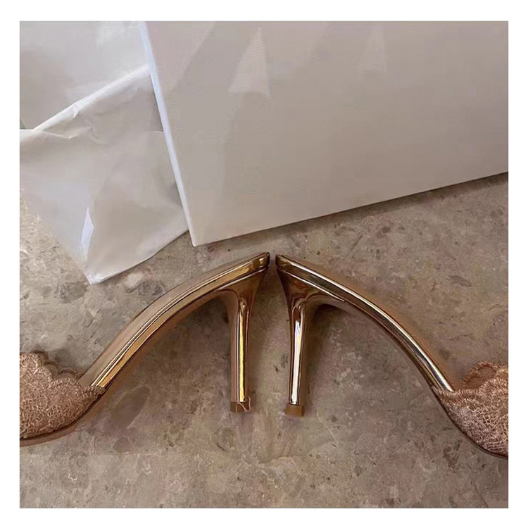 프랑스 샴페인 컬러 레이스 하이힐 2024 새로운 포인팅-발가락 슬라이드 여름 사교계 우아한 착용 하이힐 샌들