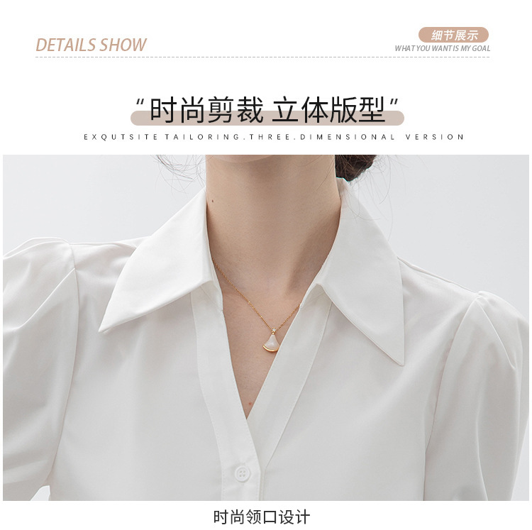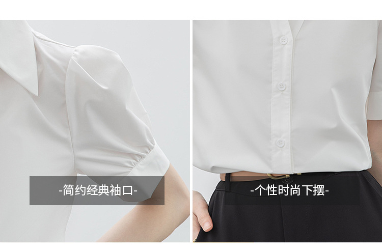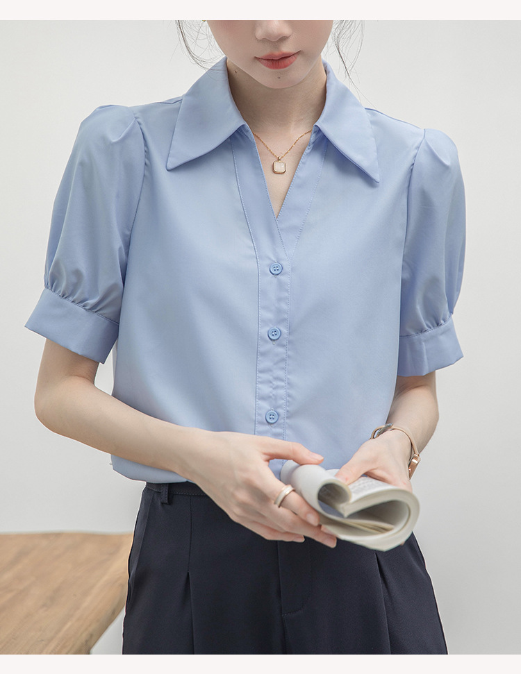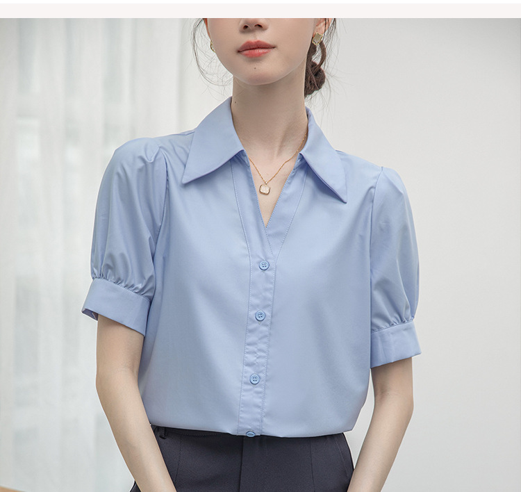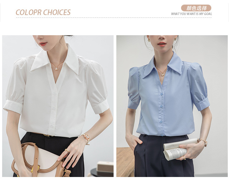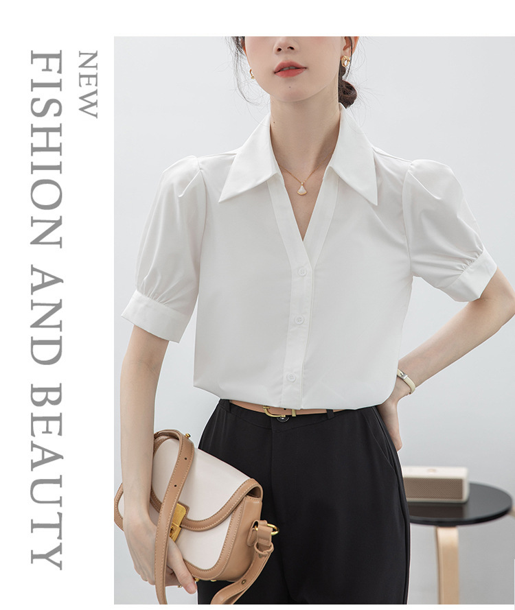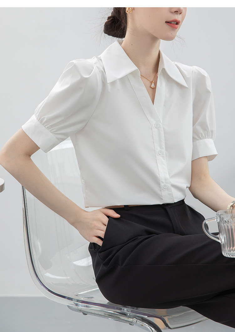 실제 촬영된 흰색 반팔 셔츠, 여름용 브이넥 디자인, 독특하고 작은 사이즈의 직장인 통근 및 면접용 셔츠