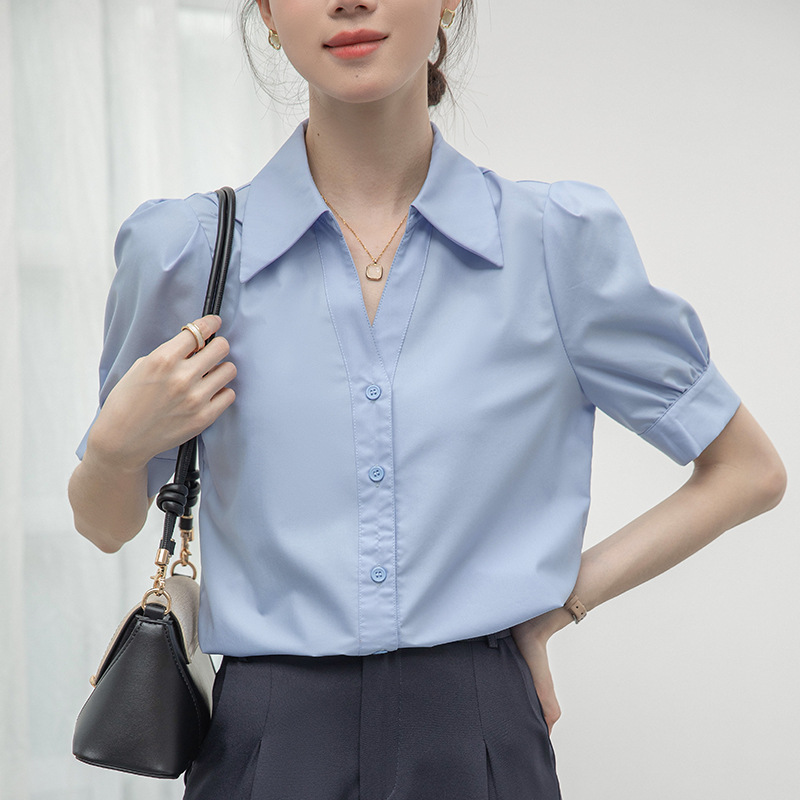 실제 촬영된 흰색 반팔 셔츠, 여름용 브이넥 디자인, 독특하고 작은 사이즈의 직장인 통근 및 면접용 셔츠스토어 가기