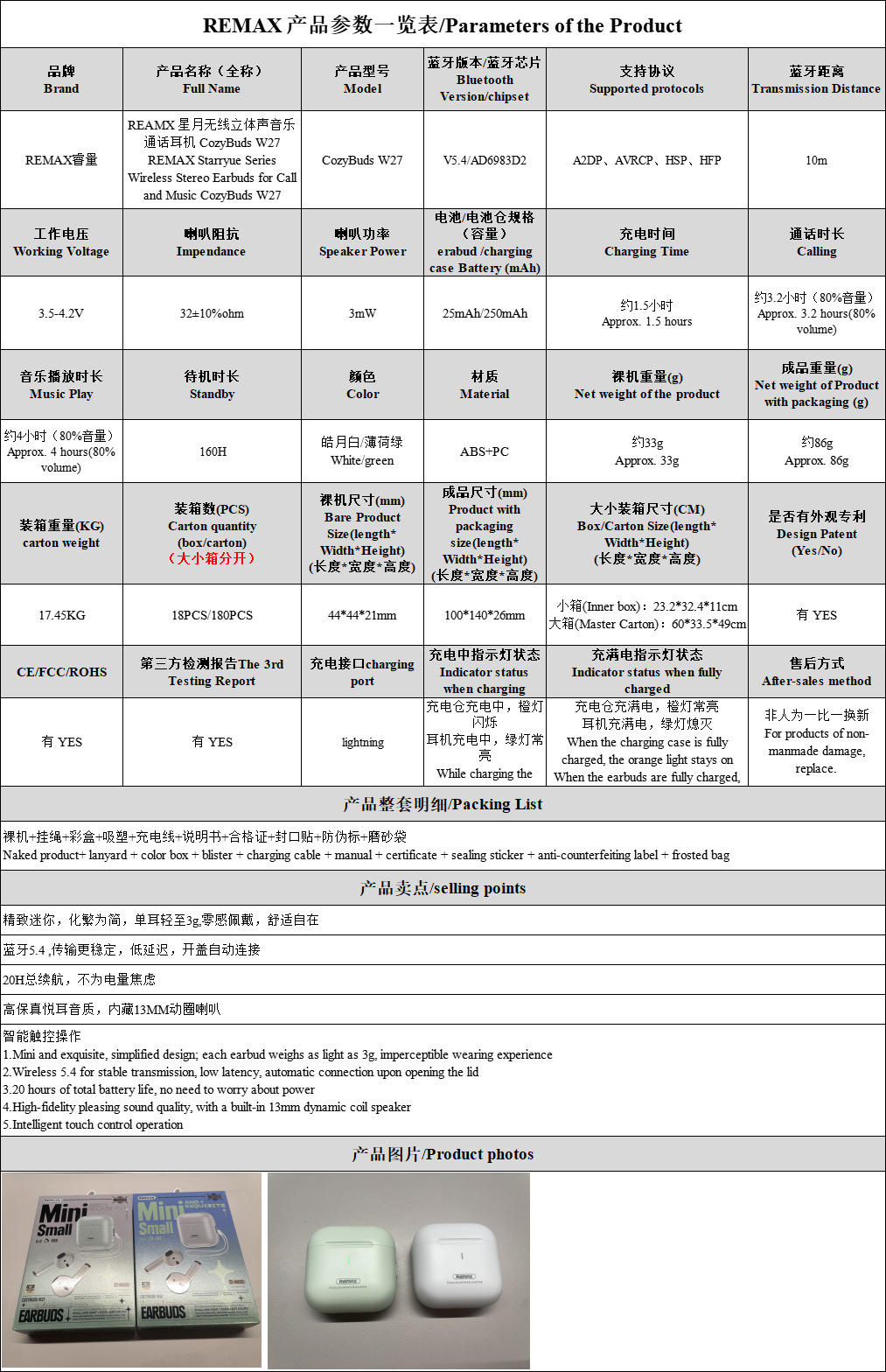 REAMX 스타 문 무선 블루투스 5.4 스테레오 뮤직 콜 HIFI 하이 피델리티 터치 미니 헤드셋 W27