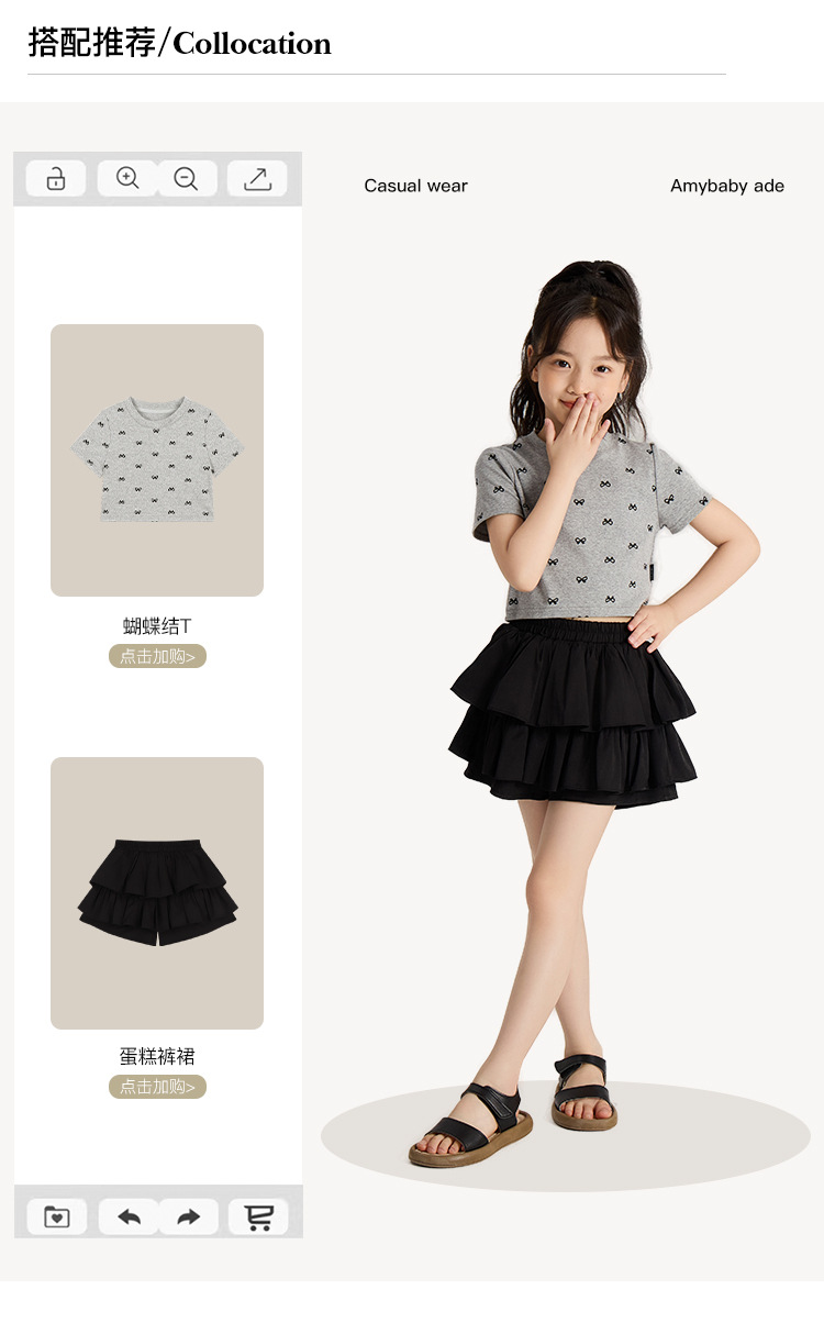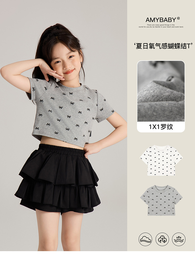 Amybaby 소녀의 짧은 소매 여름 2024 새로운 어린이 달콤한 귀여운 활 인쇄 라운드 넥 티셔츠 탑스토어 가기