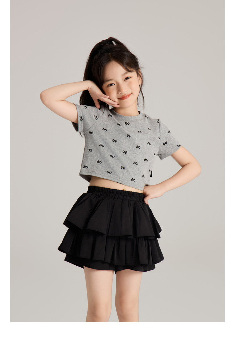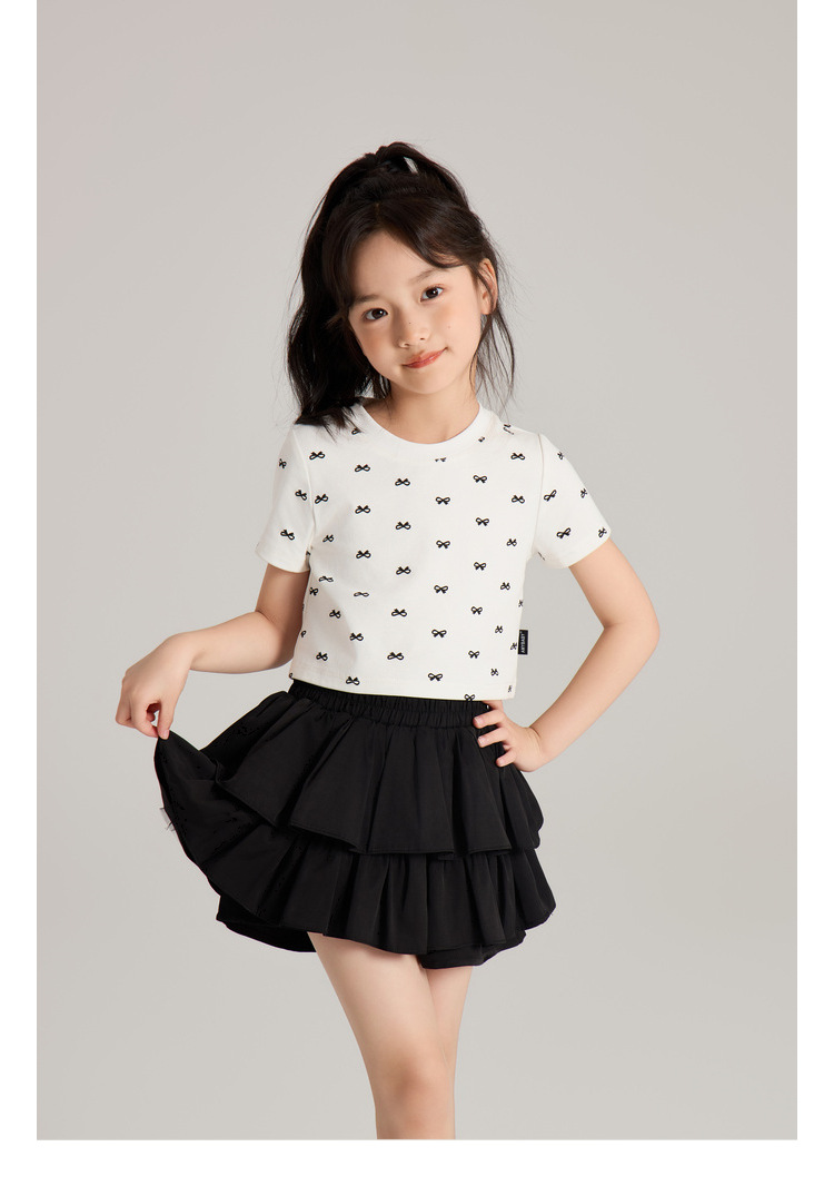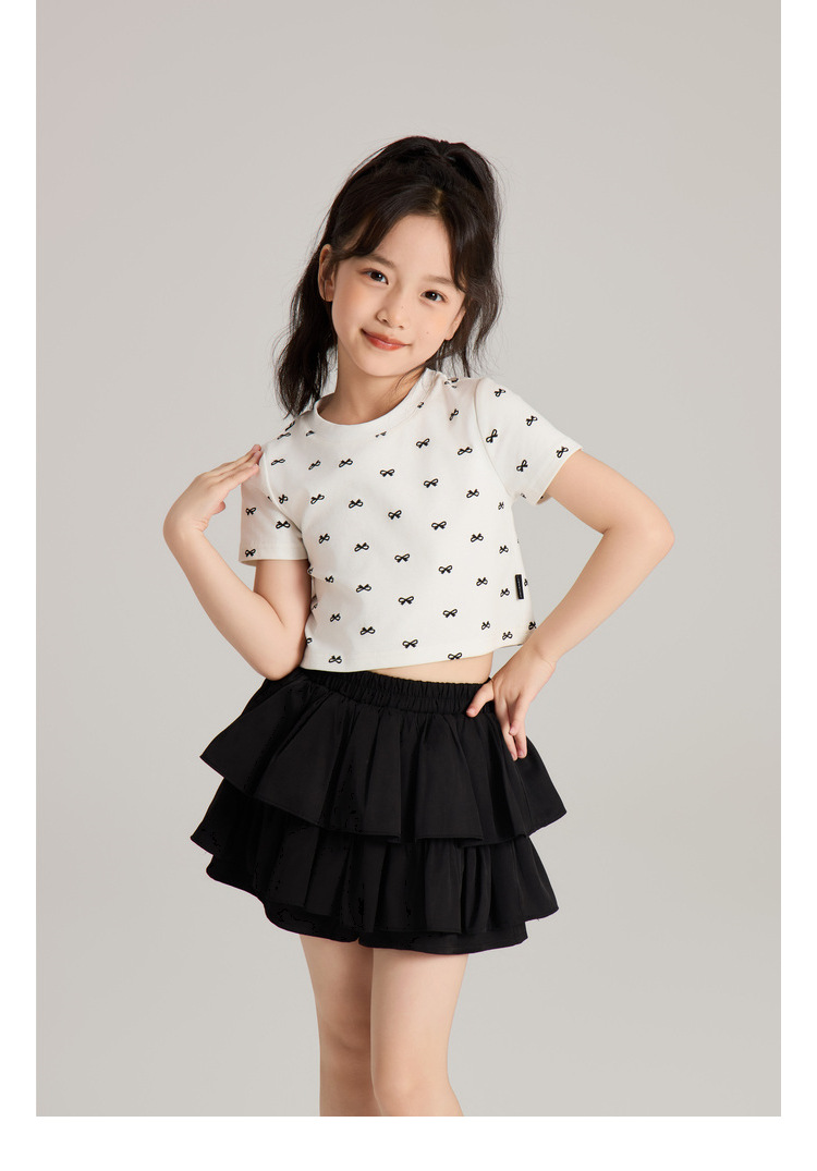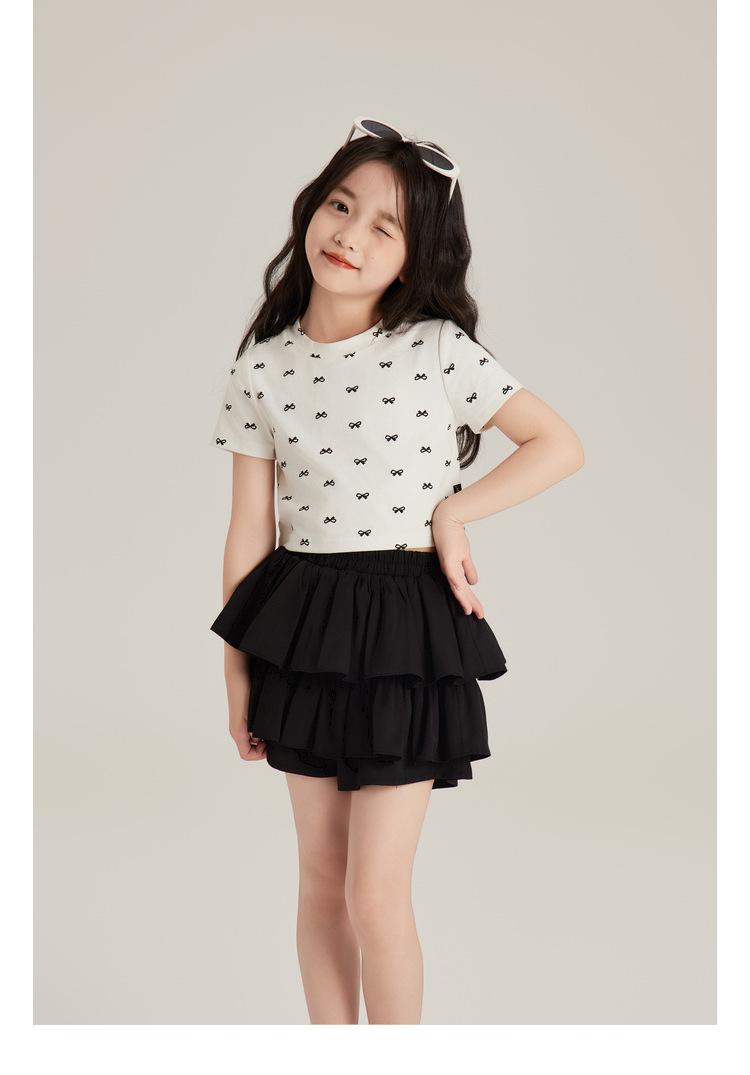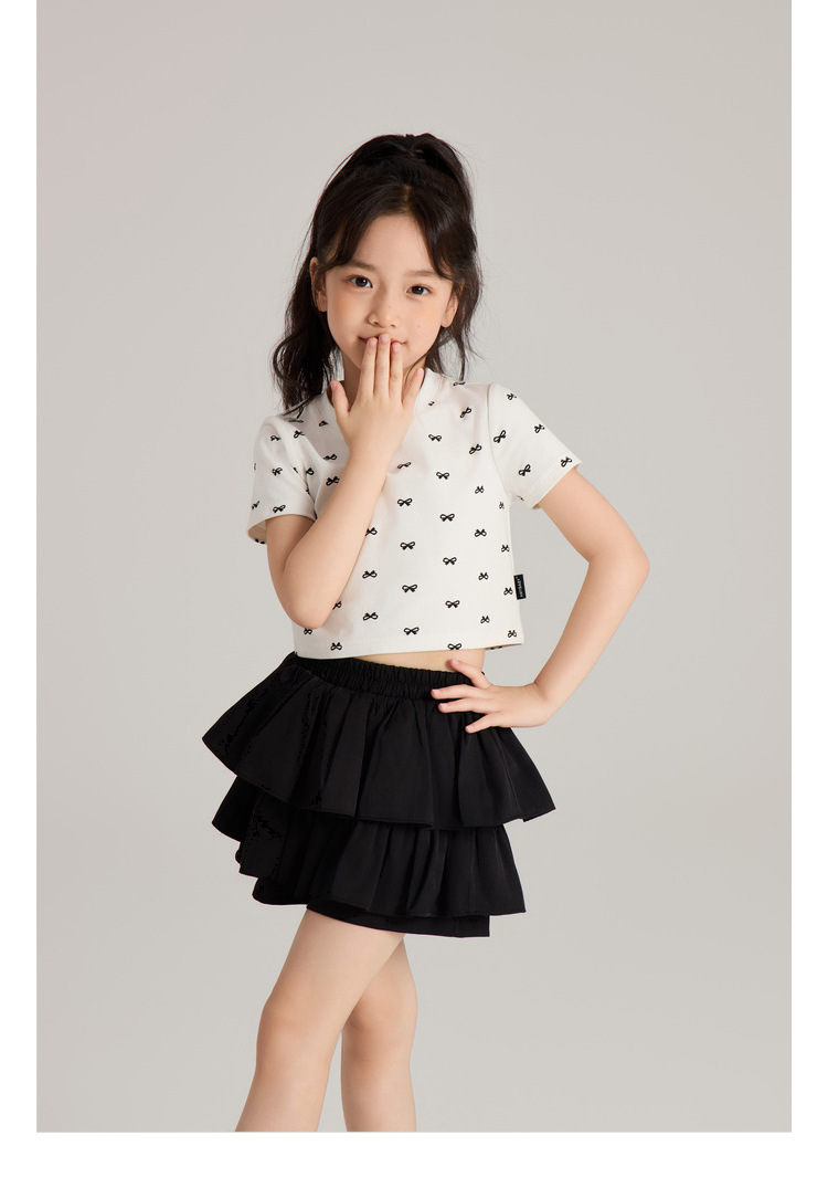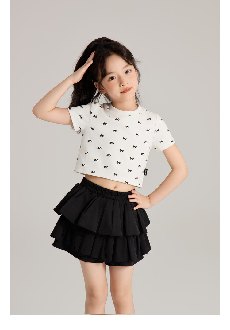 Amybaby 소녀의 짧은 소매 여름 2024 새로운 어린이 달콤한 귀여운 활 인쇄 라운드 넥 티셔츠 탑