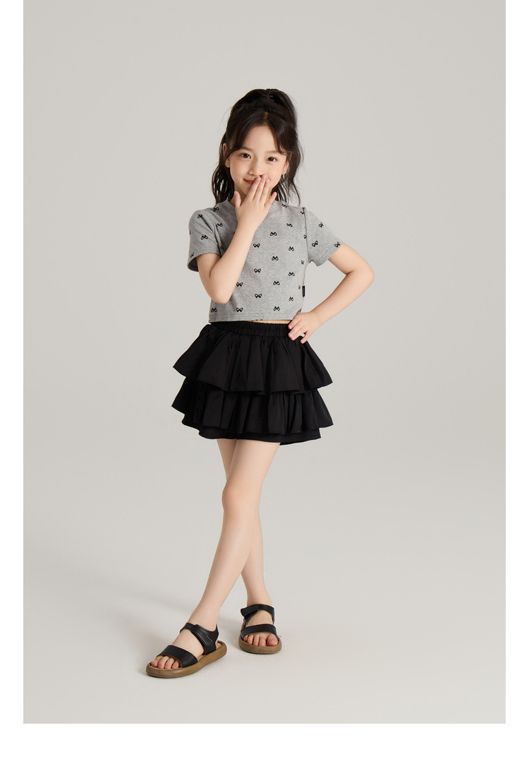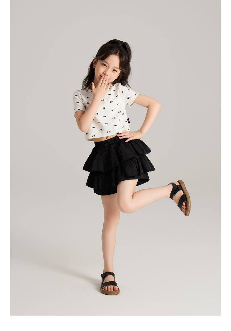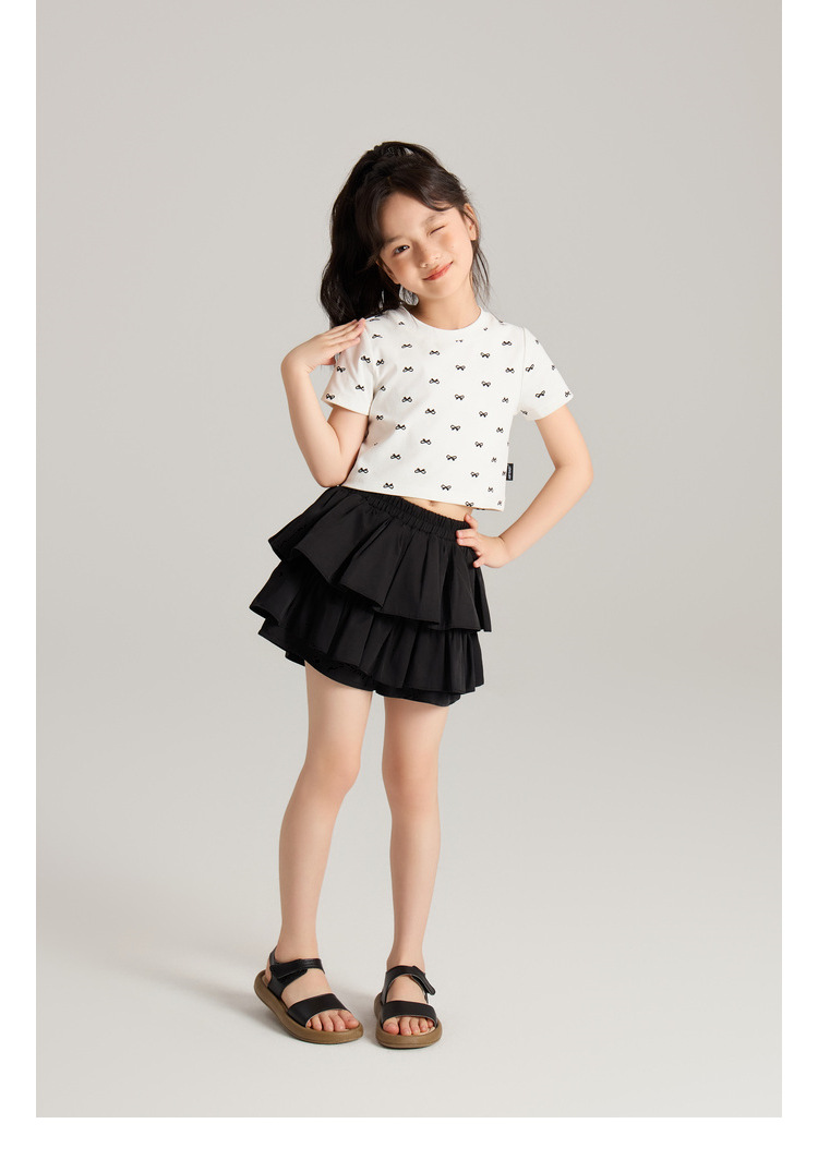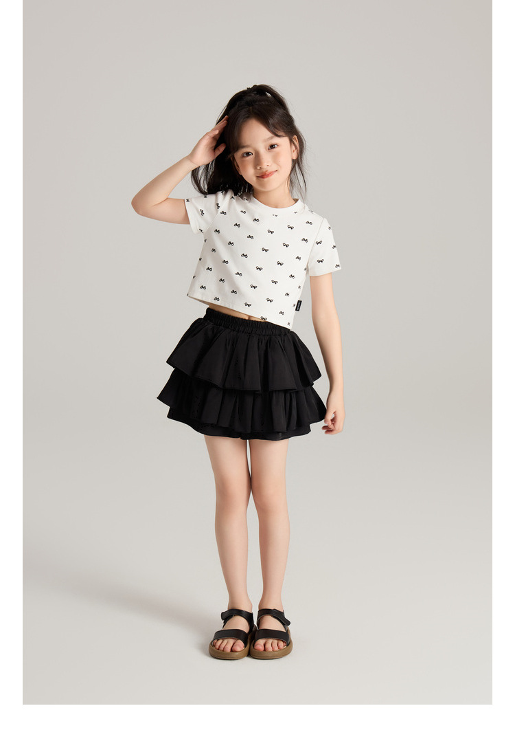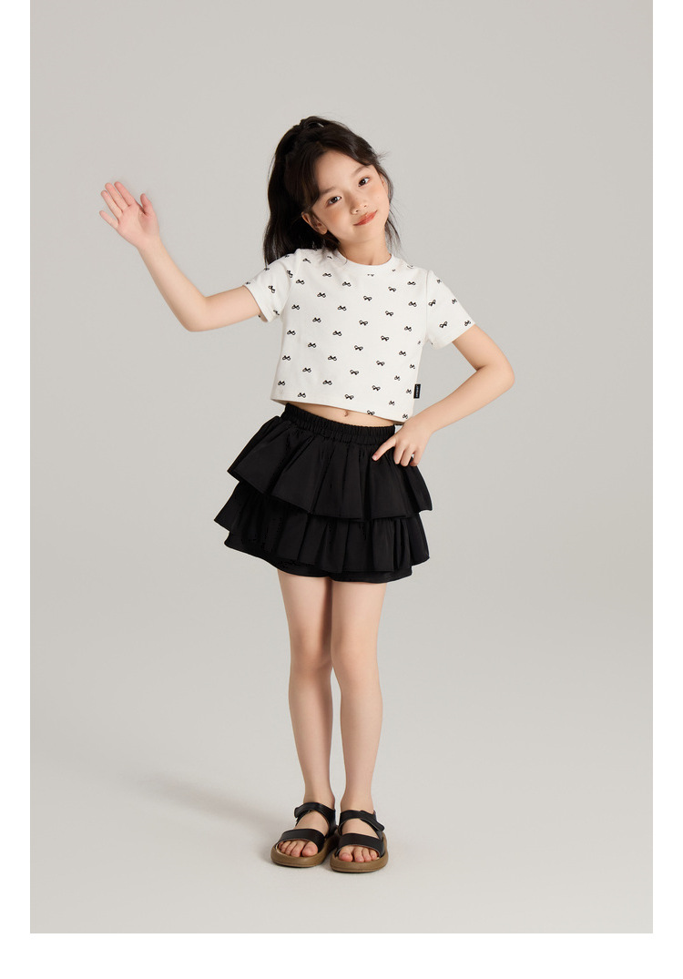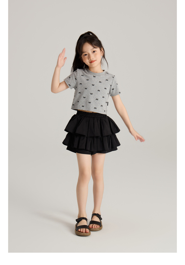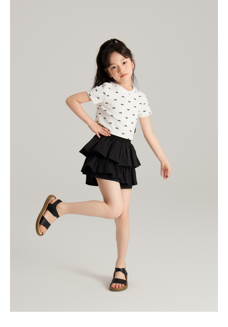 Amybaby 소녀의 짧은 소매 여름 2024 새로운 어린이 달콤한 귀여운 활 인쇄 라운드 넥 티셔츠 탑