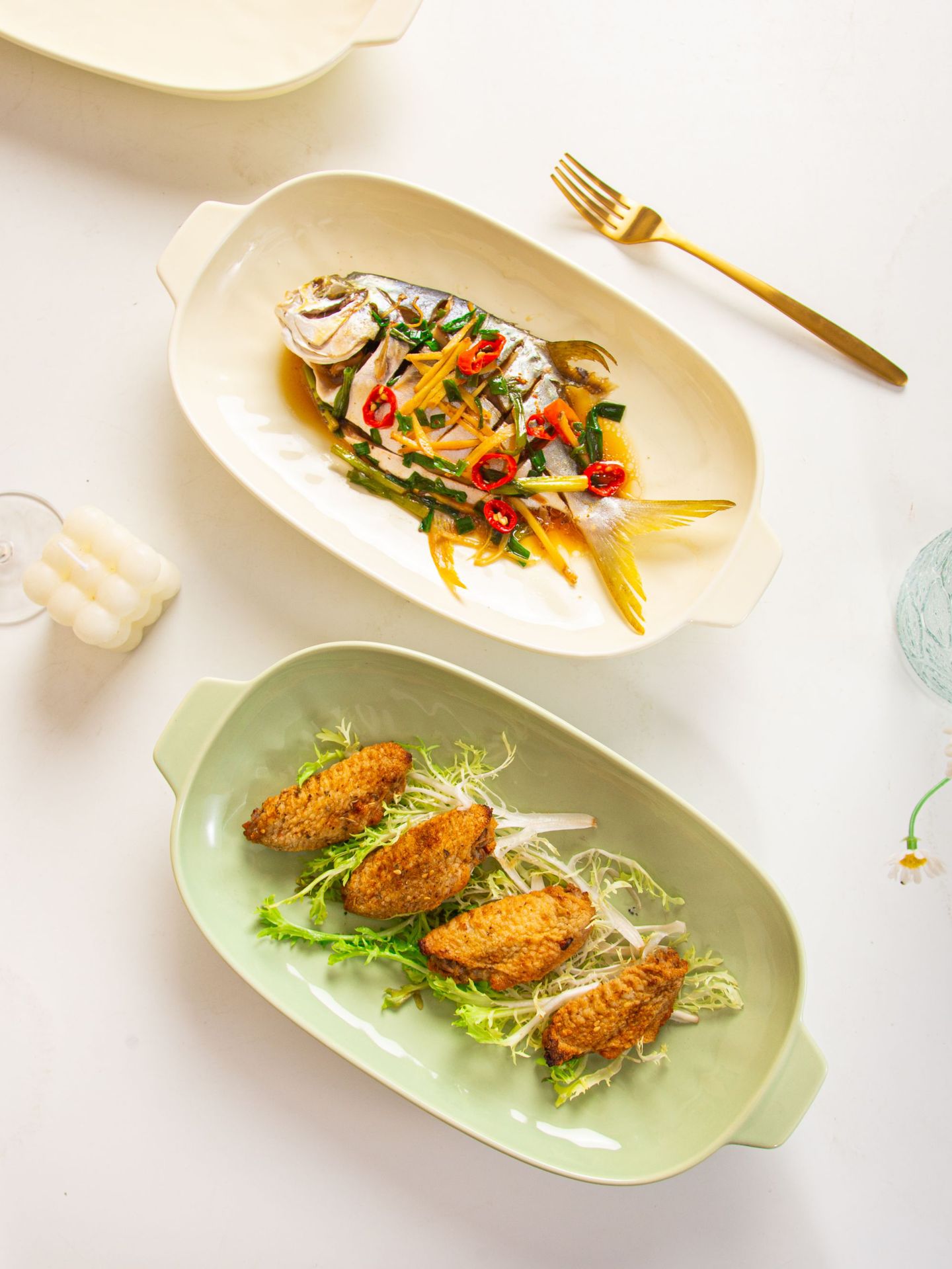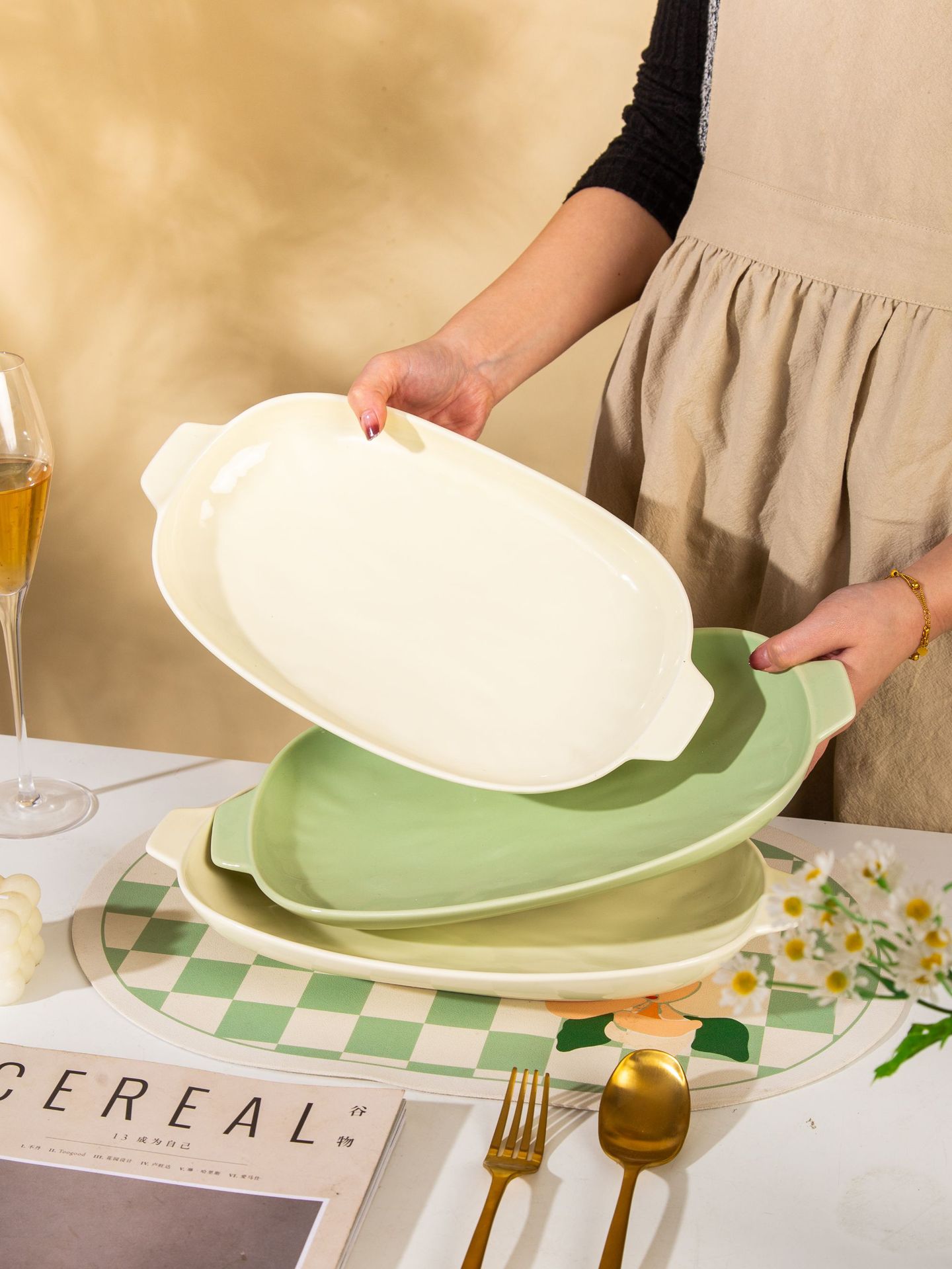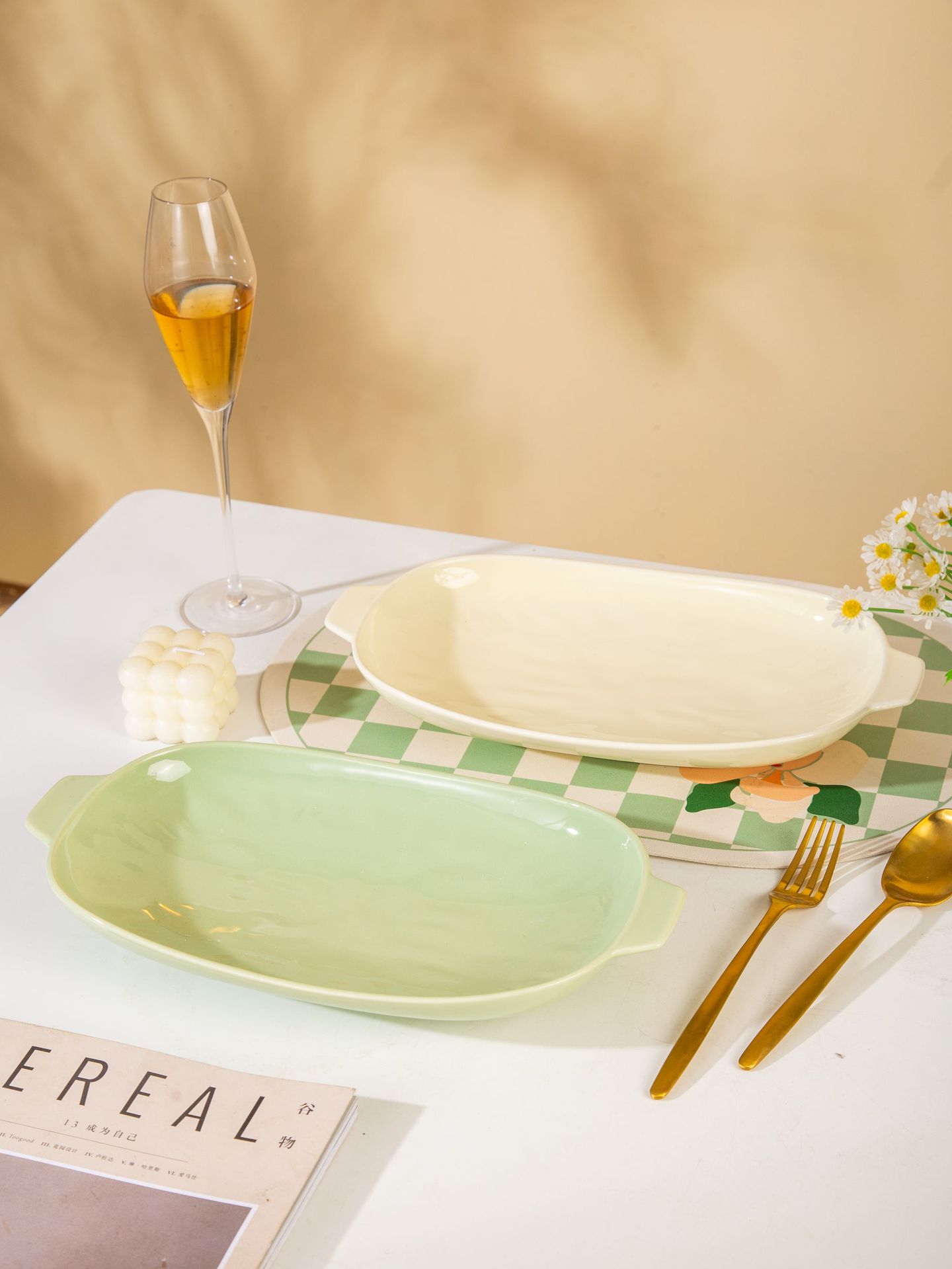 인터넷 트렌드 높은 뷰티 가치 크림 스타일 세라믹 플레이트 가정용 단일 찐 생선 플레이트 언더 유약 컬러 디너 플레이트 바이나럴 베이킹 플레이트 식기