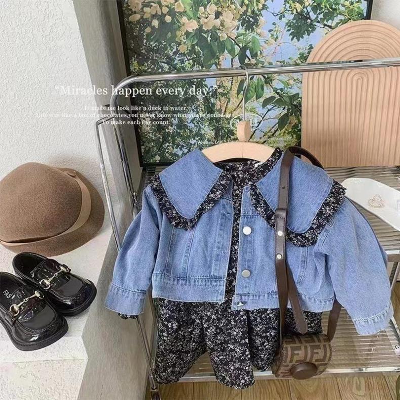 소녀의 봄 세트 새로운 한국 스타일 어린이 데님 코트 소녀의 꽃 원피스 아기의 스타일리스트 투피스 세트스토어 가기