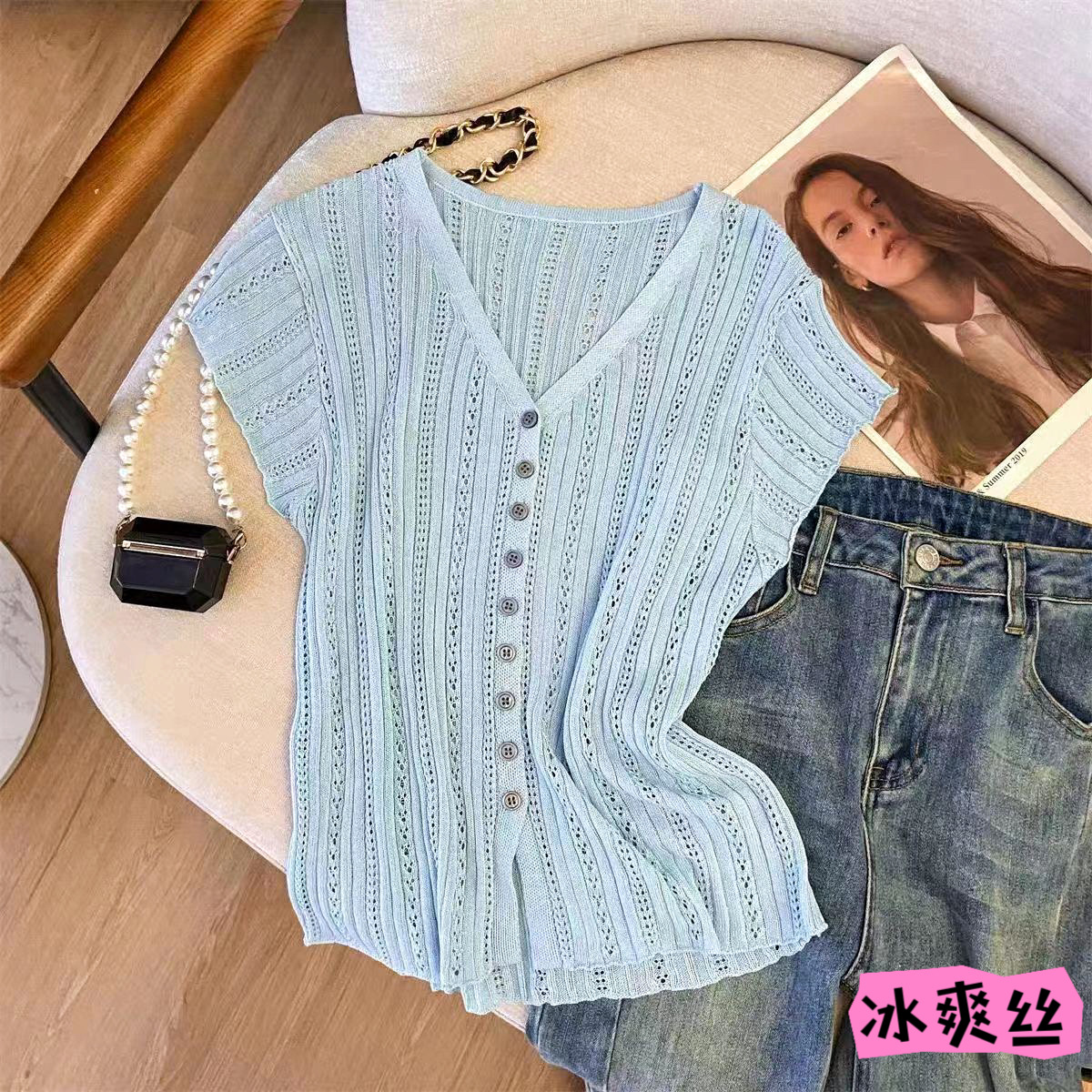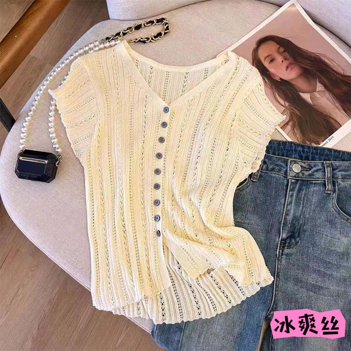 중공 구덩이 아이스 실크 니트 티셔츠 여성용 여름 새로운 프랑스 스타일 우아한 V-넥 작은 플라이 슬리브 버클 카디건 쇼트 탑
