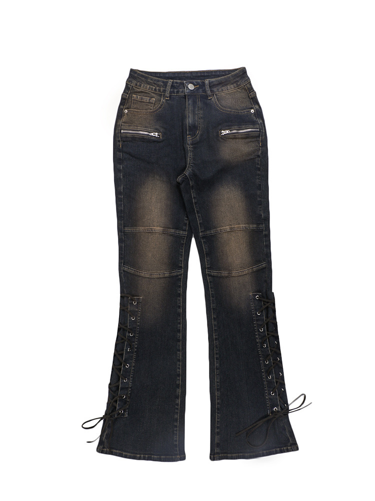 2024 유럽과 미국의 새로운 하이 허리 청바지 스트리트 패션 데님 바지 스트랩 지퍼 슬림 핏 바지 여성스토어 가기