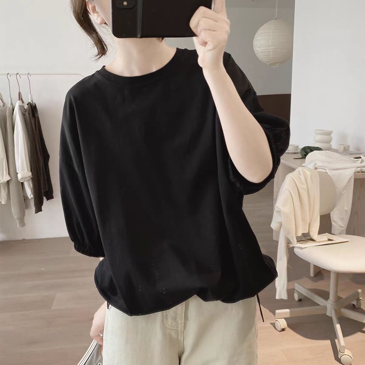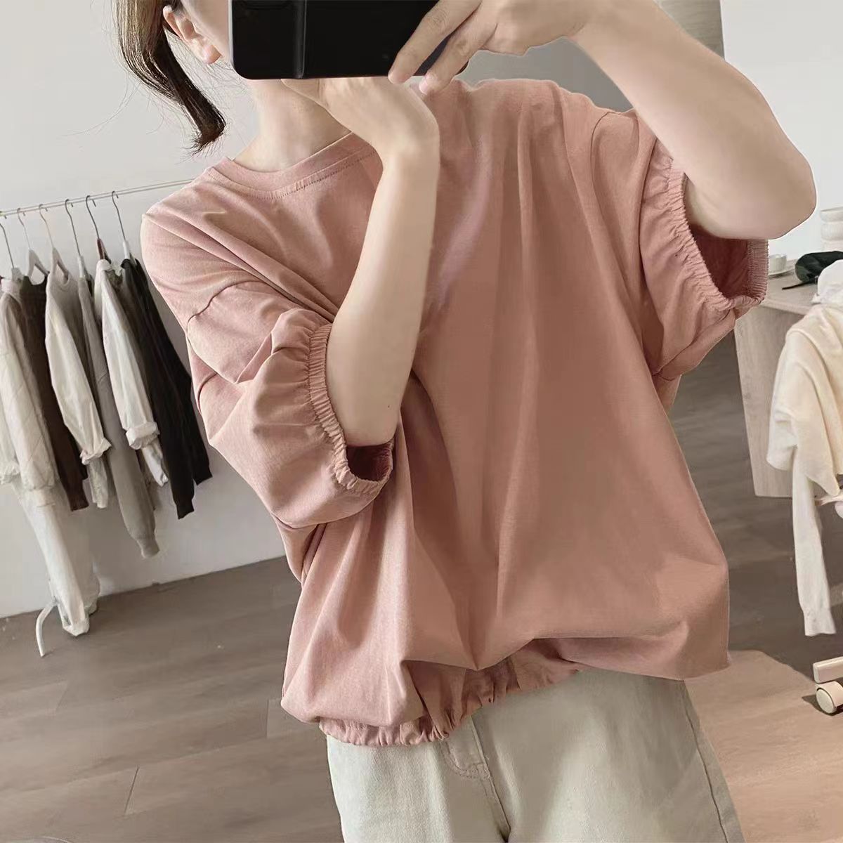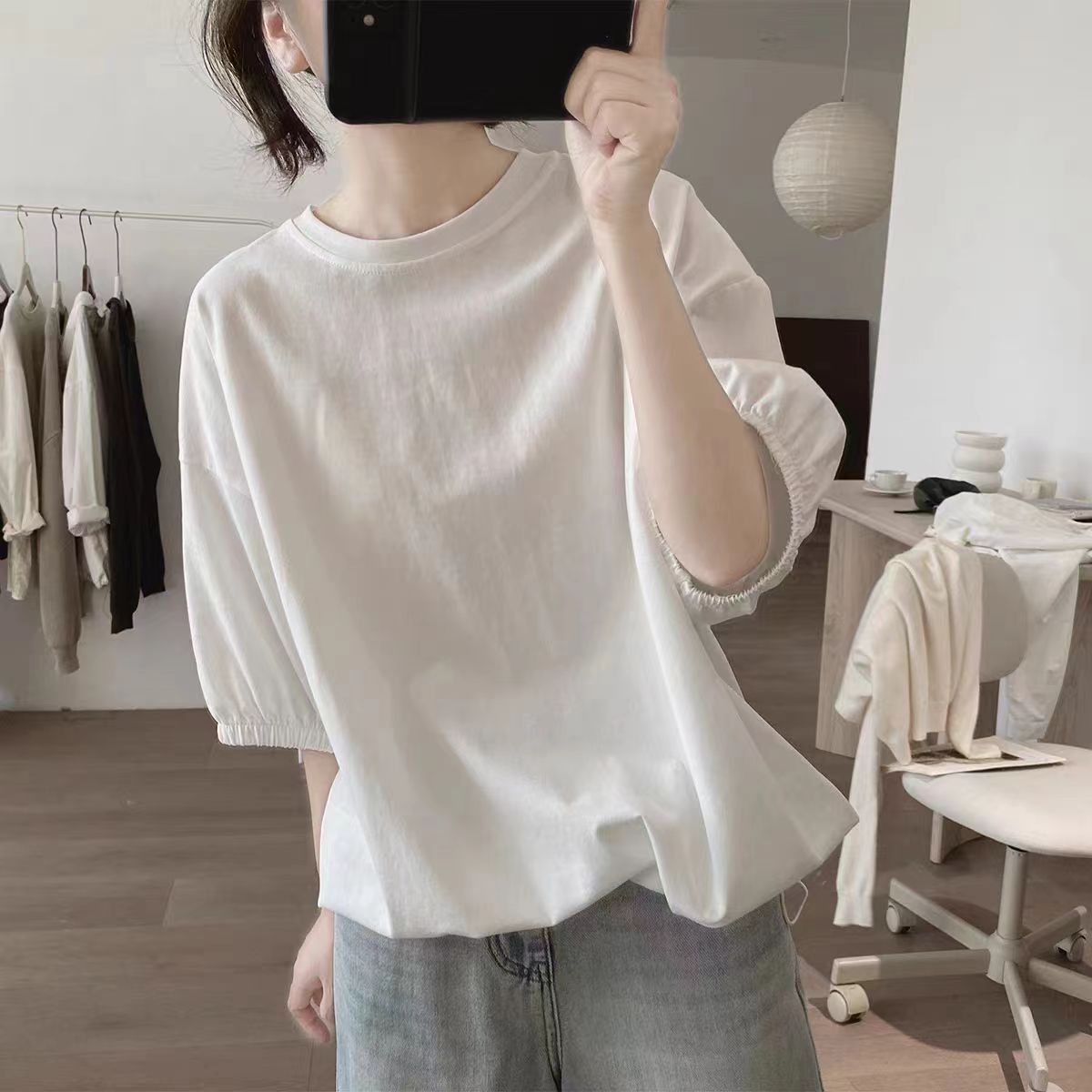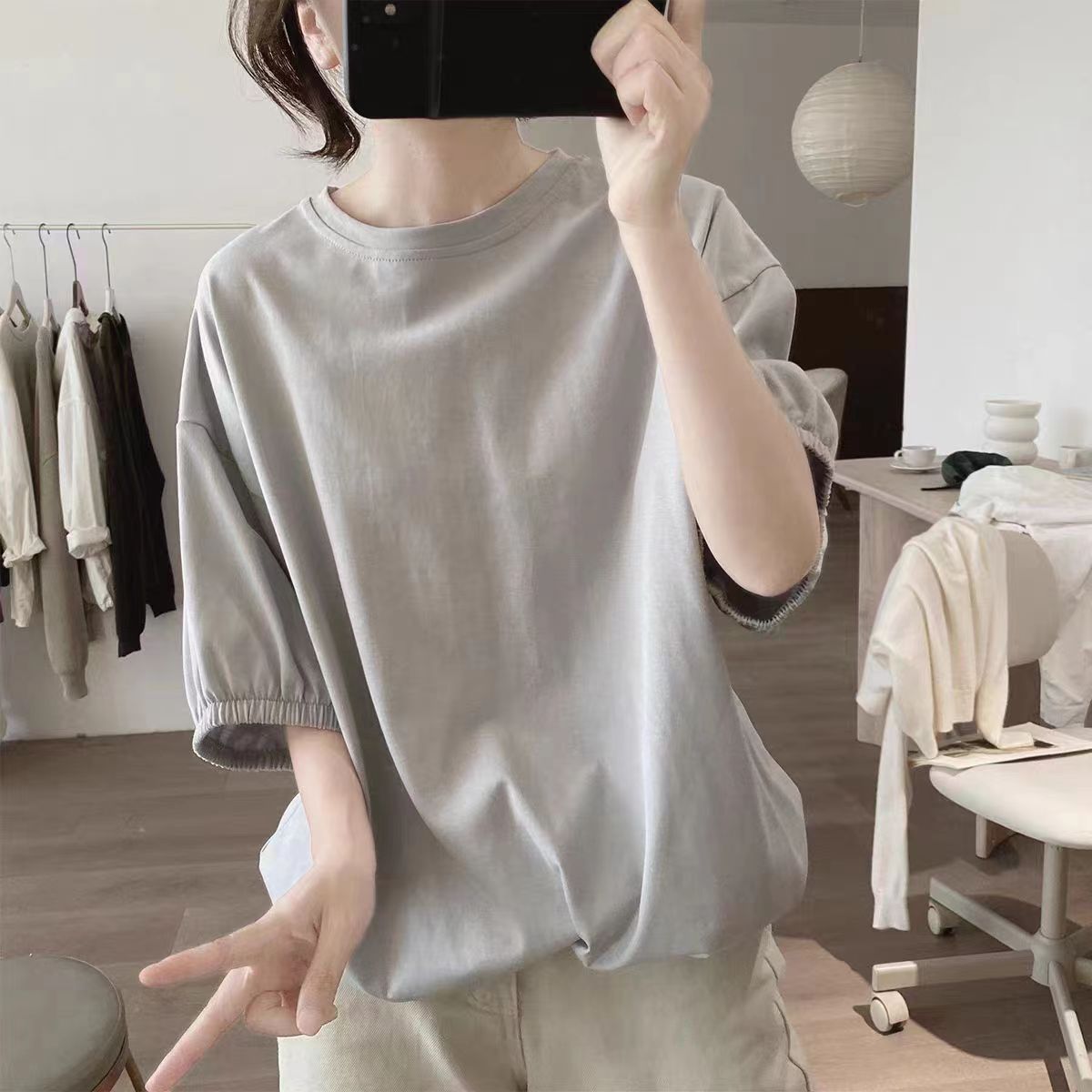 등불 소매 티셔츠 여성용 여름 새로운 느슨한 슬리밍 라운드 넥 한국식 기본 간단한 면화 시대 감소 탑