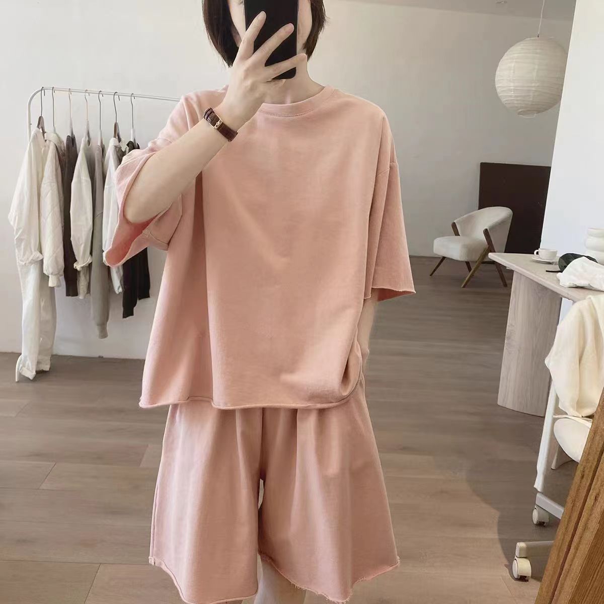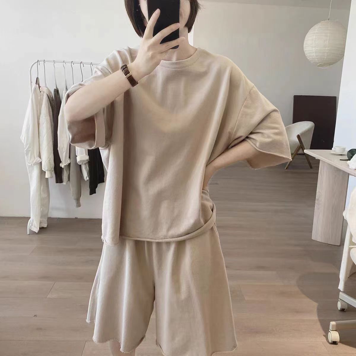 솔리드 컬러 와이드 레그 반바지 투피스 세트 여성 여름 새로운 느슨한 플러스 사이즈 슬리밍 간단한 라운드 넥 에이지 감소 티셔츠 세트스토어 가기