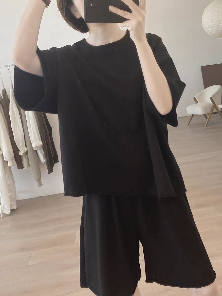 솔리드 컬러 와이드 레그 반바지 투피스 세트 여성 여름 새로운 느슨한 플러스 사이즈 슬리밍 간단한 라운드 넥 에이지 감소 티셔츠 세트