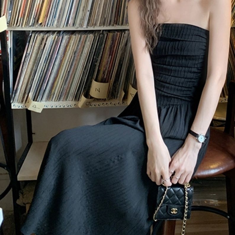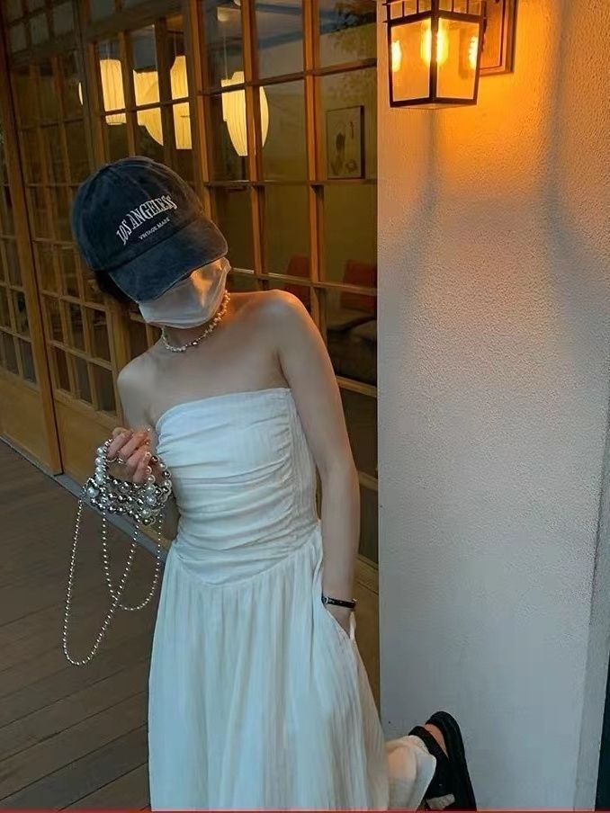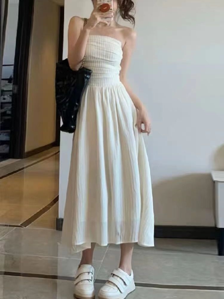 달콤한 흰색 끈이없는 원피스 여성의 봄 2024 새로운 부드러운 우아한 주름진 허리 가슴 포장 기본 원피스