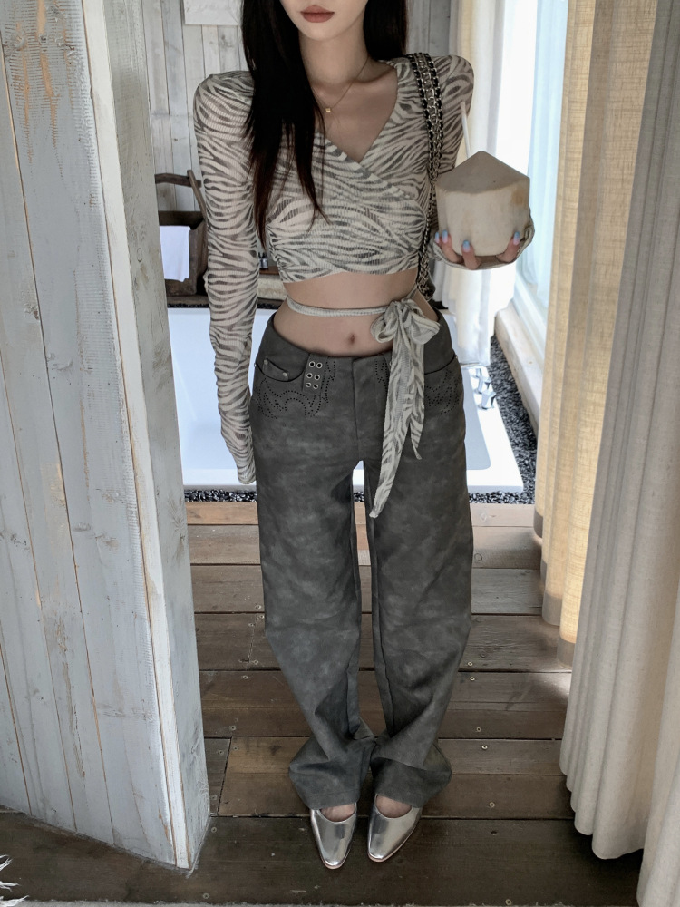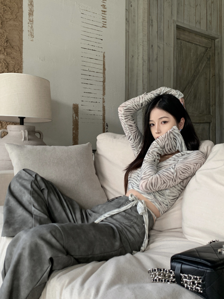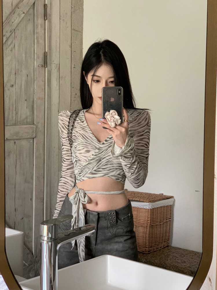 얇은 선 스크린 크로스 V 넥 얼룩말 티셔츠 여성용 여름 스파이스 걸스 섹시한 스트랩 짧은 긴 소매 탑