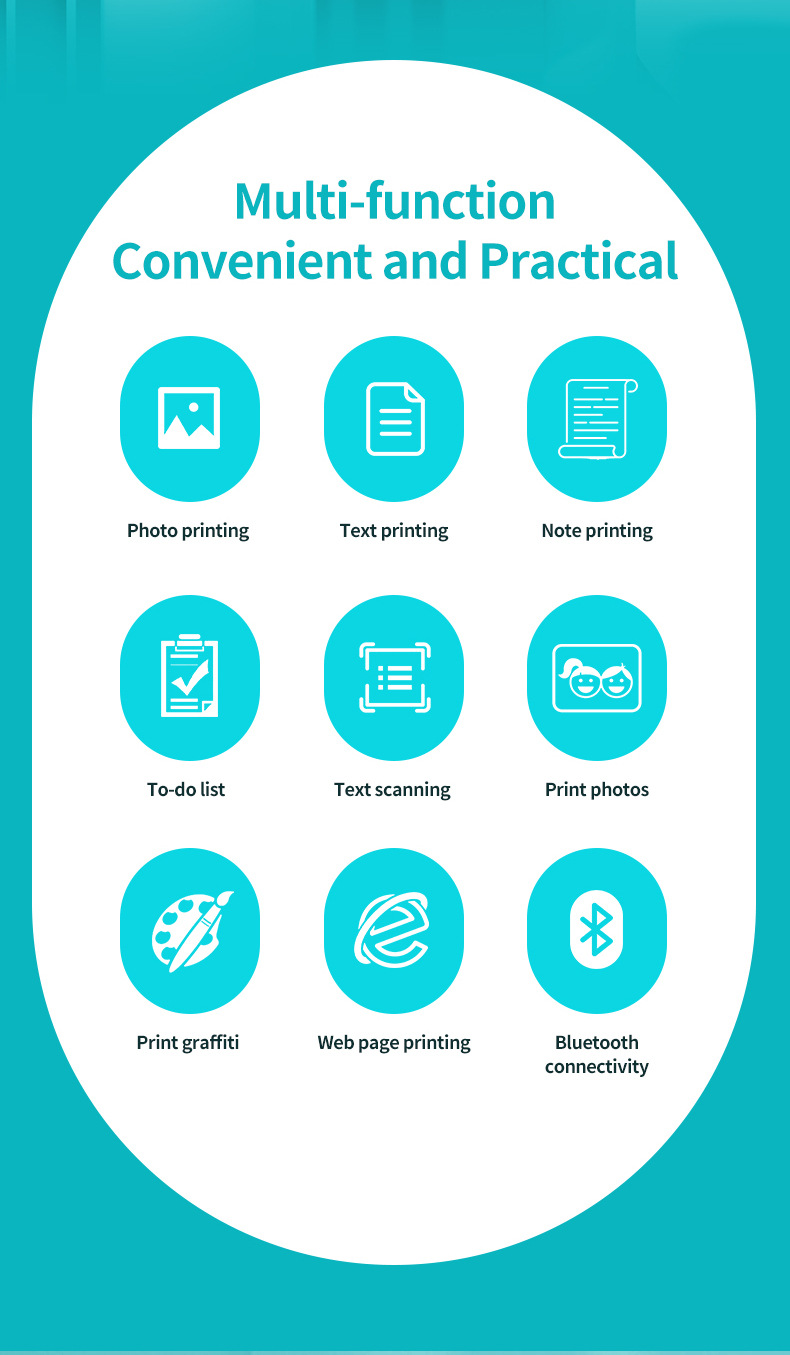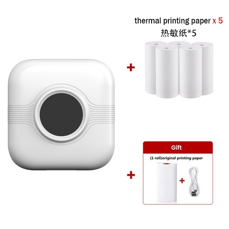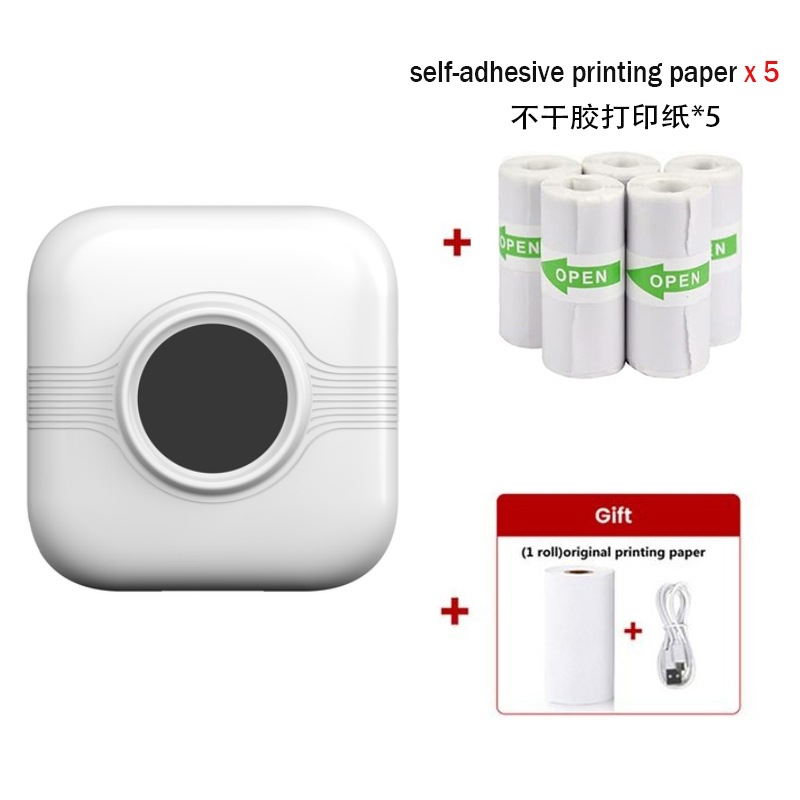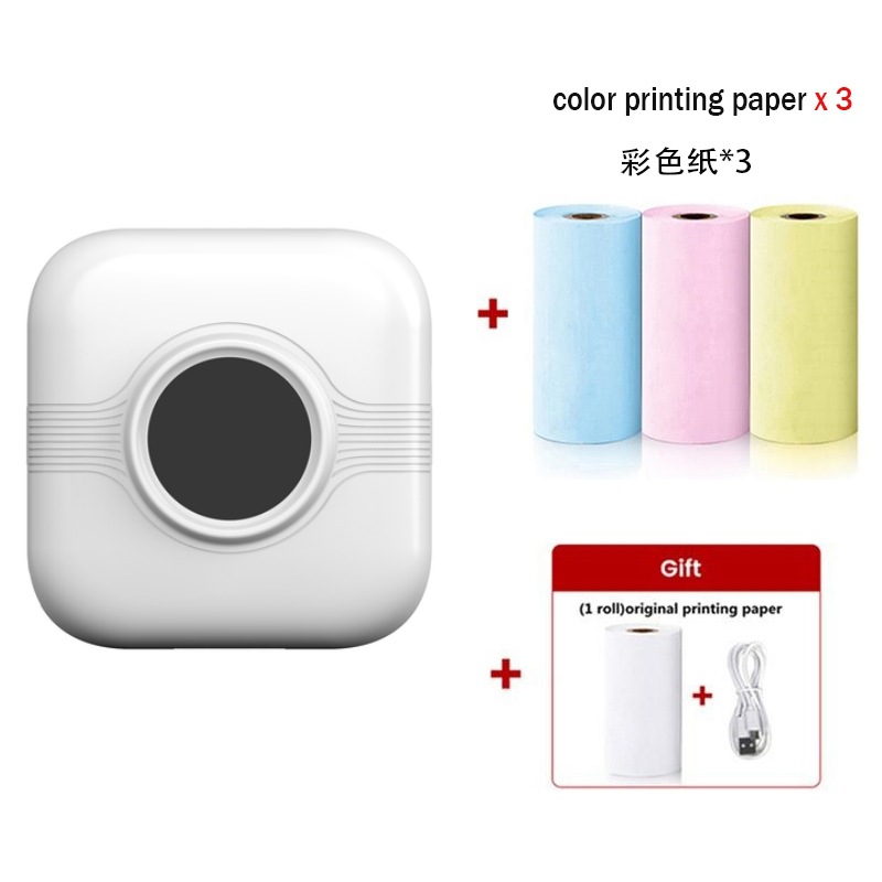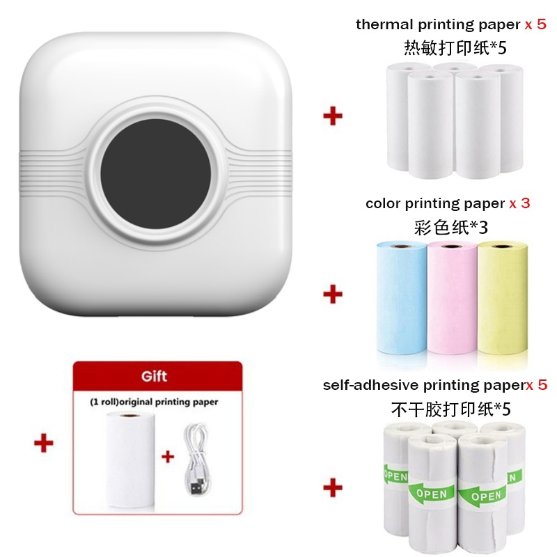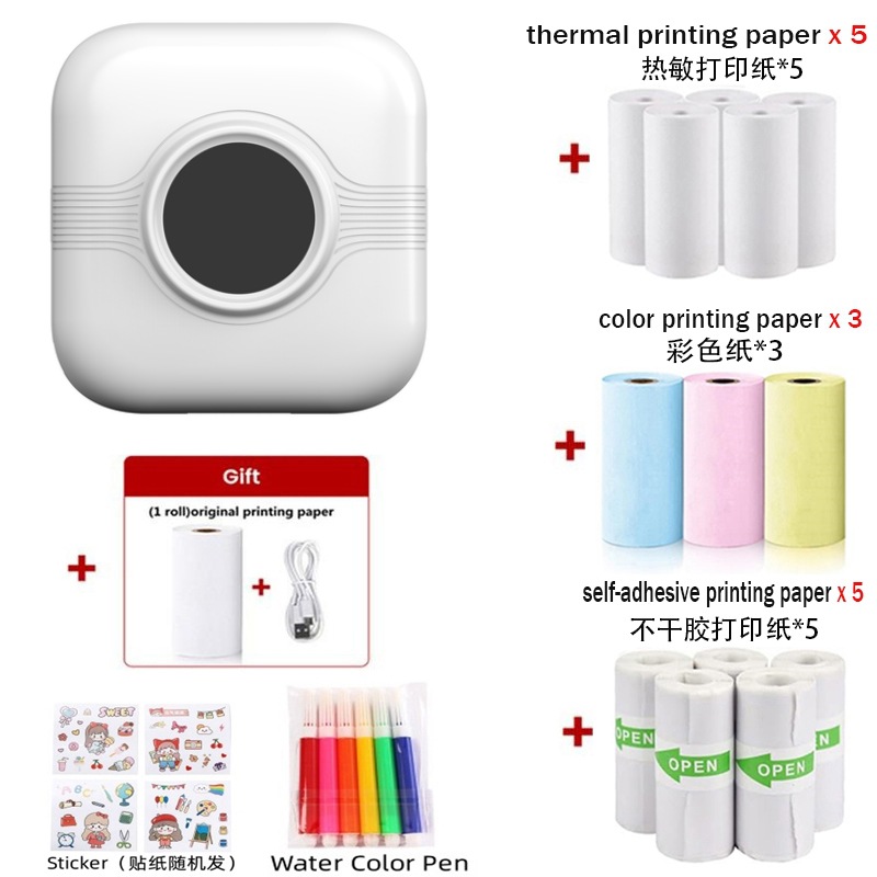 打印机1台+【自带1卷热敏纸+5卷热敏纸+5卷不干胶+3卷彩色纸+6支水彩笔+贴纸】为一整套。