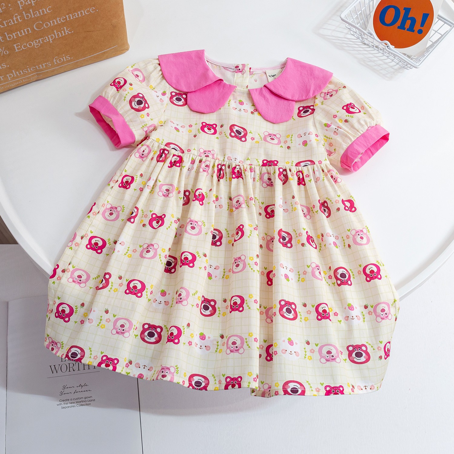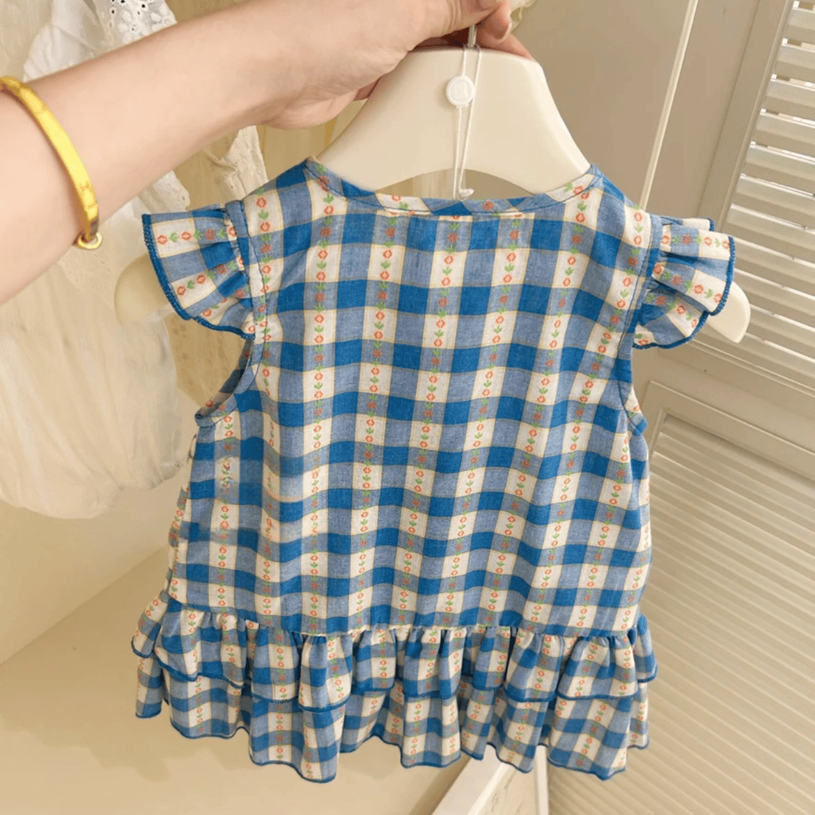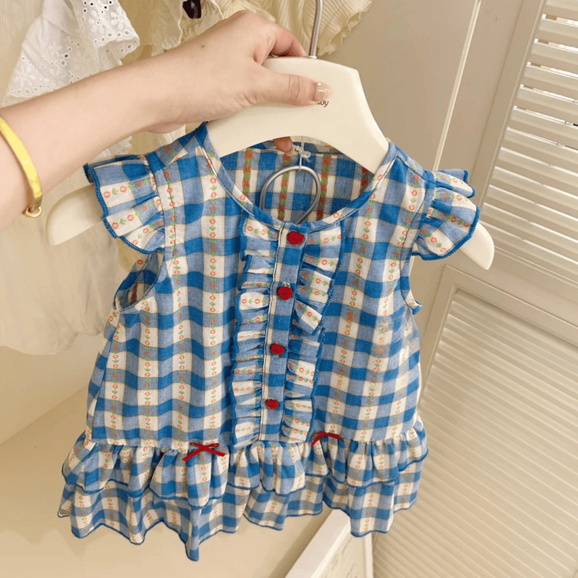 한국 아동복 소녀 원피스 2024 새로운 여름 어린이 아기 작은 신선한 색상 매칭 블루 체크 무늬 조끼 스커트