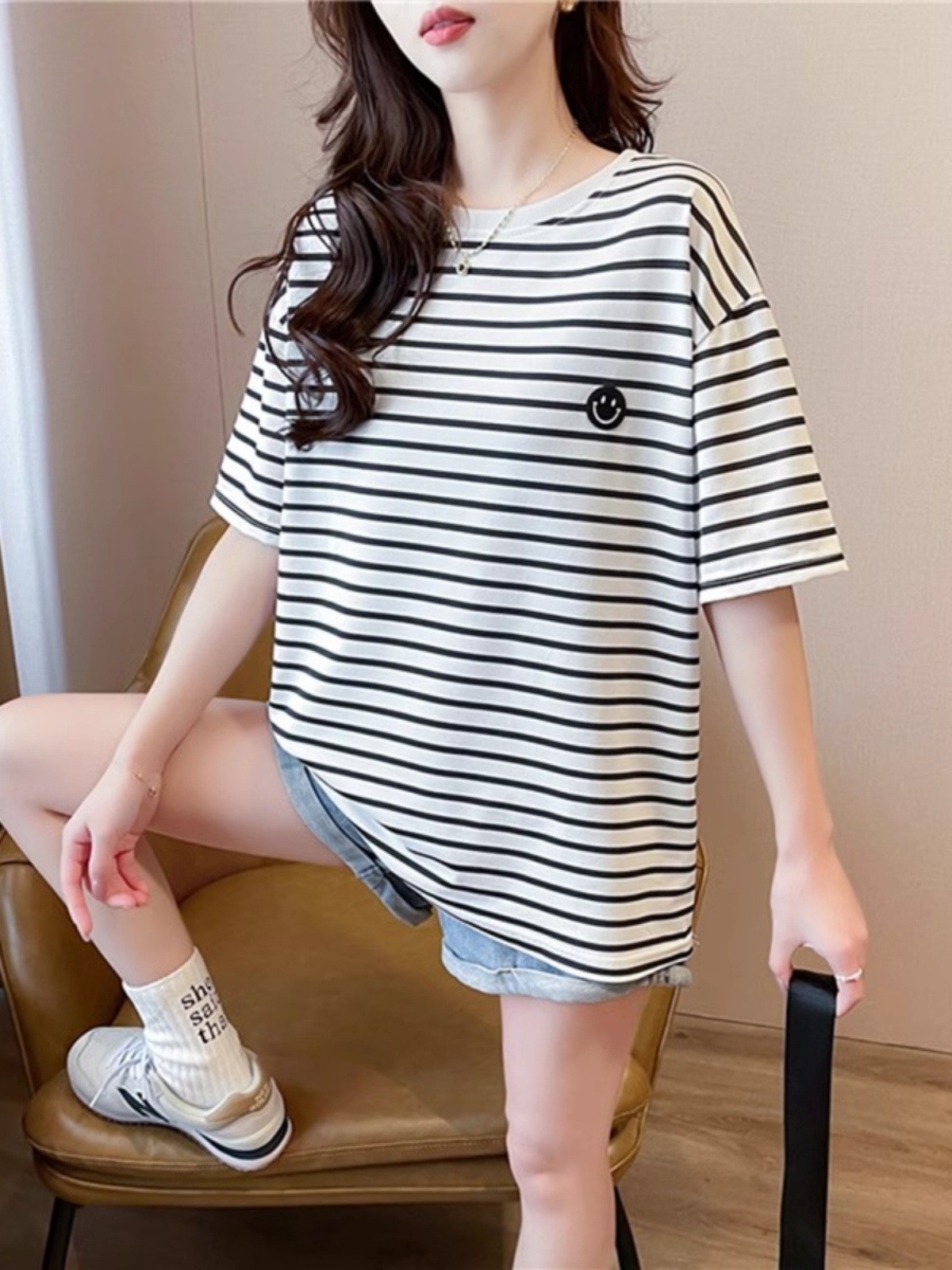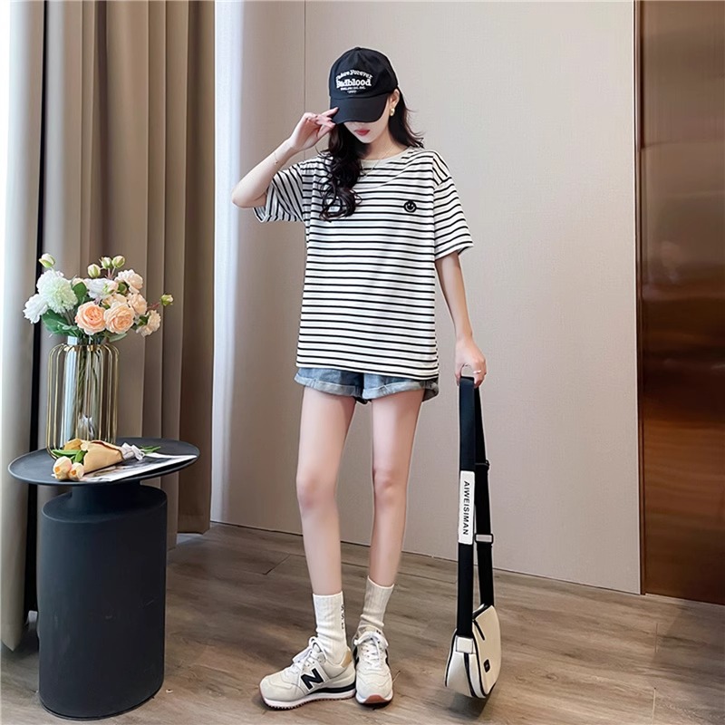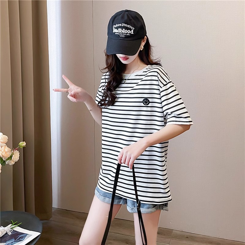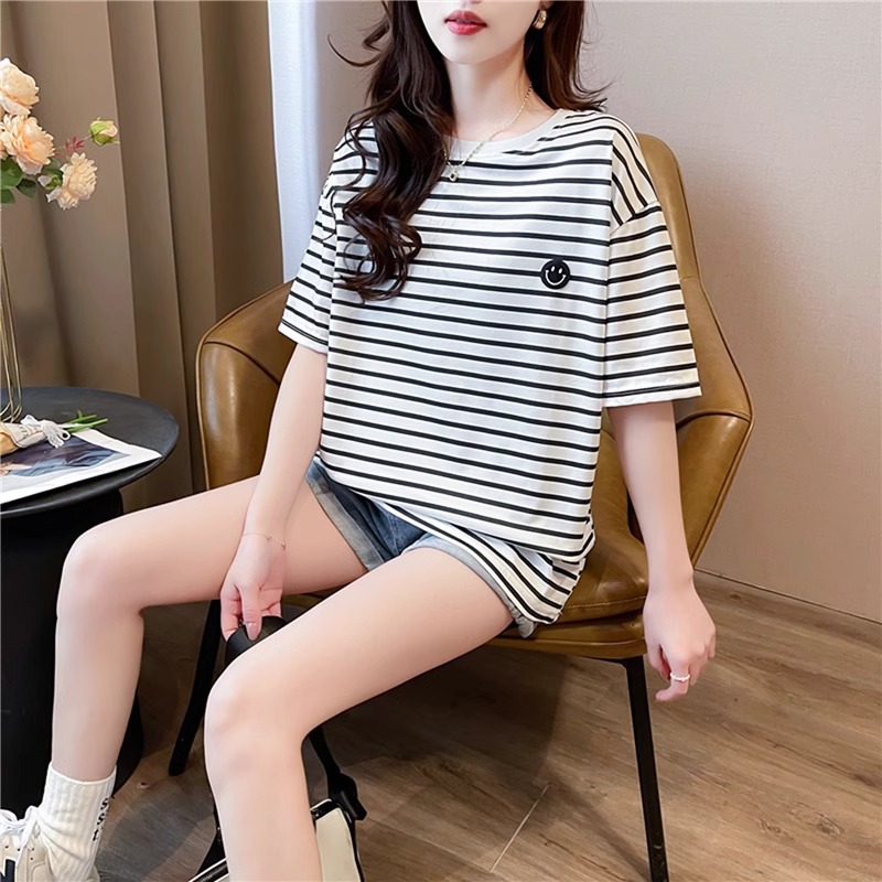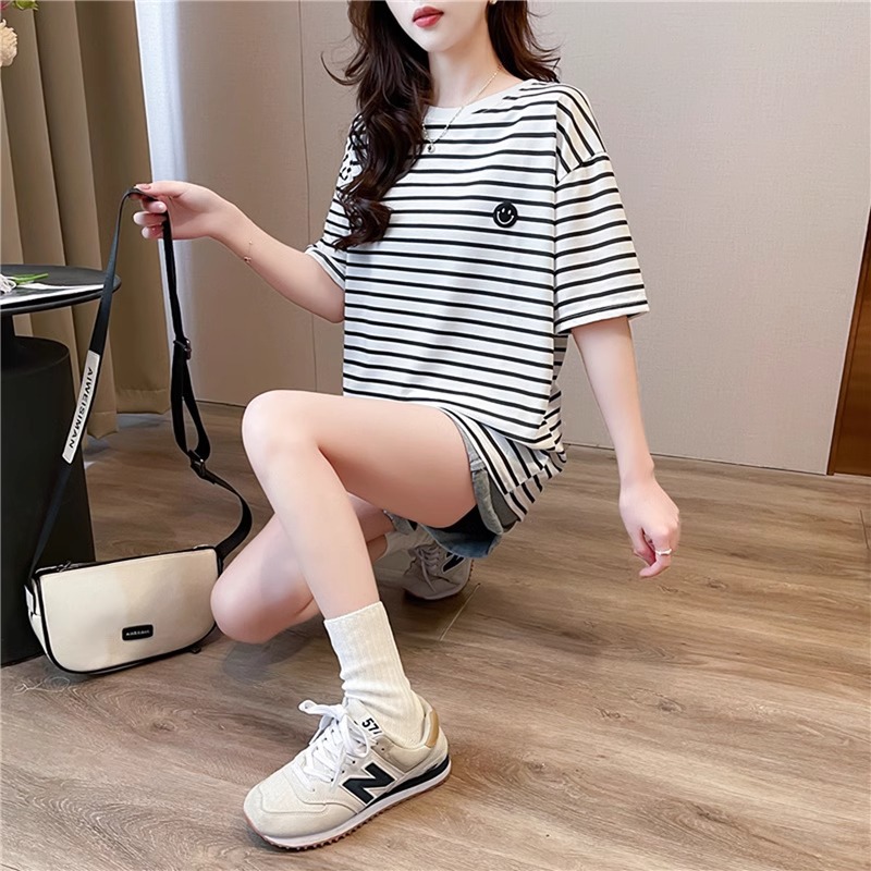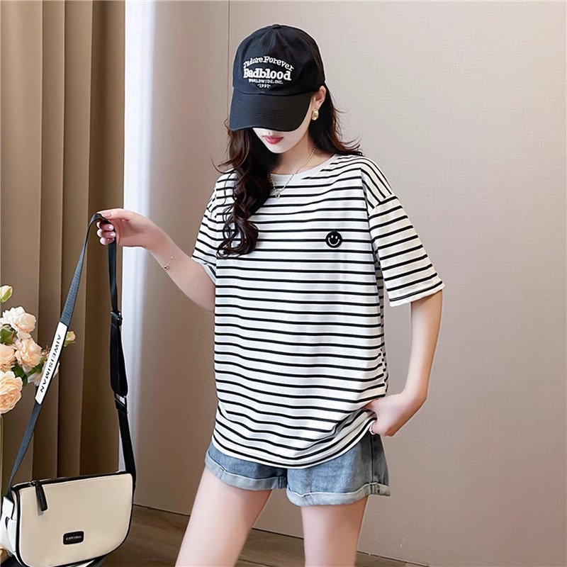 새로운 스트라이프 반팔 티셔츠 여성용 봄 여름 빅사이즈 루즈핏 독특한 디자인 자수 스마일 인스타 트렌드 반팔 상의