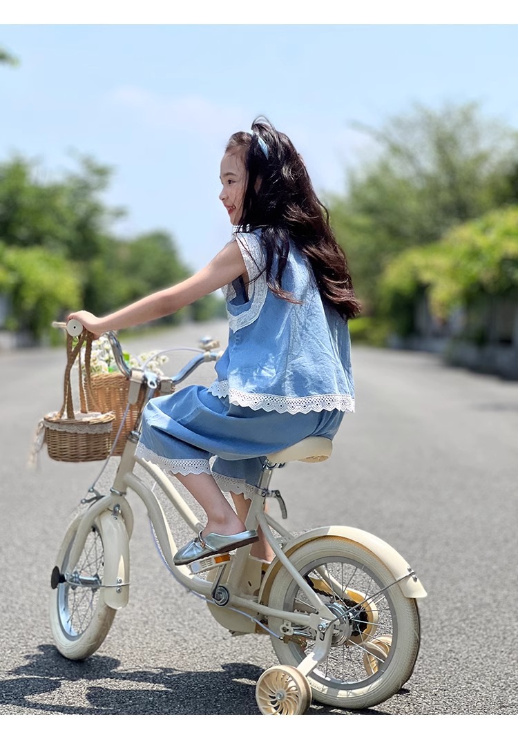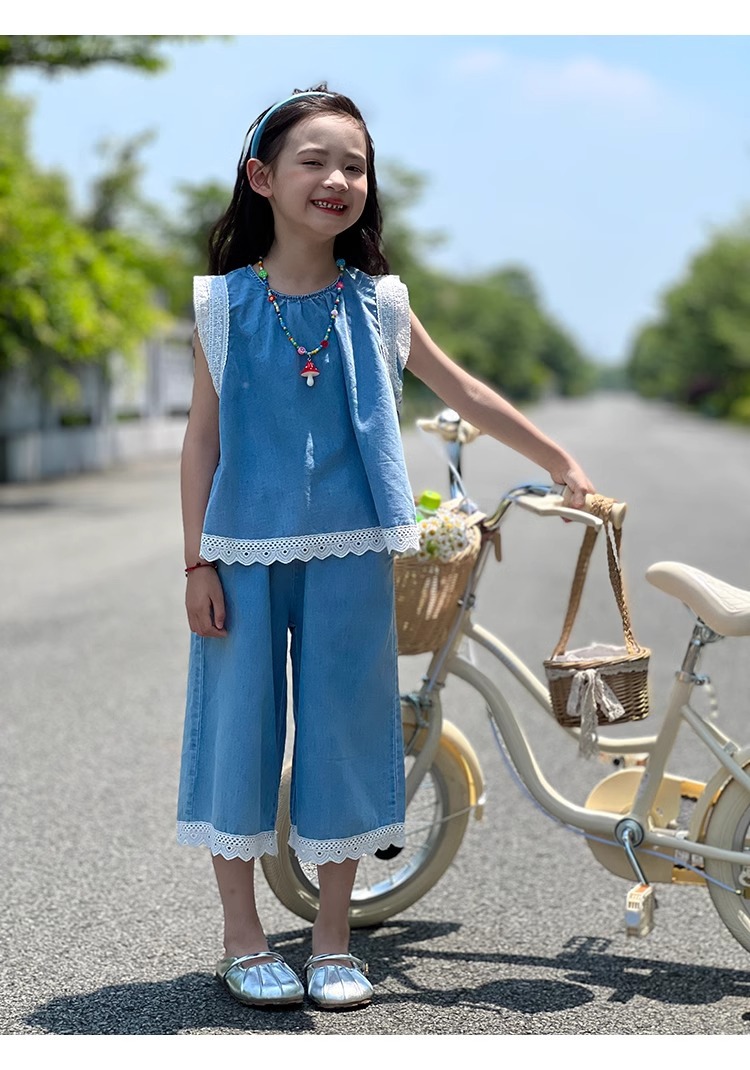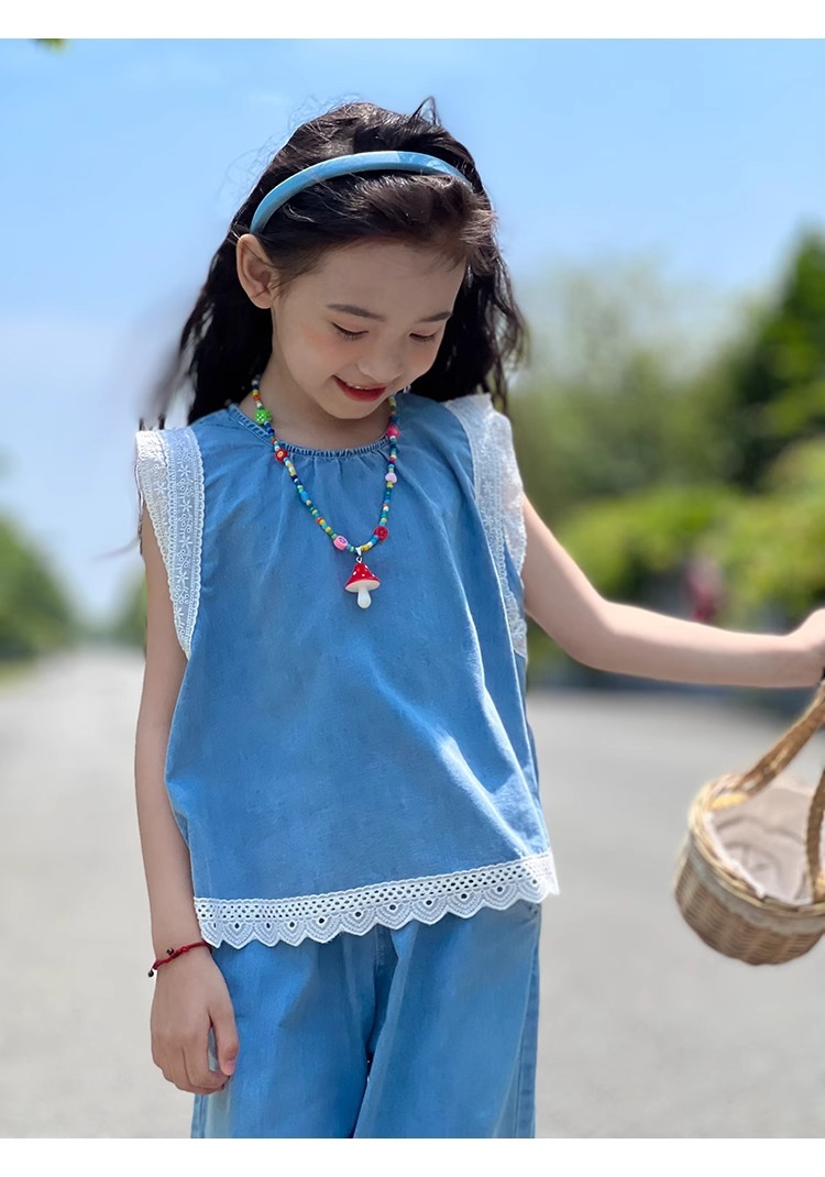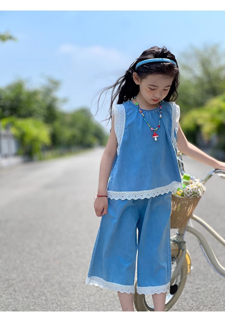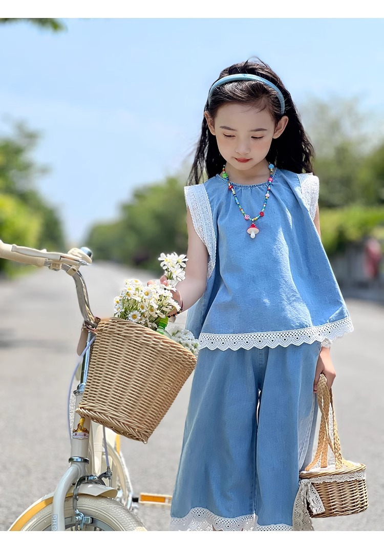 소녀 세트 2024 여름 새로운 어린이 얇은 민소매 레이스 탑 와이드 레그 자른 바지 투피스 여름 원피스스토어 가기