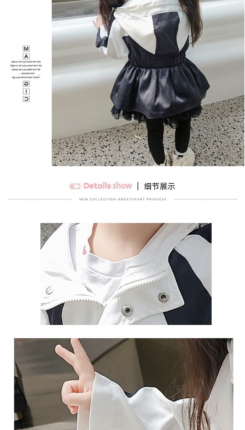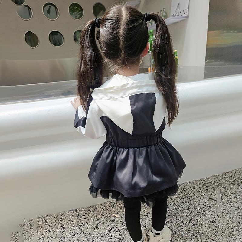 여자 충전 코트 2024 새로운 가을 서양식 메쉬 스티칭 재킷 아기 소녀 어린이 후드 트렌치 코트스토어 가기