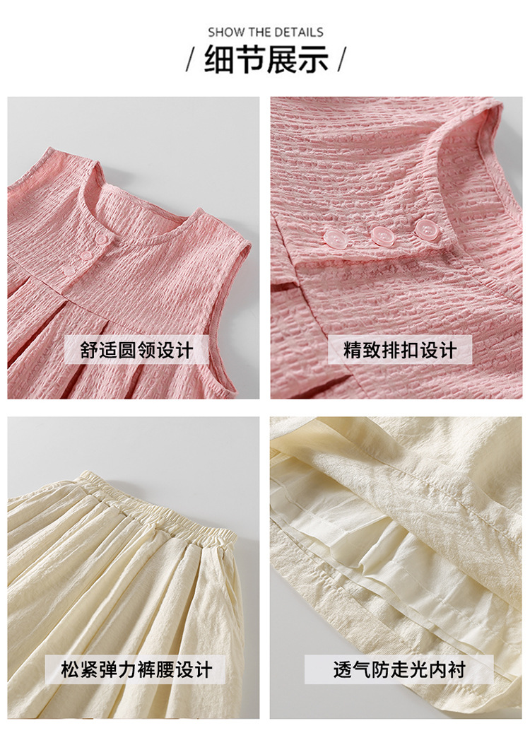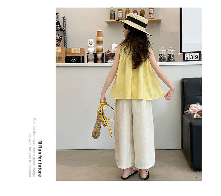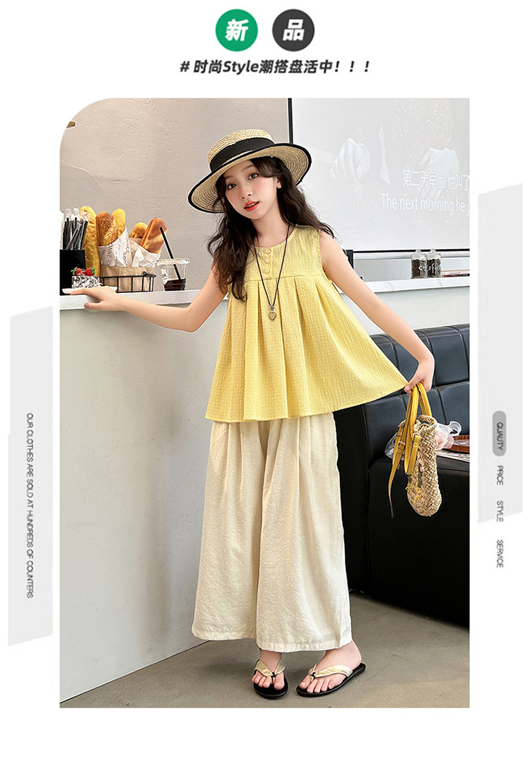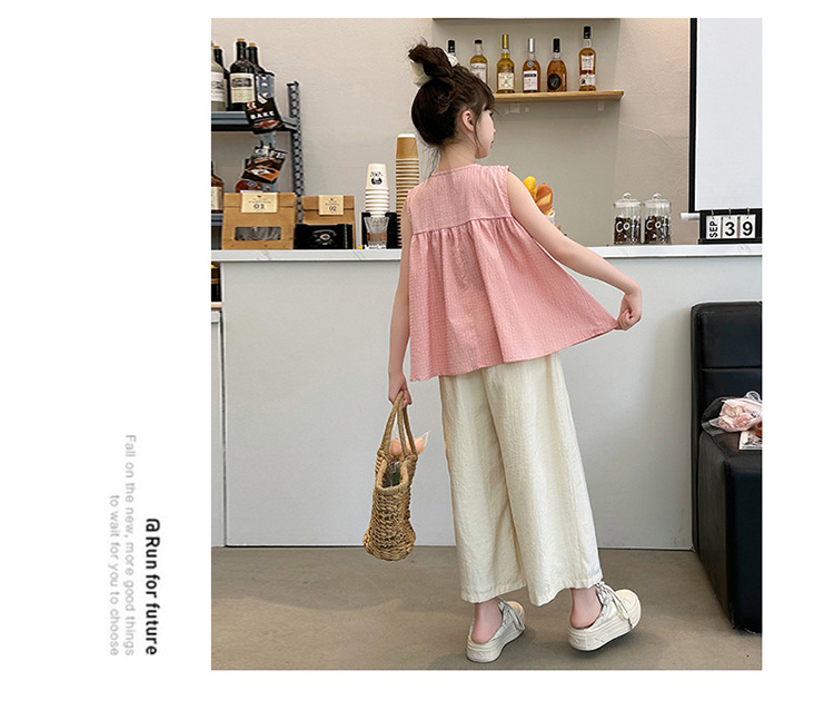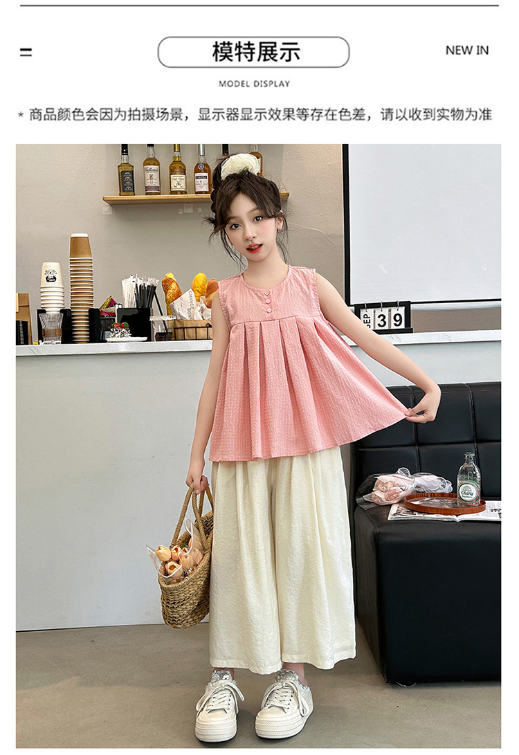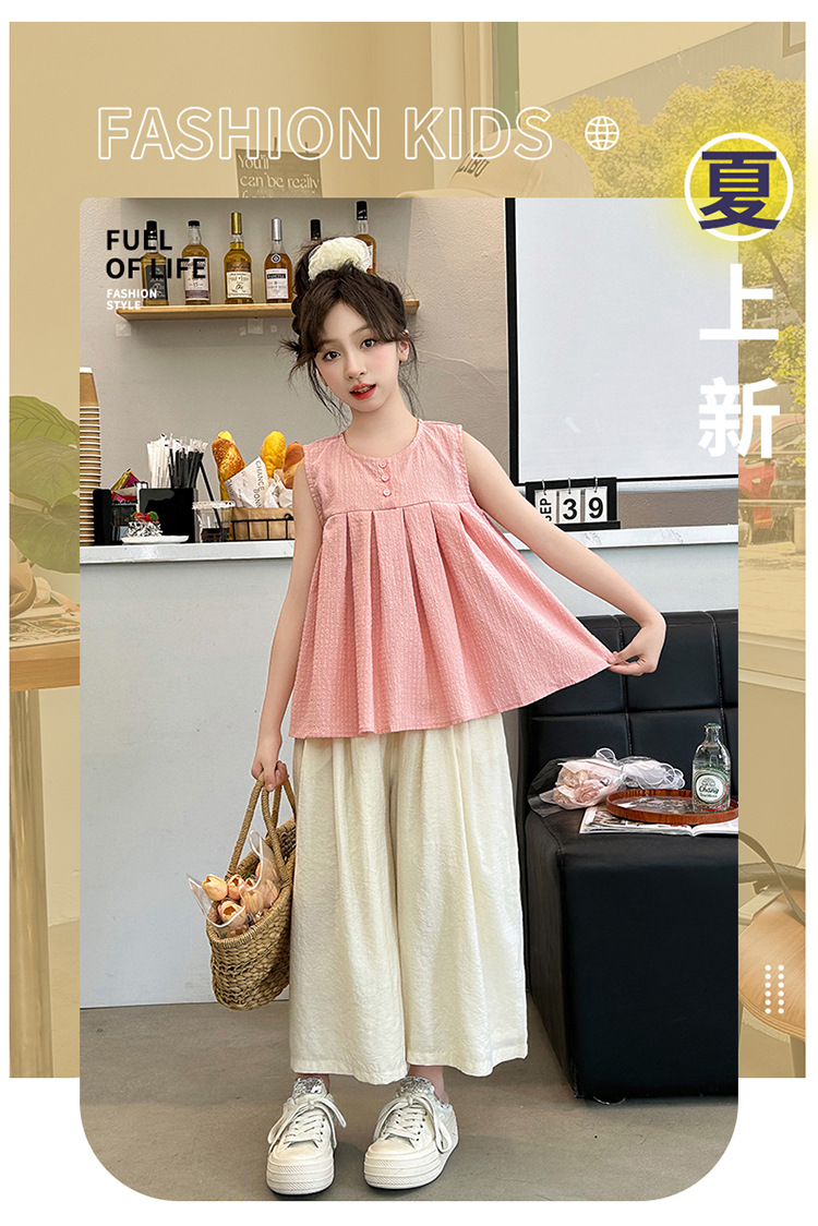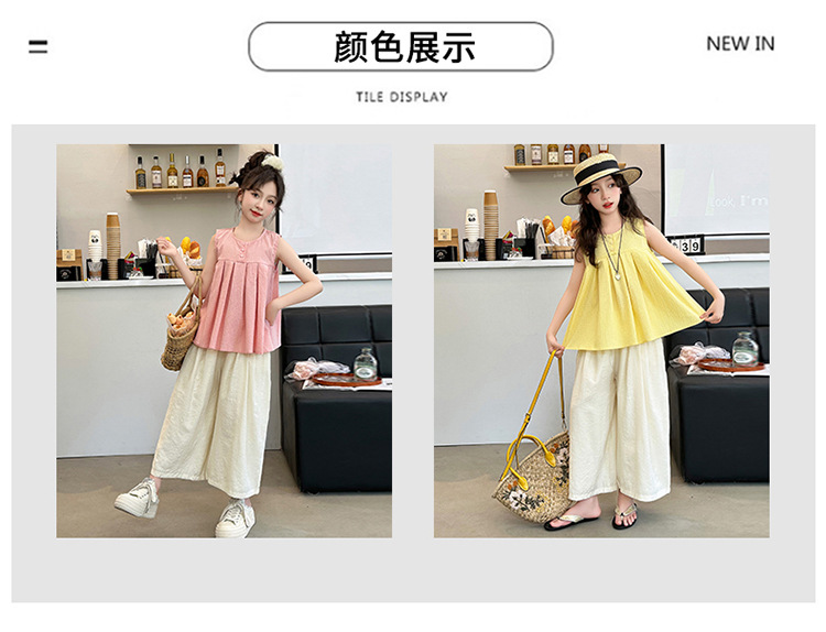 여자 민소매 인형 셔츠 세트 여름 2024 새로운 세련된 어린이 유행 여름 조끼 소녀 넓은 다리 바지스토어 가기